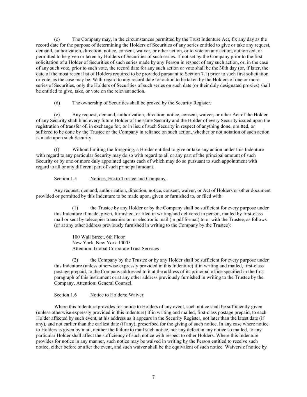 7 (c) The Company may, in the circumstances permitted by the Trust Indenture Act, fix any day as the record date for the purpose of determining the Holders of Securities of any series entitled to give or take any request, demand, authorization, direction, notice, consent, waiver, or other action, or to vote on any action, authorized, or permitted to be given or taken by Holders of Securities of such series. If not set by the Company prior to the first solicitation of a Holder of Securities of such series made by any Person in respect of any such action, or, in the case of any such vote, prior to such vote, the record date for any such action or vote shall be the 30th day (or, if later, the date of the most recent list of Holders required to be provided pursuant to Section 7.1) prior to such first solicitation or vote, as the case may be. With regard to any record date for action to be taken by the Holders of one or more series of Securities, only the Holders of Securities of such series on such date (or their duly designated proxies) shall be entitled to give, take, or vote on the relevant action. (d) The ownership of Securities shall be proved by the Security Register. (e) Any request, demand, authorization, direction, notice, consent, waiver, or other Act of the Holder of any Security shall bind every future Holder of the same Security and the Holder of every Security issued upon the registration of transfer of, in exchange for, or in lieu of such Security in respect of anything done, omitted, or suffered to be done by the Trustee or the Company in reliance on such action, whether or not notation of such action is made upon such Security. (f) Without limiting the foregoing, a Holder entitled to give or take any action under this Indenture with regard to any particular Security may do so with regard to all or any part of the principal amount of such Security or by one or more duly appointed agents each of which may do so pursuant to such appointment with regard to all or any different part of such principal amount. Section 1.5 Notices, Etc.to Trustee and Company. Any request, demand, authorization, direction, notice, consent, waiver, or Act of Holders or other document provided or permitted by this Indenture to be made upon, given or furnished to, or filed with: (1) the Trustee by any Holder or by the Company shall be sufficient for every purpose under this Indenture if made, given, furnished, or filed in writing and delivered in person, mailed by first-class mail or sent by telecopier transmission or electronic mail (in pdf format) to or with the Trustee, as follows (or at any other address previously furnished in writing to the Company by the Trustee): 100 Wall Street, 6th Floor New York, New York 10005 Attention: Global Corporate Trust Services (2) the Company by the Trustee or by any Holder shall be sufficient for every purpose under this Indenture (unless otherwise expressly provided in this Indenture) if in writing and mailed, first-class postage prepaid, to the Company addressed to it at the address of its principal office specified in the first paragraph of this instrument or at any other address previously furnished in writing to the Trustee by the Company, Attention: General Counsel. Section 1.6 Notice to Holders; Waiver. Where this Indenture provides for notice to Holders of any event, such notice shall be sufficiently given (unless otherwise expressly provided in this Indenture) if in writing and mailed, first-class postage prepaid, to each Holder affected by such event, at his address as it appears in the Security Register, not later than the latest date (if any), and not earlier than the earliest date (if any), prescribed for the giving of such notice. In any case where notice to Holders is given by mail, neither the failure to mail such notice, nor any defect in any notice so mailed, to any particular Holder shall affect the sufficiency of such notice with respect to other Holders. Where this Indenture provides for notice in any manner, such notice may be waived in writing by the Person entitled to receive such notice, either before or after the event, and such waiver shall be the equivalent of such notice. Waivers of notice by