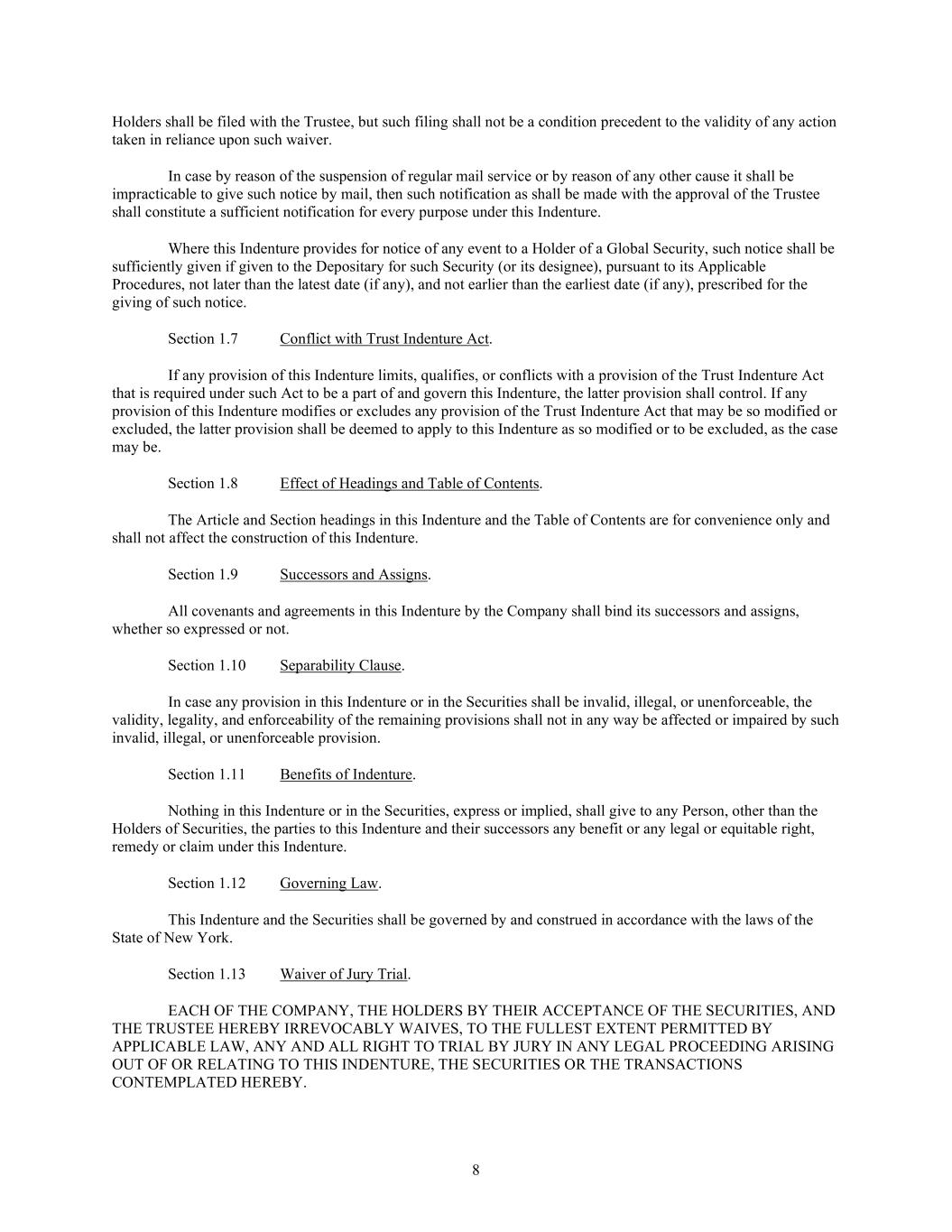 8 Holders shall be filed with the Trustee, but such filing shall not be a condition precedent to the validity of any action taken in reliance upon such waiver. In case by reason of the suspension of regular mail service or by reason of any other cause it shall be impracticable to give such notice by mail, then such notification as shall be made with the approval of the Trustee shall constitute a sufficient notification for every purpose under this Indenture. Where this Indenture provides for notice of any event to a Holder of a Global Security, such notice shall be sufficiently given if given to the Depositary for such Security (or its designee), pursuant to its Applicable Procedures, not later than the latest date (if any), and not earlier than the earliest date (if any), prescribed for the giving of such notice. Section 1.7 Conflict with Trust Indenture Act. If any provision of this Indenture limits, qualifies, or conflicts with a provision of the Trust Indenture Act that is required under such Act to be a part of and govern this Indenture, the latter provision shall control. If any provision of this Indenture modifies or excludes any provision of the Trust Indenture Act that may be so modified or excluded, the latter provision shall be deemed to apply to this Indenture as so modified or to be excluded, as the case may be. Section 1.8 Effect of Headings and Table of Contents. The Article and Section headings in this Indenture and the Table of Contents are for convenience only and shall not affect the construction of this Indenture. Section 1.9 Successors and Assigns. All covenants and agreements in this Indenture by the Company shall bind its successors and assigns, whether so expressed or not. Section 1.10 Separability Clause. In case any provision in this Indenture or in the Securities shall be invalid, illegal, or unenforceable, the validity, legality, and enforceability of the remaining provisions shall not in any way be affected or impaired by such invalid, illegal, or unenforceable provision. Section 1.11 Benefits of Indenture. Nothing in this Indenture or in the Securities, express or implied, shall give to any Person, other than the Holders of Securities, the parties to this Indenture and their successors any benefit or any legal or equitable right, remedy or claim under this Indenture. Section 1.12 Governing Law. This Indenture and the Securities shall be governed by and construed in accordance with the laws of the State of New York. Section 1.13 Waiver of Jury Trial. EACH OF THE COMPANY, THE HOLDERS BY THEIR ACCEPTANCE OF THE SECURITIES, AND THE TRUSTEE HEREBY IRREVOCABLY WAIVES, TO THE FULLEST EXTENT PERMITTED BY APPLICABLE LAW, ANY AND ALL RIGHT TO TRIAL BY JURY IN ANY LEGAL PROCEEDING ARISING OUT OF OR RELATING TO THIS INDENTURE, THE SECURITIES OR THE TRANSACTIONS CONTEMPLATED HEREBY.