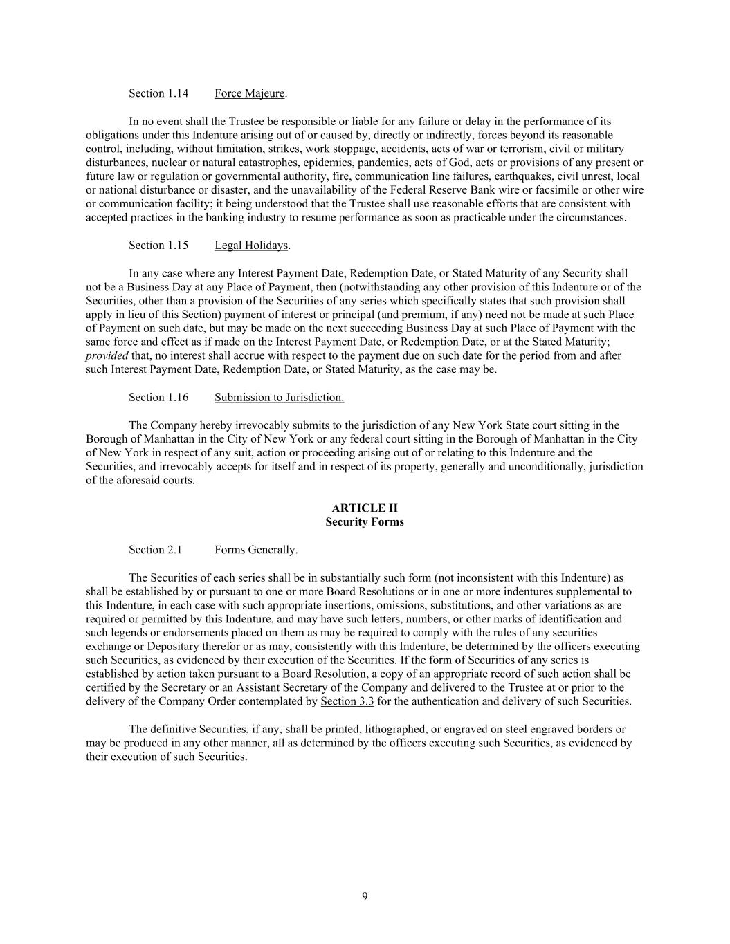 9 Section 1.14 Force Majeure. In no event shall the Trustee be responsible or liable for any failure or delay in the performance of its obligations under this Indenture arising out of or caused by, directly or indirectly, forces beyond its reasonable control, including, without limitation, strikes, work stoppage, accidents, acts of war or terrorism, civil or military disturbances, nuclear or natural catastrophes, epidemics, pandemics, acts of God, acts or provisions of any present or future law or regulation or governmental authority, fire, communication line failures, earthquakes, civil unrest, local or national disturbance or disaster, and the unavailability of the Federal Reserve Bank wire or facsimile or other wire or communication facility; it being understood that the Trustee shall use reasonable efforts that are consistent with accepted practices in the banking industry to resume performance as soon as practicable under the circumstances. Section 1.15 Legal Holidays. In any case where any Interest Payment Date, Redemption Date, or Stated Maturity of any Security shall not be a Business Day at any Place of Payment, then (notwithstanding any other provision of this Indenture or of the Securities, other than a provision of the Securities of any series which specifically states that such provision shall apply in lieu of this Section) payment of interest or principal (and premium, if any) need not be made at such Place of Payment on such date, but may be made on the next succeeding Business Day at such Place of Payment with the same force and effect as if made on the Interest Payment Date, or Redemption Date, or at the Stated Maturity; provided that, no interest shall accrue with respect to the payment due on such date for the period from and after such Interest Payment Date, Redemption Date, or Stated Maturity, as the case may be. Section 1.16 Submission to Jurisdiction. The Company hereby irrevocably submits to the jurisdiction of any New York State court sitting in the Borough of Manhattan in the City of New York or any federal court sitting in the Borough of Manhattan in the City of New York in respect of any suit, action or proceeding arising out of or relating to this Indenture and the Securities, and irrevocably accepts for itself and in respect of its property, generally and unconditionally, jurisdiction of the aforesaid courts. ARTICLE II Security Forms Section 2.1 Forms Generally. The Securities of each series shall be in substantially such form (not inconsistent with this Indenture) as shall be established by or pursuant to one or more Board Resolutions or in one or more indentures supplemental to this Indenture, in each case with such appropriate insertions, omissions, substitutions, and other variations as are required or permitted by this Indenture, and may have such letters, numbers, or other marks of identification and such legends or endorsements placed on them as may be required to comply with the rules of any securities exchange or Depositary therefor or as may, consistently with this Indenture, be determined by the officers executing such Securities, as evidenced by their execution of the Securities. If the form of Securities of any series is established by action taken pursuant to a Board Resolution, a copy of an appropriate record of such action shall be certified by the Secretary or an Assistant Secretary of the Company and delivered to the Trustee at or prior to the delivery of the Company Order contemplated by Section 3.3 for the authentication and delivery of such Securities. The definitive Securities, if any, shall be printed, lithographed, or engraved on steel engraved borders or may be produced in any other manner, all as determined by the officers executing such Securities, as evidenced by their execution of such Securities.