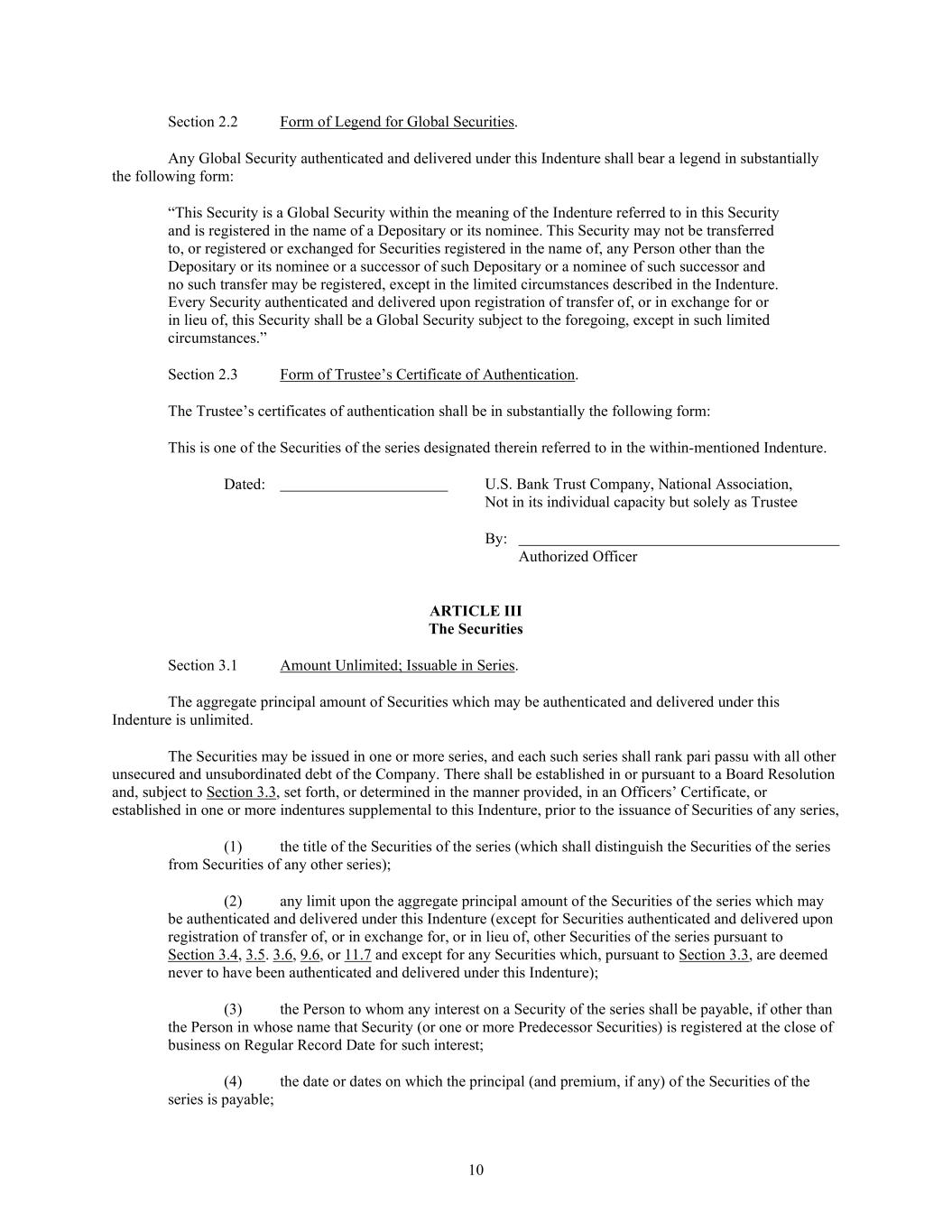 10 Section 2.2 Form of Legend for Global Securities. Any Global Security authenticated and delivered under this Indenture shall bear a legend in substantially the following form: “This Security is a Global Security within the meaning of the Indenture referred to in this Security and is registered in the name of a Depositary or its nominee. This Security may not be transferred to, or registered or exchanged for Securities registered in the name of, any Person other than the Depositary or its nominee or a successor of such Depositary or a nominee of such successor and no such transfer may be registered, except in the limited circumstances described in the Indenture. Every Security authenticated and delivered upon registration of transfer of, or in exchange for or in lieu of, this Security shall be a Global Security subject to the foregoing, except in such limited circumstances.” Section 2.3 Form of Trustee’s Certificate of Authentication. The Trustee’s certificates of authentication shall be in substantially the following form: This is one of the Securities of the series designated therein referred to in the within-mentioned Indenture. Dated: U.S. Bank Trust Company, National Association, Not in its individual capacity but solely as Trustee By: Authorized Officer ARTICLE III The Securities Section 3.1 Amount Unlimited; Issuable in Series. The aggregate principal amount of Securities which may be authenticated and delivered under this Indenture is unlimited. The Securities may be issued in one or more series, and each such series shall rank pari passu with all other unsecured and unsubordinated debt of the Company. There shall be established in or pursuant to a Board Resolution and, subject to Section 3.3, set forth, or determined in the manner provided, in an Officers’ Certificate, or established in one or more indentures supplemental to this Indenture, prior to the issuance of Securities of any series, (1) the title of the Securities of the series (which shall distinguish the Securities of the series from Securities of any other series); (2) any limit upon the aggregate principal amount of the Securities of the series which may be authenticated and delivered under this Indenture (except for Securities authenticated and delivered upon registration of transfer of, or in exchange for, or in lieu of, other Securities of the series pursuant to Section 3.4, 3.5. 3.6, 9.6, or 11.7 and except for any Securities which, pursuant to Section 3.3, are deemed never to have been authenticated and delivered under this Indenture); (3) the Person to whom any interest on a Security of the series shall be payable, if other than the Person in whose name that Security (or one or more Predecessor Securities) is registered at the close of business on Regular Record Date for such interest; (4) the date or dates on which the principal (and premium, if any) of the Securities of the series is payable;