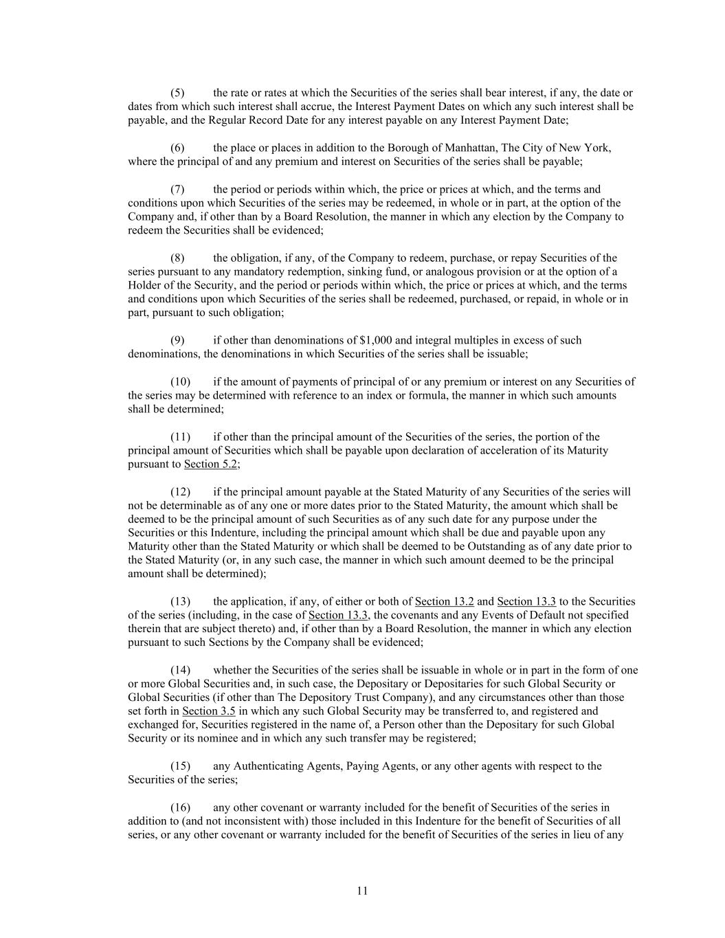 11 (5) the rate or rates at which the Securities of the series shall bear interest, if any, the date or dates from which such interest shall accrue, the Interest Payment Dates on which any such interest shall be payable, and the Regular Record Date for any interest payable on any Interest Payment Date; (6) the place or places in addition to the Borough of Manhattan, The City of New York, where the principal of and any premium and interest on Securities of the series shall be payable; (7) the period or periods within which, the price or prices at which, and the terms and conditions upon which Securities of the series may be redeemed, in whole or in part, at the option of the Company and, if other than by a Board Resolution, the manner in which any election by the Company to redeem the Securities shall be evidenced; (8) the obligation, if any, of the Company to redeem, purchase, or repay Securities of the series pursuant to any mandatory redemption, sinking fund, or analogous provision or at the option of a Holder of the Security, and the period or periods within which, the price or prices at which, and the terms and conditions upon which Securities of the series shall be redeemed, purchased, or repaid, in whole or in part, pursuant to such obligation; (9) if other than denominations of $1,000 and integral multiples in excess of such denominations, the denominations in which Securities of the series shall be issuable; (10) if the amount of payments of principal of or any premium or interest on any Securities of the series may be determined with reference to an index or formula, the manner in which such amounts shall be determined; (11) if other than the principal amount of the Securities of the series, the portion of the principal amount of Securities which shall be payable upon declaration of acceleration of its Maturity pursuant to Section 5.2; (12) if the principal amount payable at the Stated Maturity of any Securities of the series will not be determinable as of any one or more dates prior to the Stated Maturity, the amount which shall be deemed to be the principal amount of such Securities as of any such date for any purpose under the Securities or this Indenture, including the principal amount which shall be due and payable upon any Maturity other than the Stated Maturity or which shall be deemed to be Outstanding as of any date prior to the Stated Maturity (or, in any such case, the manner in which such amount deemed to be the principal amount shall be determined); (13) the application, if any, of either or both of Section 13.2 and Section 13.3 to the Securities of the series (including, in the case of Section 13.3, the covenants and any Events of Default not specified therein that are subject thereto) and, if other than by a Board Resolution, the manner in which any election pursuant to such Sections by the Company shall be evidenced; (14) whether the Securities of the series shall be issuable in whole or in part in the form of one or more Global Securities and, in such case, the Depositary or Depositaries for such Global Security or Global Securities (if other than The Depository Trust Company), and any circumstances other than those set forth in Section 3.5 in which any such Global Security may be transferred to, and registered and exchanged for, Securities registered in the name of, a Person other than the Depositary for such Global Security or its nominee and in which any such transfer may be registered; (15) any Authenticating Agents, Paying Agents, or any other agents with respect to the Securities of the series; (16) any other covenant or warranty included for the benefit of Securities of the series in addition to (and not inconsistent with) those included in this Indenture for the benefit of Securities of all series, or any other covenant or warranty included for the benefit of Securities of the series in lieu of any