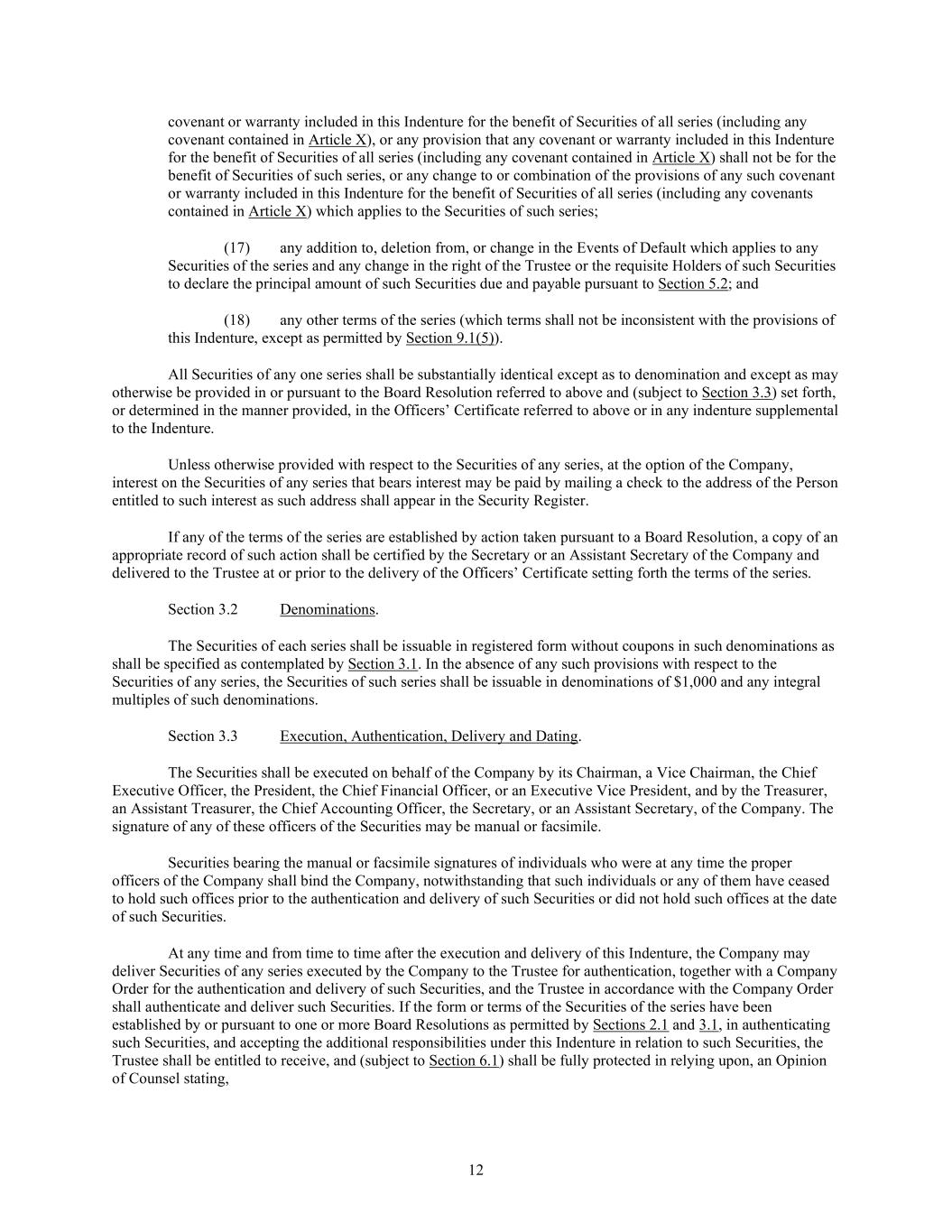 12 covenant or warranty included in this Indenture for the benefit of Securities of all series (including any covenant contained in Article X), or any provision that any covenant or warranty included in this Indenture for the benefit of Securities of all series (including any covenant contained in Article X) shall not be for the benefit of Securities of such series, or any change to or combination of the provisions of any such covenant or warranty included in this Indenture for the benefit of Securities of all series (including any covenants contained in Article X) which applies to the Securities of such series; (17) any addition to, deletion from, or change in the Events of Default which applies to any Securities of the series and any change in the right of the Trustee or the requisite Holders of such Securities to declare the principal amount of such Securities due and payable pursuant to Section 5.2; and (18) any other terms of the series (which terms shall not be inconsistent with the provisions of this Indenture, except as permitted by Section 9.1(5)). All Securities of any one series shall be substantially identical except as to denomination and except as may otherwise be provided in or pursuant to the Board Resolution referred to above and (subject to Section 3.3) set forth, or determined in the manner provided, in the Officers’ Certificate referred to above or in any indenture supplemental to the Indenture. Unless otherwise provided with respect to the Securities of any series, at the option of the Company, interest on the Securities of any series that bears interest may be paid by mailing a check to the address of the Person entitled to such interest as such address shall appear in the Security Register. If any of the terms of the series are established by action taken pursuant to a Board Resolution, a copy of an appropriate record of such action shall be certified by the Secretary or an Assistant Secretary of the Company and delivered to the Trustee at or prior to the delivery of the Officers’ Certificate setting forth the terms of the series. Section 3.2 Denominations. The Securities of each series shall be issuable in registered form without coupons in such denominations as shall be specified as contemplated by Section 3.1. In the absence of any such provisions with respect to the Securities of any series, the Securities of such series shall be issuable in denominations of $1,000 and any integral multiples of such denominations. Section 3.3 Execution, Authentication, Delivery and Dating. The Securities shall be executed on behalf of the Company by its Chairman, a Vice Chairman, the Chief Executive Officer, the President, the Chief Financial Officer, or an Executive Vice President, and by the Treasurer, an Assistant Treasurer, the Chief Accounting Officer, the Secretary, or an Assistant Secretary, of the Company. The signature of any of these officers of the Securities may be manual or facsimile. Securities bearing the manual or facsimile signatures of individuals who were at any time the proper officers of the Company shall bind the Company, notwithstanding that such individuals or any of them have ceased to hold such offices prior to the authentication and delivery of such Securities or did not hold such offices at the date of such Securities. At any time and from time to time after the execution and delivery of this Indenture, the Company may deliver Securities of any series executed by the Company to the Trustee for authentication, together with a Company Order for the authentication and delivery of such Securities, and the Trustee in accordance with the Company Order shall authenticate and deliver such Securities. If the form or terms of the Securities of the series have been established by or pursuant to one or more Board Resolutions as permitted by Sections 2.1 and 3.1, in authenticating such Securities, and accepting the additional responsibilities under this Indenture in relation to such Securities, the Trustee shall be entitled to receive, and (subject to Section 6.1) shall be fully protected in relying upon, an Opinion of Counsel stating,