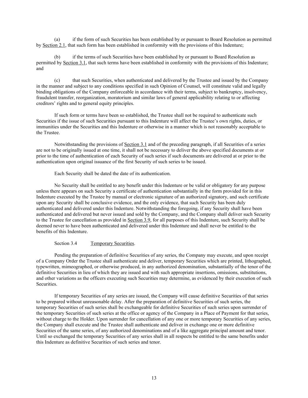 13 (a) if the form of such Securities has been established by or pursuant to Board Resolution as permitted by Section 2.1, that such form has been established in conformity with the provisions of this Indenture; (b) if the terms of such Securities have been established by or pursuant to Board Resolution as permitted by Section 3.1, that such terms have been established in conformity with the provisions of this Indenture; and (c) that such Securities, when authenticated and delivered by the Trustee and issued by the Company in the manner and subject to any conditions specified in such Opinion of Counsel, will constitute valid and legally binding obligations of the Company enforceable in accordance with their terms, subject to bankruptcy, insolvency, fraudulent transfer, reorganization, moratorium and similar laws of general applicability relating to or affecting creditors’ rights and to general equity principles. If such form or terms have been so established, the Trustee shall not be required to authenticate such Securities if the issue of such Securities pursuant to this Indenture will affect the Trustee’s own rights, duties, or immunities under the Securities and this Indenture or otherwise in a manner which is not reasonably acceptable to the Trustee. Notwithstanding the provisions of Section 3.1 and of the preceding paragraph, if all Securities of a series are not to be originally issued at one time, it shall not be necessary to deliver the above specified documents at or prior to the time of authentication of each Security of such series if such documents are delivered at or prior to the authentication upon original issuance of the first Security of such series to be issued. Each Security shall be dated the date of its authentication. No Security shall be entitled to any benefit under this Indenture or be valid or obligatory for any purpose unless there appears on such Security a certificate of authentication substantially in the form provided for in this Indenture executed by the Trustee by manual or electronic signature of an authorized signatory, and such certificate upon any Security shall be conclusive evidence, and the only evidence, that such Security has been duly authenticated and delivered under this Indenture. Notwithstanding the foregoing, if any Security shall have been authenticated and delivered but never issued and sold by the Company, and the Company shall deliver such Security to the Trustee for cancellation as provided in Section 3.9, for all purposes of this Indenture, such Security shall be deemed never to have been authenticated and delivered under this Indenture and shall never be entitled to the benefits of this Indenture. Section 3.4 Temporary Securities. Pending the preparation of definitive Securities of any series, the Company may execute, and upon receipt of a Company Order the Trustee shall authenticate and deliver, temporary Securities which are printed, lithographed, typewritten, mimeographed, or otherwise produced, in any authorized denomination, substantially of the tenor of the definitive Securities in lieu of which they are issued and with such appropriate insertions, omissions, substitutions, and other variations as the officers executing such Securities may determine, as evidenced by their execution of such Securities. If temporary Securities of any series are issued, the Company will cause definitive Securities of that series to be prepared without unreasonable delay. After the preparation of definitive Securities of such series, the temporary Securities of such series shall be exchangeable for definitive Securities of such series upon surrender of the temporary Securities of such series at the office or agency of the Company in a Place of Payment for that series, without charge to the Holder. Upon surrender for cancellation of any one or more temporary Securities of any series, the Company shall execute and the Trustee shall authenticate and deliver in exchange one or more definitive Securities of the same series, of any authorized denominations and of a like aggregate principal amount and tenor. Until so exchanged the temporary Securities of any series shall in all respects be entitled to the same benefits under this Indenture as definitive Securities of such series and tenor.
