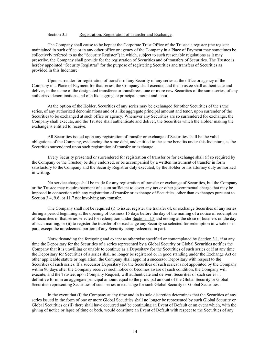 14 Section 3.5 Registration, Registration of Transfer and Exchange. The Company shall cause to be kept at the Corporate Trust Office of the Trustee a register (the register maintained in such office or in any other office or agency of the Company in a Place of Payment may sometimes be collectively referred to as the “Security Register”) in which, subject to such reasonable regulations as it may prescribe, the Company shall provide for the registration of Securities and of transfers of Securities. The Trustee is hereby appointed “Security Registrar” for the purpose of registering Securities and transfers of Securities as provided in this Indenture. Upon surrender for registration of transfer of any Security of any series at the office or agency of the Company in a Place of Payment for that series, the Company shall execute, and the Trustee shall authenticate and deliver, in the name of the designated transferee or transferees, one or more new Securities of the same series, of any authorized denominations and of a like aggregate principal amount and tenor. At the option of the Holder, Securities of any series may be exchanged for other Securities of the same series, of any authorized denominations and of a like aggregate principal amount and tenor, upon surrender of the Securities to be exchanged at such office or agency. Whenever any Securities are so surrendered for exchange, the Company shall execute, and the Trustee shall authenticate and deliver, the Securities which the Holder making the exchange is entitled to receive. All Securities issued upon any registration of transfer or exchange of Securities shall be the valid obligations of the Company, evidencing the same debt, and entitled to the same benefits under this Indenture, as the Securities surrendered upon such registration of transfer or exchange. Every Security presented or surrendered for registration of transfer or for exchange shall (if so required by the Company or the Trustee) be duly endorsed, or be accompanied by a written instrument of transfer in form satisfactory to the Company and the Security Registrar duly executed, by the Holder or his attorney duly authorized in writing. No service charge shall be made for any registration of transfer or exchange of Securities, but the Company or the Trustee may require payment of a sum sufficient to cover any tax or other governmental charge that may be imposed in connection with any registration of transfer or exchange of Securities, other than exchanges pursuant to Section 3.4, 9.6, or 11.7 not involving any transfer. The Company shall not be required (i) to issue, register the transfer of, or exchange Securities of any series during a period beginning at the opening of business 15 days before the day of the mailing of a notice of redemption of Securities of that series selected for redemption under Section 11.3 and ending at the close of business on the day of such mailing, or (ii) to register the transfer of or exchange any Security so selected for redemption in whole or in part, except the unredeemed portion of any Security being redeemed in part. Notwithstanding the foregoing and except as otherwise specified or contemplated by Section 3.1, if at any time the Depositary for the Securities of a series represented by a Global Security or Global Securities notifies the Company that it is unwilling or unable to continue as a Depositary for the Securities of such series or if at any time the Depositary for Securities of a series shall no longer be registered or in good standing under the Exchange Act or other applicable statute or regulation, the Company shall appoint a successor Depositary with respect to the Securities of such series. If a successor Depositary for the Securities of such series is not appointed by the Company within 90 days after the Company receives such notice or becomes aware of such condition, the Company will execute, and the Trustee, upon Company Request, will authenticate and deliver, Securities of such series in definitive form in an aggregate principal amount equal to the principal amount of the Global Security or Global Securities representing Securities of such series in exchange for such Global Security or Global Securities. In the event that (i) the Company at any time and in its sole discretion determines that the Securities of any series issued in the form of one or more Global Securities shall no longer be represented by such Global Security or Global Securities or (ii) there shall have occurred and be continuing an Event of Default or an event which, with the giving of notice or lapse of time or both, would constitute an Event of Default with respect to the Securities of any