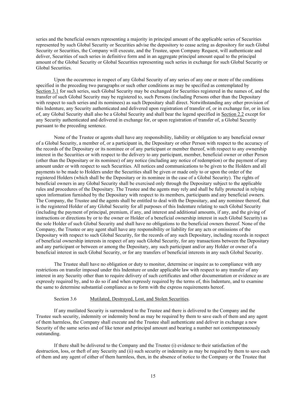 15 series and the beneficial owners representing a majority in principal amount of the applicable series of Securities represented by such Global Security or Securities advise the depository to cease acting as depository for such Global Security or Securities, the Company will execute, and the Trustee, upon Company Request, will authenticate and deliver, Securities of such series in definitive form and in an aggregate principal amount equal to the principal amount of the Global Security or Global Securities representing such series in exchange for such Global Security or Global Securities. Upon the occurrence in respect of any Global Security of any series of any one or more of the conditions specified in the preceding two paragraphs or such other conditions as may be specified as contemplated by Section 3.1 for such series, such Global Security may be exchanged for Securities registered in the names of, and the transfer of such Global Security may be registered to, such Persons (including Persons other than the Depositary with respect to such series and its nominees) as such Depositary shall direct. Notwithstanding any other provision of this Indenture, any Security authenticated and delivered upon registration of transfer of, or in exchange for, or in lieu of, any Global Security shall also be a Global Security and shall bear the legend specified in Section 2.2 except for any Security authenticated and delivered in exchange for, or upon registration of transfer of, a Global Security pursuant to the preceding sentence. None of the Trustee or agents shall have any responsibility, liability or obligation to any beneficial owner of a Global Security, a member of, or a participant in, the Depositary or other Person with respect to the accuracy of the records of the Depositary or its nominee or of any participant or member thereof, with respect to any ownership interest in the Securities or with respect to the delivery to any participant, member, beneficial owner or other Person (other than the Depositary or its nominee) of any notice (including any notice of redemption) or the payment of any amount under or with respect to such Securities. All notices and communications to be given to the Holders and all payments to be made to Holders under the Securities shall be given or made only to or upon the order of the registered Holders (which shall be the Depositary or its nominee in the case of a Global Security). The rights of beneficial owners in any Global Security shall be exercised only through the Depositary subject to the applicable rules and procedures of the Depositary. The Trustee and the agents may rely and shall be fully protected in relying upon information furnished by the Depositary with respect to its members, participants and any beneficial owners. The Company, the Trustee and the agents shall be entitled to deal with the Depositary, and any nominee thereof, that is the registered Holder of any Global Security for all purposes of this Indenture relating to such Global Security (including the payment of principal, premium, if any, and interest and additional amounts, if any, and the giving of instructions or directions by or to the owner or Holder of a beneficial ownership interest in such Global Security) as the sole Holder of such Global Security and shall have no obligations to the beneficial owners thereof. None of the Company, the Trustee or any agent shall have any responsibility or liability for any acts or omissions of the Depositary with respect to such Global Security, for the records of any such Depositary, including records in respect of beneficial ownership interests in respect of any such Global Security, for any transactions between the Depositary and any participant or between or among the Depositary, any such participant and/or any Holder or owner of a beneficial interest in such Global Security, or for any transfers of beneficial interests in any such Global Security. The Trustee shall have no obligation or duty to monitor, determine or inquire as to compliance with any restrictions on transfer imposed under this Indenture or under applicable law with respect to any transfer of any interest in any Security other than to require delivery of such certificates and other documentation or evidence as are expressly required by, and to do so if and when expressly required by the terms of, this Indenture, and to examine the same to determine substantial compliance as to form with the express requirements hereof. Section 3.6 Mutilated, Destroyed, Lost, and Stolen Securities. If any mutilated Security is surrendered to the Trustee and there is delivered to the Company and the Trustee such security, indemnity or indemnity bond as may be required by them to save each of them and any agent of them harmless, the Company shall execute and the Trustee shall authenticate and deliver in exchange a new Security of the same series and of like tenor and principal amount and bearing a number not contemporaneously outstanding. If there shall be delivered to the Company and the Trustee (i) evidence to their satisfaction of the destruction, loss, or theft of any Security and (ii) such security or indemnity as may be required by them to save each of them and any agent of either of them harmless, then, in the absence of notice to the Company or the Trustee that