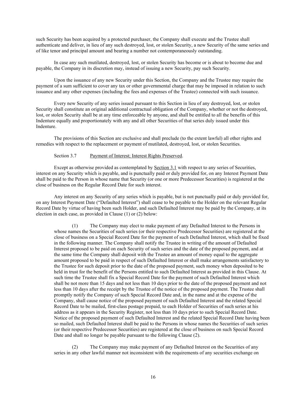 16 such Security has been acquired by a protected purchaser, the Company shall execute and the Trustee shall authenticate and deliver, in lieu of any such destroyed, lost, or stolen Security, a new Security of the same series and of like tenor and principal amount and bearing a number not contemporaneously outstanding. In case any such mutilated, destroyed, lost, or stolen Security has become or is about to become due and payable, the Company in its discretion may, instead of issuing a new Security, pay such Security. Upon the issuance of any new Security under this Section, the Company and the Trustee may require the payment of a sum sufficient to cover any tax or other governmental charge that may be imposed in relation to such issuance and any other expenses (including the fees and expenses of the Trustee) connected with such issuance. Every new Security of any series issued pursuant to this Section in lieu of any destroyed, lost, or stolen Security shall constitute an original additional contractual obligation of the Company, whether or not the destroyed, lost, or stolen Security shall be at any time enforceable by anyone, and shall be entitled to all the benefits of this Indenture equally and proportionately with any and all other Securities of that series duly issued under this Indenture. The provisions of this Section are exclusive and shall preclude (to the extent lawful) all other rights and remedies with respect to the replacement or payment of mutilated, destroyed, lost, or stolen Securities. Section 3.7 Payment of Interest; Interest Rights Preserved. Except as otherwise provided as contemplated by Section 3.1 with respect to any series of Securities, interest on any Security which is payable, and is punctually paid or duly provided for, on any Interest Payment Date shall be paid to the Person in whose name that Security (or one or more Predecessor Securities) is registered at the close of business on the Regular Record Date for such interest. Any interest on any Security of any series which is payable, but is not punctually paid or duly provided for, on any Interest Payment Date (“Defaulted Interest”) shall cease to be payable to the Holder on the relevant Regular Record Date by virtue of having been such Holder, and such Defaulted Interest may be paid by the Company, at its election in each case, as provided in Clause (1) or (2) below: (1) The Company may elect to make payment of any Defaulted Interest to the Persons in whose names the Securities of such series (or their respective Predecessor Securities) are registered at the close of business on a Special Record Date for the payment of such Defaulted Interest, which shall be fixed in the following manner. The Company shall notify the Trustee in writing of the amount of Defaulted Interest proposed to be paid on each Security of such series and the date of the proposed payment, and at the same time the Company shall deposit with the Trustee an amount of money equal to the aggregate amount proposed to be paid in respect of such Defaulted Interest or shall make arrangements satisfactory to the Trustee for such deposit prior to the date of the proposed payment, such money when deposited to be held in trust for the benefit of the Persons entitled to such Defaulted Interest as provided in this Clause. At such time the Trustee shall fix a Special Record Date for the payment of such Defaulted Interest which shall be not more than 15 days and not less than 10 days prior to the date of the proposed payment and not less than 10 days after the receipt by the Trustee of the notice of the proposed payment. The Trustee shall promptly notify the Company of such Special Record Date and, in the name and at the expense of the Company, shall cause notice of the proposed payment of such Defaulted Interest and the related Special Record Date to be mailed, first-class postage prepaid, to each Holder of Securities of such series at his address as it appears in the Security Register, not less than 10 days prior to such Special Record Date. Notice of the proposed payment of such Defaulted Interest and the related Special Record Date having been so mailed, such Defaulted Interest shall be paid to the Persons in whose names the Securities of such series (or their respective Predecessor Securities) are registered at the close of business on such Special Record Date and shall no longer be payable pursuant to the following Clause (2). (2) The Company may make payment of any Defaulted Interest on the Securities of any series in any other lawful manner not inconsistent with the requirements of any securities exchange on