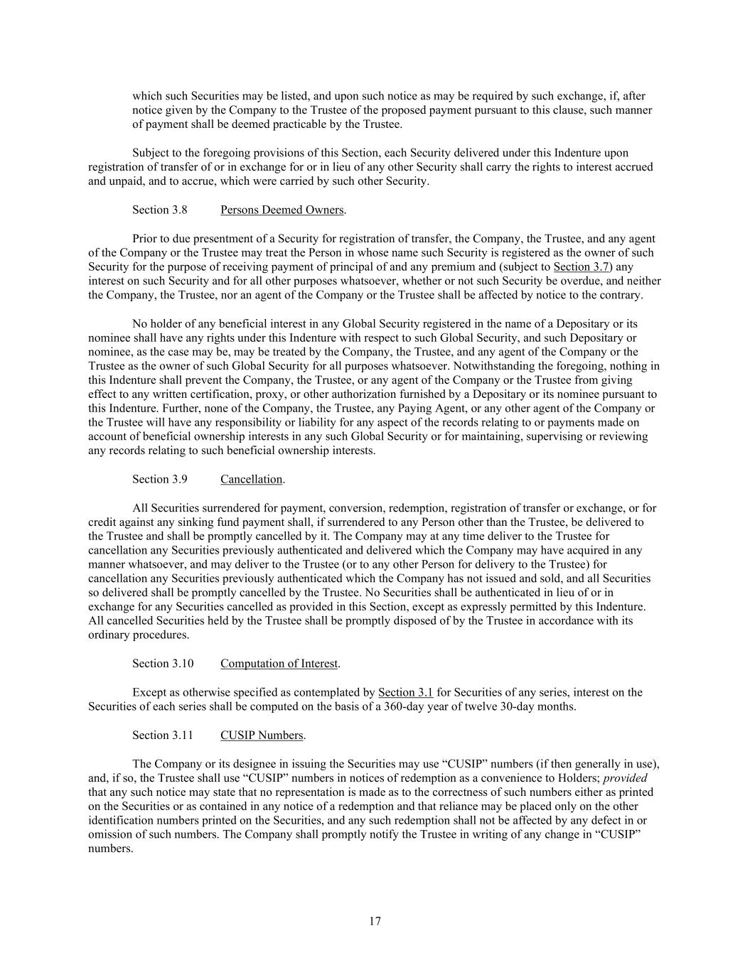 17 which such Securities may be listed, and upon such notice as may be required by such exchange, if, after notice given by the Company to the Trustee of the proposed payment pursuant to this clause, such manner of payment shall be deemed practicable by the Trustee. Subject to the foregoing provisions of this Section, each Security delivered under this Indenture upon registration of transfer of or in exchange for or in lieu of any other Security shall carry the rights to interest accrued and unpaid, and to accrue, which were carried by such other Security. Section 3.8 Persons Deemed Owners. Prior to due presentment of a Security for registration of transfer, the Company, the Trustee, and any agent of the Company or the Trustee may treat the Person in whose name such Security is registered as the owner of such Security for the purpose of receiving payment of principal of and any premium and (subject to Section 3.7) any interest on such Security and for all other purposes whatsoever, whether or not such Security be overdue, and neither the Company, the Trustee, nor an agent of the Company or the Trustee shall be affected by notice to the contrary. No holder of any beneficial interest in any Global Security registered in the name of a Depositary or its nominee shall have any rights under this Indenture with respect to such Global Security, and such Depositary or nominee, as the case may be, may be treated by the Company, the Trustee, and any agent of the Company or the Trustee as the owner of such Global Security for all purposes whatsoever. Notwithstanding the foregoing, nothing in this Indenture shall prevent the Company, the Trustee, or any agent of the Company or the Trustee from giving effect to any written certification, proxy, or other authorization furnished by a Depositary or its nominee pursuant to this Indenture. Further, none of the Company, the Trustee, any Paying Agent, or any other agent of the Company or the Trustee will have any responsibility or liability for any aspect of the records relating to or payments made on account of beneficial ownership interests in any such Global Security or for maintaining, supervising or reviewing any records relating to such beneficial ownership interests. Section 3.9 Cancellation. All Securities surrendered for payment, conversion, redemption, registration of transfer or exchange, or for credit against any sinking fund payment shall, if surrendered to any Person other than the Trustee, be delivered to the Trustee and shall be promptly cancelled by it. The Company may at any time deliver to the Trustee for cancellation any Securities previously authenticated and delivered which the Company may have acquired in any manner whatsoever, and may deliver to the Trustee (or to any other Person for delivery to the Trustee) for cancellation any Securities previously authenticated which the Company has not issued and sold, and all Securities so delivered shall be promptly cancelled by the Trustee. No Securities shall be authenticated in lieu of or in exchange for any Securities cancelled as provided in this Section, except as expressly permitted by this Indenture. All cancelled Securities held by the Trustee shall be promptly disposed of by the Trustee in accordance with its ordinary procedures. Section 3.10 Computation of Interest. Except as otherwise specified as contemplated by Section 3.1 for Securities of any series, interest on the Securities of each series shall be computed on the basis of a 360-day year of twelve 30-day months. Section 3.11 CUSIP Numbers. The Company or its designee in issuing the Securities may use “CUSIP” numbers (if then generally in use), and, if so, the Trustee shall use “CUSIP” numbers in notices of redemption as a convenience to Holders; provided that any such notice may state that no representation is made as to the correctness of such numbers either as printed on the Securities or as contained in any notice of a redemption and that reliance may be placed only on the other identification numbers printed on the Securities, and any such redemption shall not be affected by any defect in or omission of such numbers. The Company shall promptly notify the Trustee in writing of any change in “CUSIP” numbers.