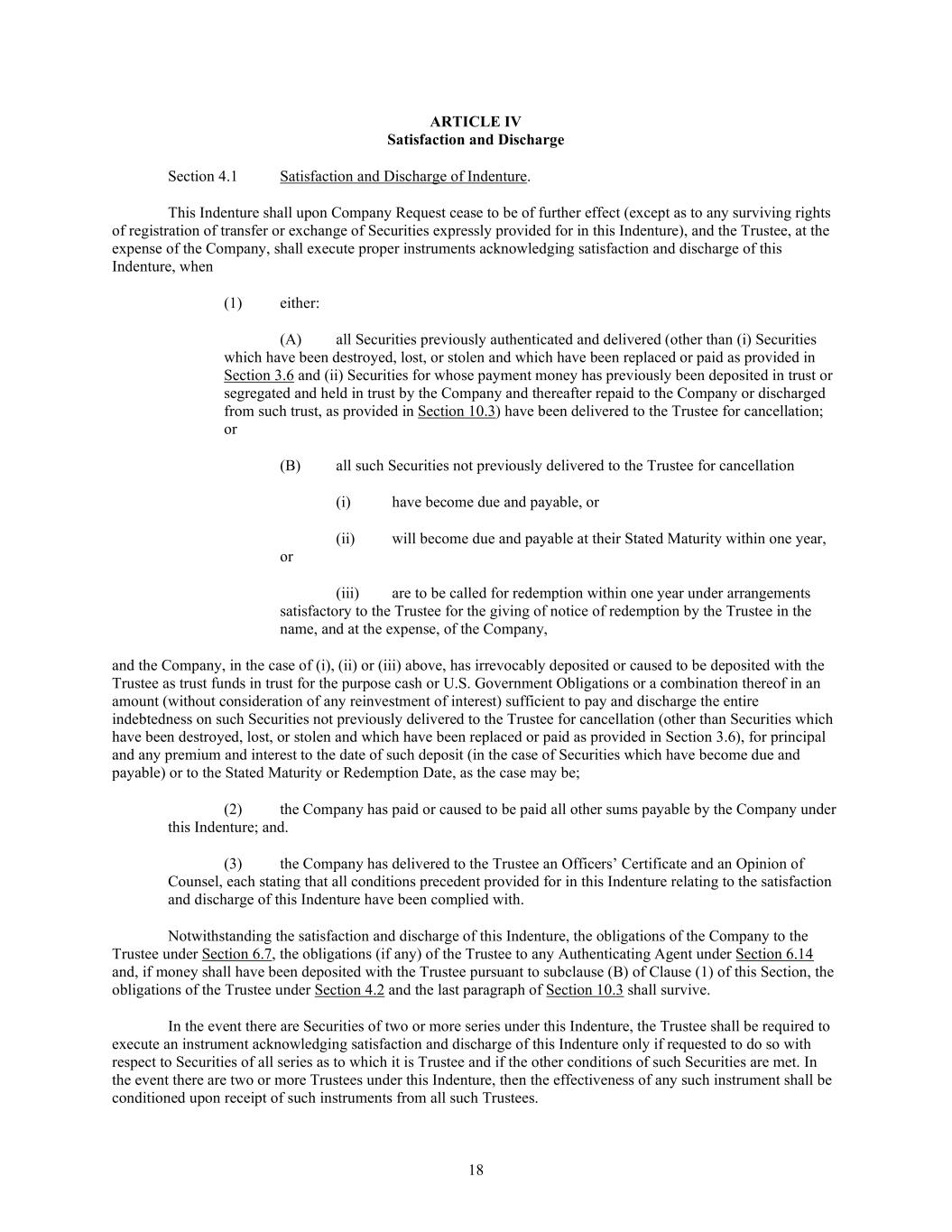 18 ARTICLE IV Satisfaction and Discharge Section 4.1 Satisfaction and Discharge of Indenture. This Indenture shall upon Company Request cease to be of further effect (except as to any surviving rights of registration of transfer or exchange of Securities expressly provided for in this Indenture), and the Trustee, at the expense of the Company, shall execute proper instruments acknowledging satisfaction and discharge of this Indenture, when (1) either: (A) all Securities previously authenticated and delivered (other than (i) Securities which have been destroyed, lost, or stolen and which have been replaced or paid as provided in Section 3.6 and (ii) Securities for whose payment money has previously been deposited in trust or segregated and held in trust by the Company and thereafter repaid to the Company or discharged from such trust, as provided in Section 10.3) have been delivered to the Trustee for cancellation; or (B) all such Securities not previously delivered to the Trustee for cancellation (i) have become due and payable, or (ii) will become due and payable at their Stated Maturity within one year, or (iii) are to be called for redemption within one year under arrangements satisfactory to the Trustee for the giving of notice of redemption by the Trustee in the name, and at the expense, of the Company, and the Company, in the case of (i), (ii) or (iii) above, has irrevocably deposited or caused to be deposited with the Trustee as trust funds in trust for the purpose cash or U.S. Government Obligations or a combination thereof in an amount (without consideration of any reinvestment of interest) sufficient to pay and discharge the entire indebtedness on such Securities not previously delivered to the Trustee for cancellation (other than Securities which have been destroyed, lost, or stolen and which have been replaced or paid as provided in Section 3.6), for principal and any premium and interest to the date of such deposit (in the case of Securities which have become due and payable) or to the Stated Maturity or Redemption Date, as the case may be; (2) the Company has paid or caused to be paid all other sums payable by the Company under this Indenture; and. (3) the Company has delivered to the Trustee an Officers’ Certificate and an Opinion of Counsel, each stating that all conditions precedent provided for in this Indenture relating to the satisfaction and discharge of this Indenture have been complied with. Notwithstanding the satisfaction and discharge of this Indenture, the obligations of the Company to the Trustee under Section 6.7, the obligations (if any) of the Trustee to any Authenticating Agent under Section 6.14 and, if money shall have been deposited with the Trustee pursuant to subclause (B) of Clause (1) of this Section, the obligations of the Trustee under Section 4.2 and the last paragraph of Section 10.3 shall survive. In the event there are Securities of two or more series under this Indenture, the Trustee shall be required to execute an instrument acknowledging satisfaction and discharge of this Indenture only if requested to do so with respect to Securities of all series as to which it is Trustee and if the other conditions of such Securities are met. In the event there are two or more Trustees under this Indenture, then the effectiveness of any such instrument shall be conditioned upon receipt of such instruments from all such Trustees.