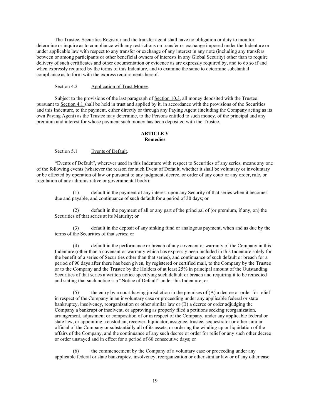 19 The Trustee, Securities Registrar and the transfer agent shall have no obligation or duty to monitor, determine or inquire as to compliance with any restrictions on transfer or exchange imposed under the Indenture or under applicable law with respect to any transfer or exchange of any interest in any note (including any transfers between or among participants or other beneficial owners of interests in any Global Security) other than to require delivery of such certificates and other documentation or evidence as are expressly required by, and to do so if and when expressly required by the terms of this Indenture, and to examine the same to determine substantial compliance as to form with the express requirements hereof. Section 4.2 Application of Trust Money. Subject to the provisions of the last paragraph of Section 10.3, all money deposited with the Trustee pursuant to Section 4.1 shall be held in trust and applied by it, in accordance with the provisions of the Securities and this Indenture, to the payment, either directly or through any Paying Agent (including the Company acting as its own Paying Agent) as the Trustee may determine, to the Persons entitled to such money, of the principal and any premium and interest for whose payment such money has been deposited with the Trustee. ARTICLE V Remedies Section 5.1 Events of Default. “Events of Default”, wherever used in this Indenture with respect to Securities of any series, means any one of the following events (whatever the reason for such Event of Default, whether it shall be voluntary or involuntary or be effected by operation of law or pursuant to any judgment, decree, or order of any court or any order, rule, or regulation of any administrative or governmental body): (1) default in the payment of any interest upon any Security of that series when it becomes due and payable, and continuance of such default for a period of 30 days; or (2) default in the payment of all or any part of the principal of (or premium, if any, on) the Securities of that series at its Maturity; or (3) default in the deposit of any sinking fund or analogous payment, when and as due by the terms of the Securities of that series; or (4) default in the performance or breach of any covenant or warranty of the Company in this Indenture (other than a covenant or warranty which has expressly been included in this Indenture solely for the benefit of a series of Securities other than that series), and continuance of such default or breach for a period of 90 days after there has been given, by registered or certified mail, to the Company by the Trustee or to the Company and the Trustee by the Holders of at least 25% in principal amount of the Outstanding Securities of that series a written notice specifying such default or breach and requiring it to be remedied and stating that such notice is a “Notice of Default” under this Indenture; or (5) the entry by a court having jurisdiction in the premises of (A) a decree or order for relief in respect of the Company in an involuntary case or proceeding under any applicable federal or state bankruptcy, insolvency, reorganization or other similar law or (B) a decree or order adjudging the Company a bankrupt or insolvent, or approving as properly filed a petitions seeking reorganization, arrangement, adjustment or composition of or in respect of the Company, under any applicable federal or state law, or appointing a custodian, receiver, liquidator, assignee, trustee, sequestrator or other similar official of the Company or substantially all of its assets, or ordering the winding up or liquidation of the affairs of the Company, and the continuance of any such decree or order for relief or any such other decree or order unstayed and in effect for a period of 60 consecutive days; or (6) the commencement by the Company of a voluntary case or proceeding under any applicable federal or state bankruptcy, insolvency, reorganization or other similar law or of any other case