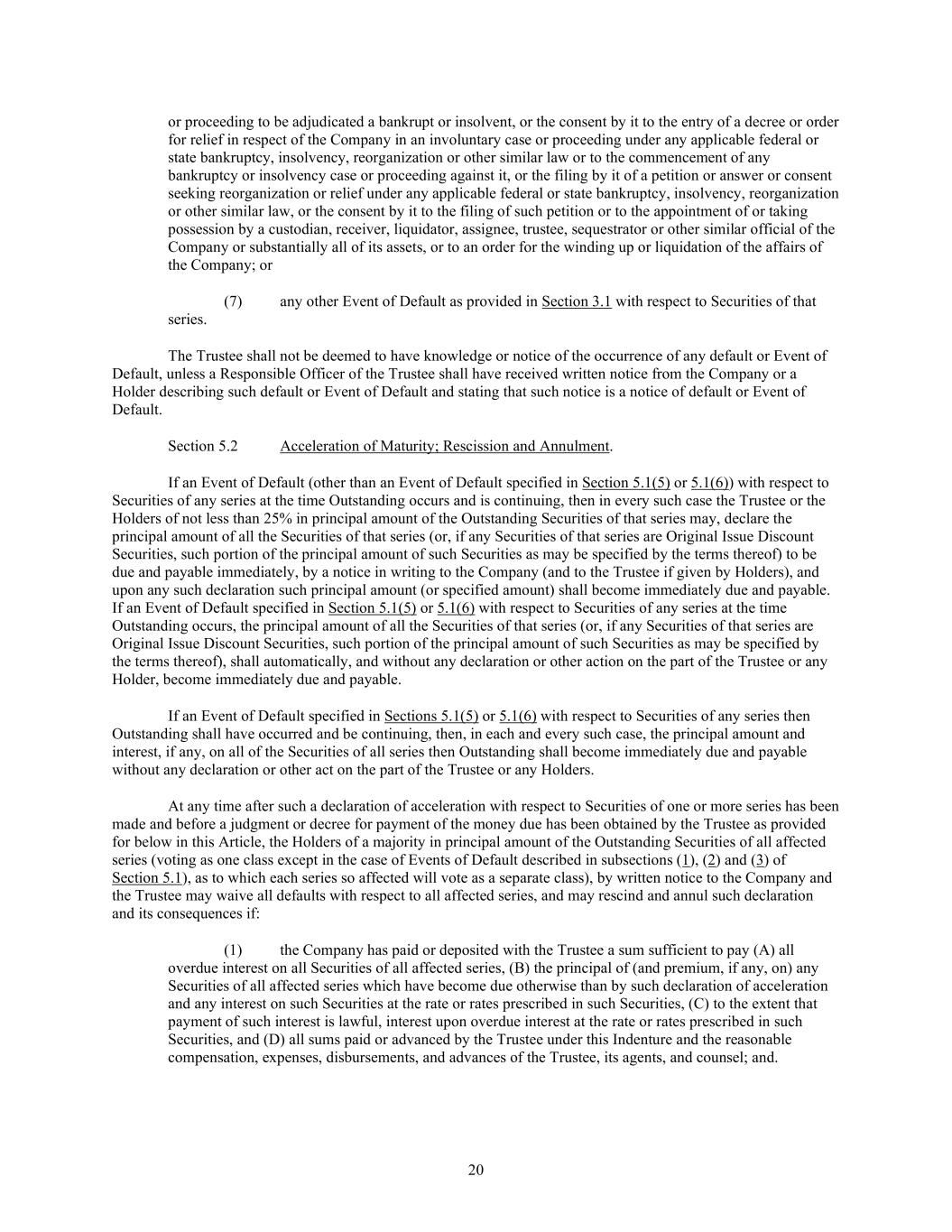 20 or proceeding to be adjudicated a bankrupt or insolvent, or the consent by it to the entry of a decree or order for relief in respect of the Company in an involuntary case or proceeding under any applicable federal or state bankruptcy, insolvency, reorganization or other similar law or to the commencement of any bankruptcy or insolvency case or proceeding against it, or the filing by it of a petition or answer or consent seeking reorganization or relief under any applicable federal or state bankruptcy, insolvency, reorganization or other similar law, or the consent by it to the filing of such petition or to the appointment of or taking possession by a custodian, receiver, liquidator, assignee, trustee, sequestrator or other similar official of the Company or substantially all of its assets, or to an order for the winding up or liquidation of the affairs of the Company; or (7) any other Event of Default as provided in Section 3.1 with respect to Securities of that series. The Trustee shall not be deemed to have knowledge or notice of the occurrence of any default or Event of Default, unless a Responsible Officer of the Trustee shall have received written notice from the Company or a Holder describing such default or Event of Default and stating that such notice is a notice of default or Event of Default. Section 5.2 Acceleration of Maturity; Rescission and Annulment. If an Event of Default (other than an Event of Default specified in Section 5.1(5) or 5.1(6)) with respect to Securities of any series at the time Outstanding occurs and is continuing, then in every such case the Trustee or the Holders of not less than 25% in principal amount of the Outstanding Securities of that series may, declare the principal amount of all the Securities of that series (or, if any Securities of that series are Original Issue Discount Securities, such portion of the principal amount of such Securities as may be specified by the terms thereof) to be due and payable immediately, by a notice in writing to the Company (and to the Trustee if given by Holders), and upon any such declaration such principal amount (or specified amount) shall become immediately due and payable. If an Event of Default specified in Section 5.1(5) or 5.1(6) with respect to Securities of any series at the time Outstanding occurs, the principal amount of all the Securities of that series (or, if any Securities of that series are Original Issue Discount Securities, such portion of the principal amount of such Securities as may be specified by the terms thereof), shall automatically, and without any declaration or other action on the part of the Trustee or any Holder, become immediately due and payable. If an Event of Default specified in Sections 5.1(5) or 5.1(6) with respect to Securities of any series then Outstanding shall have occurred and be continuing, then, in each and every such case, the principal amount and interest, if any, on all of the Securities of all series then Outstanding shall become immediately due and payable without any declaration or other act on the part of the Trustee or any Holders. At any time after such a declaration of acceleration with respect to Securities of one or more series has been made and before a judgment or decree for payment of the money due has been obtained by the Trustee as provided for below in this Article, the Holders of a majority in principal amount of the Outstanding Securities of all affected series (voting as one class except in the case of Events of Default described in subsections (1), (2) and (3) of Section 5.1), as to which each series so affected will vote as a separate class), by written notice to the Company and the Trustee may waive all defaults with respect to all affected series, and may rescind and annul such declaration and its consequences if: (1) the Company has paid or deposited with the Trustee a sum sufficient to pay (A) all overdue interest on all Securities of all affected series, (B) the principal of (and premium, if any, on) any Securities of all affected series which have become due otherwise than by such declaration of acceleration and any interest on such Securities at the rate or rates prescribed in such Securities, (C) to the extent that payment of such interest is lawful, interest upon overdue interest at the rate or rates prescribed in such Securities, and (D) all sums paid or advanced by the Trustee under this Indenture and the reasonable compensation, expenses, disbursements, and advances of the Trustee, its agents, and counsel; and.