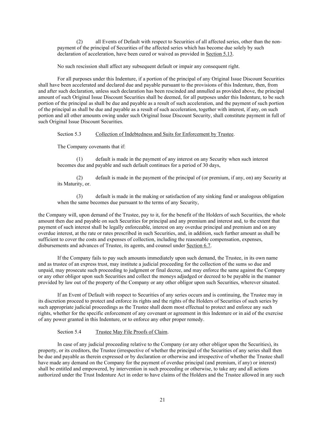 21 (2) all Events of Default with respect to Securities of all affected series, other than the non- payment of the principal of Securities of the affected series which has become due solely by such declaration of acceleration, have been cured or waived as provided in Section 5.13. No such rescission shall affect any subsequent default or impair any consequent right. For all purposes under this Indenture, if a portion of the principal of any Original Issue Discount Securities shall have been accelerated and declared due and payable pursuant to the provisions of this Indenture, then, from and after such declaration, unless such declaration has been rescinded and annulled as provided above, the principal amount of such Original Issue Discount Securities shall be deemed, for all purposes under this Indenture, to be such portion of the principal as shall be due and payable as a result of such acceleration, and the payment of such portion of the principal as shall be due and payable as a result of such acceleration, together with interest, if any, on such portion and all other amounts owing under such Original Issue Discount Security, shall constitute payment in full of such Original Issue Discount Securities. Section 5.3 Collection of Indebtedness and Suits for Enforcement by Trustee. The Company covenants that if: (1) default is made in the payment of any interest on any Security when such interest becomes due and payable and such default continues for a period of 30 days, (2) default is made in the payment of the principal of (or premium, if any, on) any Security at its Maturity, or. (3) default is made in the making or satisfaction of any sinking fund or analogous obligation when the same becomes due pursuant to the terms of any Security, the Company will, upon demand of the Trustee, pay to it, for the benefit of the Holders of such Securities, the whole amount then due and payable on such Securities for principal and any premium and interest and, to the extent that payment of such interest shall be legally enforceable, interest on any overdue principal and premium and on any overdue interest, at the rate or rates prescribed in such Securities, and, in addition, such further amount as shall be sufficient to cover the costs and expenses of collection, including the reasonable compensation, expenses, disbursements and advances of Trustee, its agents, and counsel under Section 6.7. If the Company fails to pay such amounts immediately upon such demand, the Trustee, in its own name and as trustee of an express trust, may institute a judicial proceeding for the collection of the sums so due and unpaid, may prosecute such proceeding to judgment or final decree, and may enforce the same against the Company or any other obligor upon such Securities and collect the moneys adjudged or decreed to be payable in the manner provided by law out of the property of the Company or any other obligor upon such Securities, wherever situated. If an Event of Default with respect to Securities of any series occurs and is continuing, the Trustee may in its discretion proceed to protect and enforce its rights and the rights of the Holders of Securities of such series by such appropriate judicial proceedings as the Trustee shall deem most effectual to protect and enforce any such rights, whether for the specific enforcement of any covenant or agreement in this Indenture or in aid of the exercise of any power granted in this Indenture, or to enforce any other proper remedy. Section 5.4 Trustee May File Proofs of Claim. In case of any judicial proceeding relative to the Company (or any other obligor upon the Securities), its property, or its creditors, the Trustee (irrespective of whether the principal of the Securities of any series shall then be due and payable as therein expressed or by declaration or otherwise and irrespective of whether the Trustee shall have made any demand on the Company for the payment of overdue principal (and premium, if any) or interest) shall be entitled and empowered, by intervention in such proceeding or otherwise, to take any and all actions authorized under the Trust Indenture Act in order to have claims of the Holders and the Trustee allowed in any such