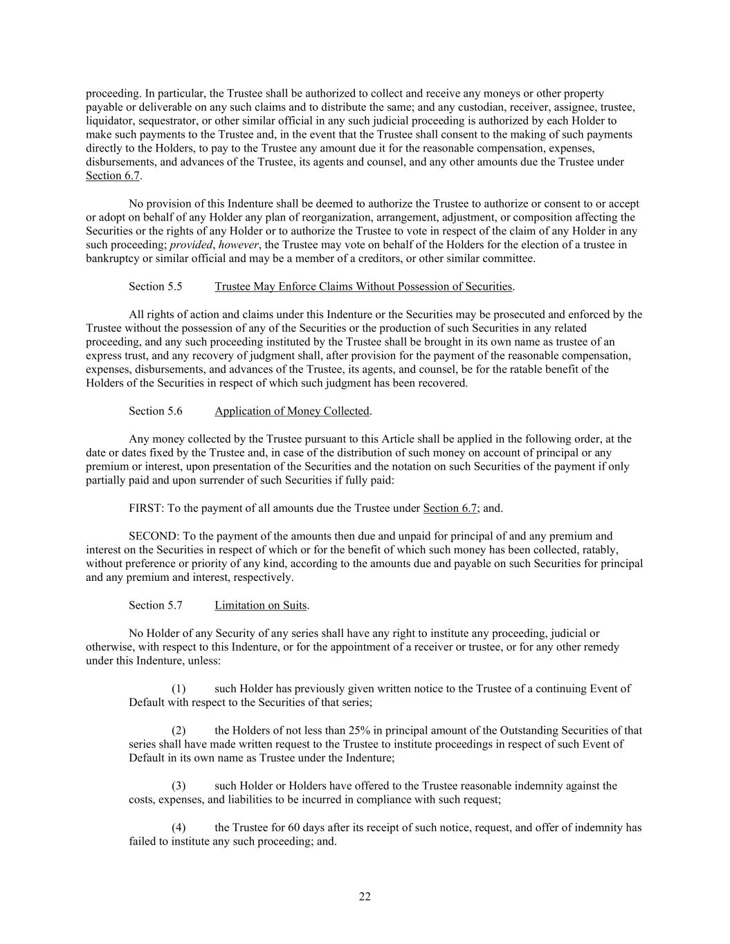 22 proceeding. In particular, the Trustee shall be authorized to collect and receive any moneys or other property payable or deliverable on any such claims and to distribute the same; and any custodian, receiver, assignee, trustee, liquidator, sequestrator, or other similar official in any such judicial proceeding is authorized by each Holder to make such payments to the Trustee and, in the event that the Trustee shall consent to the making of such payments directly to the Holders, to pay to the Trustee any amount due it for the reasonable compensation, expenses, disbursements, and advances of the Trustee, its agents and counsel, and any other amounts due the Trustee under Section 6.7. No provision of this Indenture shall be deemed to authorize the Trustee to authorize or consent to or accept or adopt on behalf of any Holder any plan of reorganization, arrangement, adjustment, or composition affecting the Securities or the rights of any Holder or to authorize the Trustee to vote in respect of the claim of any Holder in any such proceeding; provided, however, the Trustee may vote on behalf of the Holders for the election of a trustee in bankruptcy or similar official and may be a member of a creditors, or other similar committee. Section 5.5 Trustee May Enforce Claims Without Possession of Securities. All rights of action and claims under this Indenture or the Securities may be prosecuted and enforced by the Trustee without the possession of any of the Securities or the production of such Securities in any related proceeding, and any such proceeding instituted by the Trustee shall be brought in its own name as trustee of an express trust, and any recovery of judgment shall, after provision for the payment of the reasonable compensation, expenses, disbursements, and advances of the Trustee, its agents, and counsel, be for the ratable benefit of the Holders of the Securities in respect of which such judgment has been recovered. Section 5.6 Application of Money Collected. Any money collected by the Trustee pursuant to this Article shall be applied in the following order, at the date or dates fixed by the Trustee and, in case of the distribution of such money on account of principal or any premium or interest, upon presentation of the Securities and the notation on such Securities of the payment if only partially paid and upon surrender of such Securities if fully paid: FIRST: To the payment of all amounts due the Trustee under Section 6.7; and. SECOND: To the payment of the amounts then due and unpaid for principal of and any premium and interest on the Securities in respect of which or for the benefit of which such money has been collected, ratably, without preference or priority of any kind, according to the amounts due and payable on such Securities for principal and any premium and interest, respectively. Section 5.7 Limitation on Suits. No Holder of any Security of any series shall have any right to institute any proceeding, judicial or otherwise, with respect to this Indenture, or for the appointment of a receiver or trustee, or for any other remedy under this Indenture, unless: (1) such Holder has previously given written notice to the Trustee of a continuing Event of Default with respect to the Securities of that series; (2) the Holders of not less than 25% in principal amount of the Outstanding Securities of that series shall have made written request to the Trustee to institute proceedings in respect of such Event of Default in its own name as Trustee under the Indenture; (3) such Holder or Holders have offered to the Trustee reasonable indemnity against the costs, expenses, and liabilities to be incurred in compliance with such request; (4) the Trustee for 60 days after its receipt of such notice, request, and offer of indemnity has failed to institute any such proceeding; and.