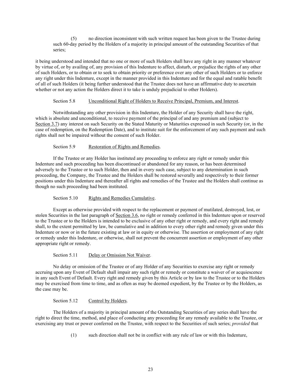 23 (5) no direction inconsistent with such written request has been given to the Trustee during such 60-day period by the Holders of a majority in principal amount of the outstanding Securities of that series; it being understood and intended that no one or more of such Holders shall have any right in any manner whatever by virtue of, or by availing of, any provision of this Indenture to affect, disturb, or prejudice the rights of any other of such Holders, or to obtain or to seek to obtain priority or preference over any other of such Holders or to enforce any right under this Indenture, except in the manner provided in this Indenture and for the equal and ratable benefit of all of such Holders (it being further understood that the Trustee does not have an affirmative duty to ascertain whether or not any action the Holders direct it to take is unduly prejudicial to other Holders). Section 5.8 Unconditional Right of Holders to Receive Principal, Premium, and Interest. Notwithstanding any other provision in this Indenture, the Holder of any Security shall have the right, which is absolute and unconditional, to receive payment of the principal of and any premium and (subject to Section 3.7) any interest on such Security on the Stated Maturity or Maturities expressed in such Security (or, in the case of redemption, on the Redemption Date), and to institute suit for the enforcement of any such payment and such rights shall not be impaired without the consent of such Holder. Section 5.9 Restoration of Rights and Remedies. If the Trustee or any Holder has instituted any proceeding to enforce any right or remedy under this Indenture and such proceeding has been discontinued or abandoned for any reason, or has been determined adversely to the Trustee or to such Holder, then and in every such case, subject to any determination in such proceeding, the Company, the Trustee and the Holders shall be restored severally and respectively to their former positions under this Indenture and thereafter all rights and remedies of the Trustee and the Holders shall continue as though no such proceeding had been instituted. Section 5.10 Rights and Remedies Cumulative. Except as otherwise provided with respect to the replacement or payment of mutilated, destroyed, lost, or stolen Securities in the last paragraph of Section 3.6, no right or remedy conferred in this Indenture upon or reserved to the Trustee or to the Holders is intended to be exclusive of any other right or remedy, and every right and remedy shall, to the extent permitted by law, be cumulative and in addition to every other right and remedy given under this Indenture or now or in the future existing at law or in equity or otherwise. The assertion or employment of any right or remedy under this Indenture, or otherwise, shall not prevent the concurrent assertion or employment of any other appropriate right or remedy. Section 5.11 Delay or Omission Not Waiver. No delay or omission of the Trustee or of any Holder of any Securities to exercise any right or remedy accruing upon any Event of Default shall impair any such right or remedy or constitute a waiver of or acquiescence in any such Event of Default. Every right and remedy given by this Article or by law to the Trustee or to the Holders may be exercised from time to time, and as often as may be deemed expedient, by the Trustee or by the Holders, as the case may be. Section 5.12 Control by Holders. The Holders of a majority in principal amount of the Outstanding Securities of any series shall have the right to direct the time, method, and place of conducting any proceeding for any remedy available to the Trustee, or exercising any trust or power conferred on the Trustee, with respect to the Securities of such series; provided that (1) such direction shall not be in conflict with any rule of law or with this Indenture,