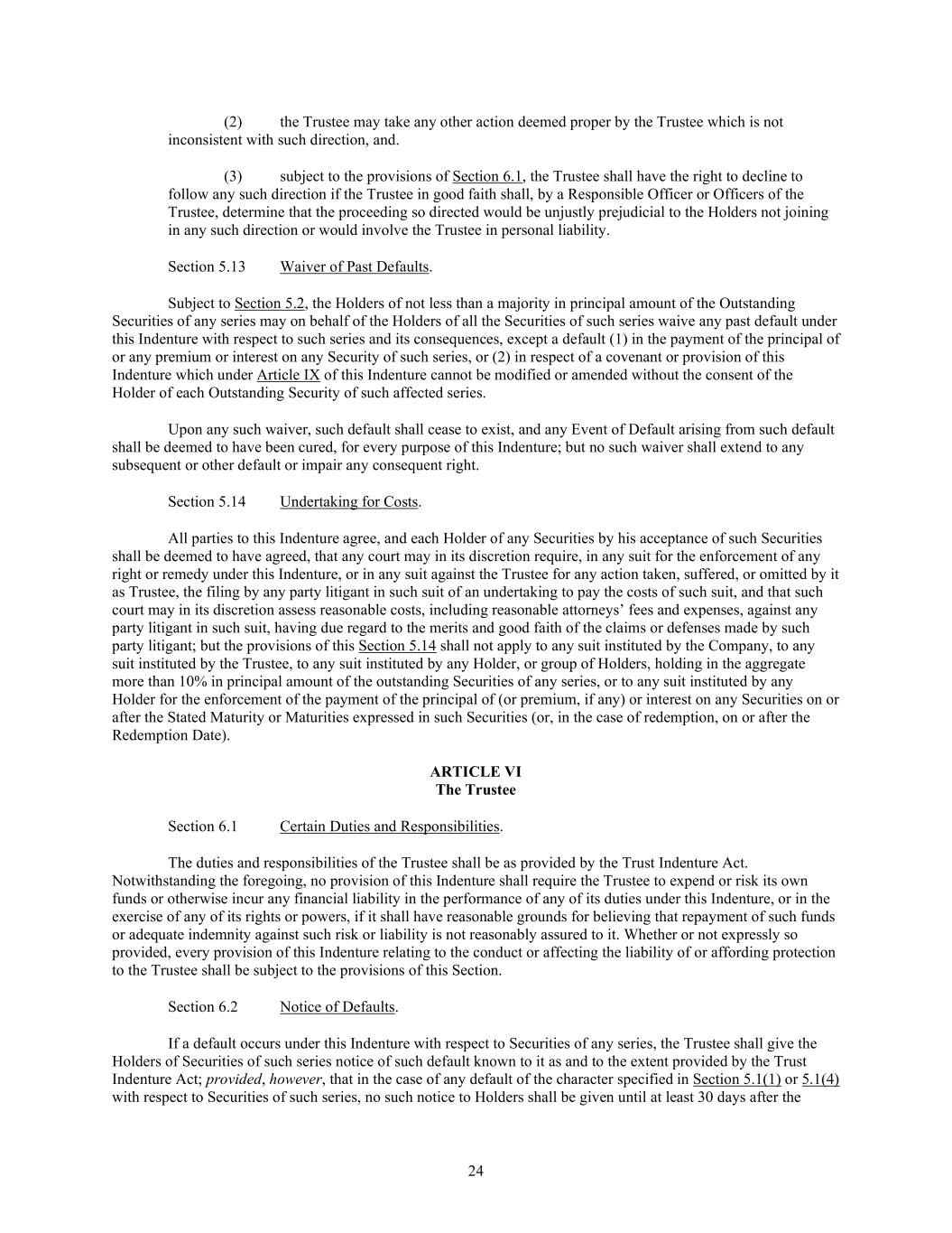 24 (2) the Trustee may take any other action deemed proper by the Trustee which is not inconsistent with such direction, and. (3) subject to the provisions of Section 6.1, the Trustee shall have the right to decline to follow any such direction if the Trustee in good faith shall, by a Responsible Officer or Officers of the Trustee, determine that the proceeding so directed would be unjustly prejudicial to the Holders not joining in any such direction or would involve the Trustee in personal liability. Section 5.13 Waiver of Past Defaults. Subject to Section 5.2, the Holders of not less than a majority in principal amount of the Outstanding Securities of any series may on behalf of the Holders of all the Securities of such series waive any past default under this Indenture with respect to such series and its consequences, except a default (1) in the payment of the principal of or any premium or interest on any Security of such series, or (2) in respect of a covenant or provision of this Indenture which under Article IX of this Indenture cannot be modified or amended without the consent of the Holder of each Outstanding Security of such affected series. Upon any such waiver, such default shall cease to exist, and any Event of Default arising from such default shall be deemed to have been cured, for every purpose of this Indenture; but no such waiver shall extend to any subsequent or other default or impair any consequent right. Section 5.14 Undertaking for Costs. All parties to this Indenture agree, and each Holder of any Securities by his acceptance of such Securities shall be deemed to have agreed, that any court may in its discretion require, in any suit for the enforcement of any right or remedy under this Indenture, or in any suit against the Trustee for any action taken, suffered, or omitted by it as Trustee, the filing by any party litigant in such suit of an undertaking to pay the costs of such suit, and that such court may in its discretion assess reasonable costs, including reasonable attorneys’ fees and expenses, against any party litigant in such suit, having due regard to the merits and good faith of the claims or defenses made by such party litigant; but the provisions of this Section 5.14 shall not apply to any suit instituted by the Company, to any suit instituted by the Trustee, to any suit instituted by any Holder, or group of Holders, holding in the aggregate more than 10% in principal amount of the outstanding Securities of any series, or to any suit instituted by any Holder for the enforcement of the payment of the principal of (or premium, if any) or interest on any Securities on or after the Stated Maturity or Maturities expressed in such Securities (or, in the case of redemption, on or after the Redemption Date). ARTICLE VI The Trustee Section 6.1 Certain Duties and Responsibilities. The duties and responsibilities of the Trustee shall be as provided by the Trust Indenture Act. Notwithstanding the foregoing, no provision of this Indenture shall require the Trustee to expend or risk its own funds or otherwise incur any financial liability in the performance of any of its duties under this Indenture, or in the exercise of any of its rights or powers, if it shall have reasonable grounds for believing that repayment of such funds or adequate indemnity against such risk or liability is not reasonably assured to it. Whether or not expressly so provided, every provision of this Indenture relating to the conduct or affecting the liability of or affording protection to the Trustee shall be subject to the provisions of this Section. Section 6.2 Notice of Defaults. If a default occurs under this Indenture with respect to Securities of any series, the Trustee shall give the Holders of Securities of such series notice of such default known to it as and to the extent provided by the Trust Indenture Act; provided, however, that in the case of any default of the character specified in Section 5.1(1) or 5.1(4) with respect to Securities of such series, no such notice to Holders shall be given until at least 30 days after the