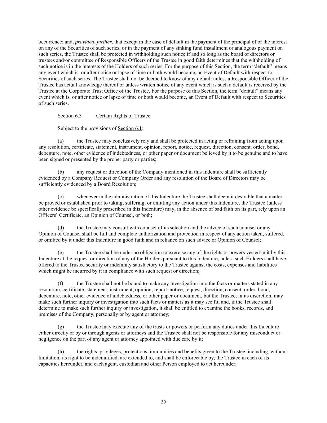 25 occurrence; and, provided, further, that except in the case of default in the payment of the principal of or the interest on any of the Securities of such series, or in the payment of any sinking fund installment or analogous payment on such series, the Trustee shall be protected in withholding such notice if and so long as the board of directors or trustees and/or committee of Responsible Officers of the Trustee in good faith determines that the withholding of such notice is in the interests of the Holders of such series. For the purpose of this Section, the term “default” means any event which is, or after notice or lapse of time or both would become, an Event of Default with respect to Securities of such series. The Trustee shall not be deemed to know of any default unless a Responsible Officer of the Trustee has actual knowledge thereof or unless written notice of any event which is such a default is received by the Trustee at the Corporate Trust Office of the Trustee. For the purpose of this Section, the term “default” means any event which is, or after notice or lapse of time or both would become, an Event of Default with respect to Securities of such series. Section 6.3 Certain Rights of Trustee. Subject to the provisions of Section 6.1: (a) the Trustee may conclusively rely and shall be protected in acting or refraining from acting upon any resolution, certificate, statement, instrument, opinion, report, notice, request, direction, consent, order, bond, debenture, note, other evidence of indebtedness, or other paper or document believed by it to be genuine and to have been signed or presented by the proper party or parties; (b) any request or direction of the Company mentioned in this Indenture shall be sufficiently evidenced by a Company Request or Company Order and any resolution of the Board of Directors may be sufficiently evidenced by a Board Resolution; (c) whenever in the administration of this Indenture the Trustee shall deem it desirable that a matter be proved or established prior to taking, suffering, or omitting any action under this Indenture, the Trustee (unless other evidence be specifically prescribed in this Indenture) may, in the absence of bad faith on its part, rely upon an Officers’ Certificate, an Opinion of Counsel, or both; (d) the Trustee may consult with counsel of its selection and the advice of such counsel or any Opinion of Counsel shall be full and complete authorization and protection in respect of any action taken, suffered, or omitted by it under this Indenture in good faith and in reliance on such advice or Opinion of Counsel; (e) the Trustee shall be under no obligation to exercise any of the rights or powers vested in it by this Indenture at the request or direction of any of the Holders pursuant to this Indenture, unless such Holders shall have offered to the Trustee security or indemnity satisfactory to the Trustee against the costs, expenses and liabilities which might be incurred by it in compliance with such request or direction; (f) the Trustee shall not be bound to make any investigation into the facts or matters stated in any resolution, certificate, statement, instrument, opinion, report, notice, request, direction, consent, order, bond, debenture, note, other evidence of indebtedness, or other paper or document, but the Trustee, in its discretion, may make such further inquiry or investigation into such facts or matters as it may see fit, and, if the Trustee shall determine to make such further inquiry or investigation, it shall be entitled to examine the books, records, and premises of the Company, personally or by agent or attorney; (g) the Trustee may execute any of the trusts or powers or perform any duties under this Indenture either directly or by or through agents or attorneys and the Trustee shall not be responsible for any misconduct or negligence on the part of any agent or attorney appointed with due care by it; (h) the rights, privileges, protections, immunities and benefits given to the Trustee, including, without limitation, its right to be indemnified, are extended to, and shall be enforceable by, the Trustee in each of its capacities hereunder, and each agent, custodian and other Person employed to act hereunder;
