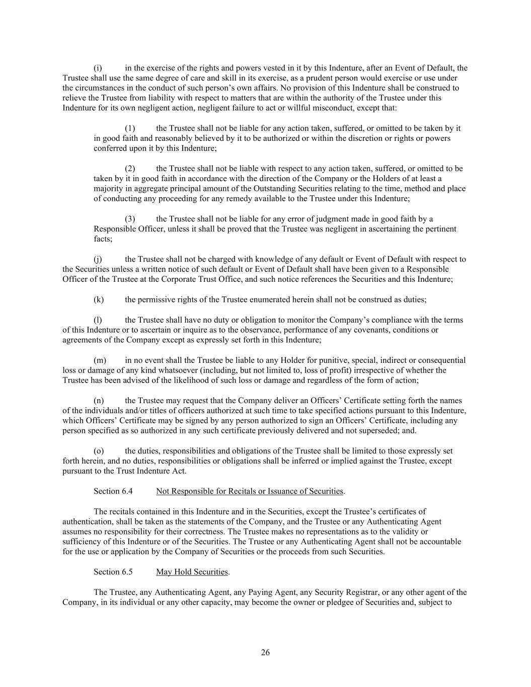 26 (i) in the exercise of the rights and powers vested in it by this Indenture, after an Event of Default, the Trustee shall use the same degree of care and skill in its exercise, as a prudent person would exercise or use under the circumstances in the conduct of such person’s own affairs. No provision of this Indenture shall be construed to relieve the Trustee from liability with respect to matters that are within the authority of the Trustee under this Indenture for its own negligent action, negligent failure to act or willful misconduct, except that: (1) the Trustee shall not be liable for any action taken, suffered, or omitted to be taken by it in good faith and reasonably believed by it to be authorized or within the discretion or rights or powers conferred upon it by this Indenture; (2) the Trustee shall not be liable with respect to any action taken, suffered, or omitted to be taken by it in good faith in accordance with the direction of the Company or the Holders of at least a majority in aggregate principal amount of the Outstanding Securities relating to the time, method and place of conducting any proceeding for any remedy available to the Trustee under this Indenture; (3) the Trustee shall not be liable for any error of judgment made in good faith by a Responsible Officer, unless it shall be proved that the Trustee was negligent in ascertaining the pertinent facts; (j) the Trustee shall not be charged with knowledge of any default or Event of Default with respect to the Securities unless a written notice of such default or Event of Default shall have been given to a Responsible Officer of the Trustee at the Corporate Trust Office, and such notice references the Securities and this Indenture; (k) the permissive rights of the Trustee enumerated herein shall not be construed as duties; (l) the Trustee shall have no duty or obligation to monitor the Company’s compliance with the terms of this Indenture or to ascertain or inquire as to the observance, performance of any covenants, conditions or agreements of the Company except as expressly set forth in this Indenture; (m) in no event shall the Trustee be liable to any Holder for punitive, special, indirect or consequential loss or damage of any kind whatsoever (including, but not limited to, loss of profit) irrespective of whether the Trustee has been advised of the likelihood of such loss or damage and regardless of the form of action; (n) the Trustee may request that the Company deliver an Officers’ Certificate setting forth the names of the individuals and/or titles of officers authorized at such time to take specified actions pursuant to this Indenture, which Officers’ Certificate may be signed by any person authorized to sign an Officers’ Certificate, including any person specified as so authorized in any such certificate previously delivered and not superseded; and. (o) the duties, responsibilities and obligations of the Trustee shall be limited to those expressly set forth herein, and no duties, responsibilities or obligations shall be inferred or implied against the Trustee, except pursuant to the Trust Indenture Act. Section 6.4 Not Responsible for Recitals or Issuance of Securities. The recitals contained in this Indenture and in the Securities, except the Trustee’s certificates of authentication, shall be taken as the statements of the Company, and the Trustee or any Authenticating Agent assumes no responsibility for their correctness. The Trustee makes no representations as to the validity or sufficiency of this Indenture or of the Securities. The Trustee or any Authenticating Agent shall not be accountable for the use or application by the Company of Securities or the proceeds from such Securities. Section 6.5 May Hold Securities. The Trustee, any Authenticating Agent, any Paying Agent, any Security Registrar, or any other agent of the Company, in its individual or any other capacity, may become the owner or pledgee of Securities and, subject to