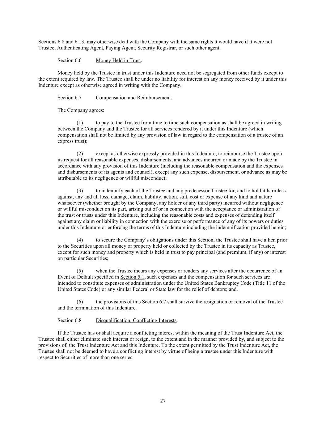27 Sections 6.8 and 6.13, may otherwise deal with the Company with the same rights it would have if it were not Trustee, Authenticating Agent, Paying Agent, Security Registrar, or such other agent. Section 6.6 Money Held in Trust. Money held by the Trustee in trust under this Indenture need not be segregated from other funds except to the extent required by law. The Trustee shall be under no liability for interest on any money received by it under this Indenture except as otherwise agreed in writing with the Company. Section 6.7 Compensation and Reimbursement. The Company agrees: (1) to pay to the Trustee from time to time such compensation as shall be agreed in writing between the Company and the Trustee for all services rendered by it under this Indenture (which compensation shall not be limited by any provision of law in regard to the compensation of a trustee of an express trust); (2) except as otherwise expressly provided in this Indenture, to reimburse the Trustee upon its request for all reasonable expenses, disbursements, and advances incurred or made by the Trustee in accordance with any provision of this Indenture (including the reasonable compensation and the expenses and disbursements of its agents and counsel), except any such expense, disbursement, or advance as may be attributable to its negligence or willful misconduct; (3) to indemnify each of the Trustee and any predecessor Trustee for, and to hold it harmless against, any and all loss, damage, claim, liability, action, suit, cost or expense of any kind and nature whatsoever (whether brought by the Company, any holder or any third party) incurred without negligence or willful misconduct on its part, arising out of or in connection with the acceptance or administration of the trust or trusts under this Indenture, including the reasonable costs and expenses of defending itself against any claim or liability in connection with the exercise or performance of any of its powers or duties under this Indenture or enforcing the terms of this Indenture including the indemnification provided herein; (4) to secure the Company’s obligations under this Section, the Trustee shall have a lien prior to the Securities upon all money or property held or collected by the Trustee in its capacity as Trustee, except for such money and property which is held in trust to pay principal (and premium, if any) or interest on particular Securities; (5) when the Trustee incurs any expenses or renders any services after the occurrence of an Event of Default specified in Section 5.1, such expenses and the compensation for such services are intended to constitute expenses of administration under the United States Bankruptcy Code (Title 11 of the United States Code) or any similar Federal or State law for the relief of debtors; and. (6) the provisions of this Section 6.7 shall survive the resignation or removal of the Trustee and the termination of this Indenture. Section 6.8 Disqualification; Conflicting Interests. If the Trustee has or shall acquire a conflicting interest within the meaning of the Trust Indenture Act, the Trustee shall either eliminate such interest or resign, to the extent and in the manner provided by, and subject to the provisions of, the Trust Indenture Act and this Indenture. To the extent permitted by the Trust Indenture Act, the Trustee shall not be deemed to have a conflicting interest by virtue of being a trustee under this Indenture with respect to Securities of more than one series.