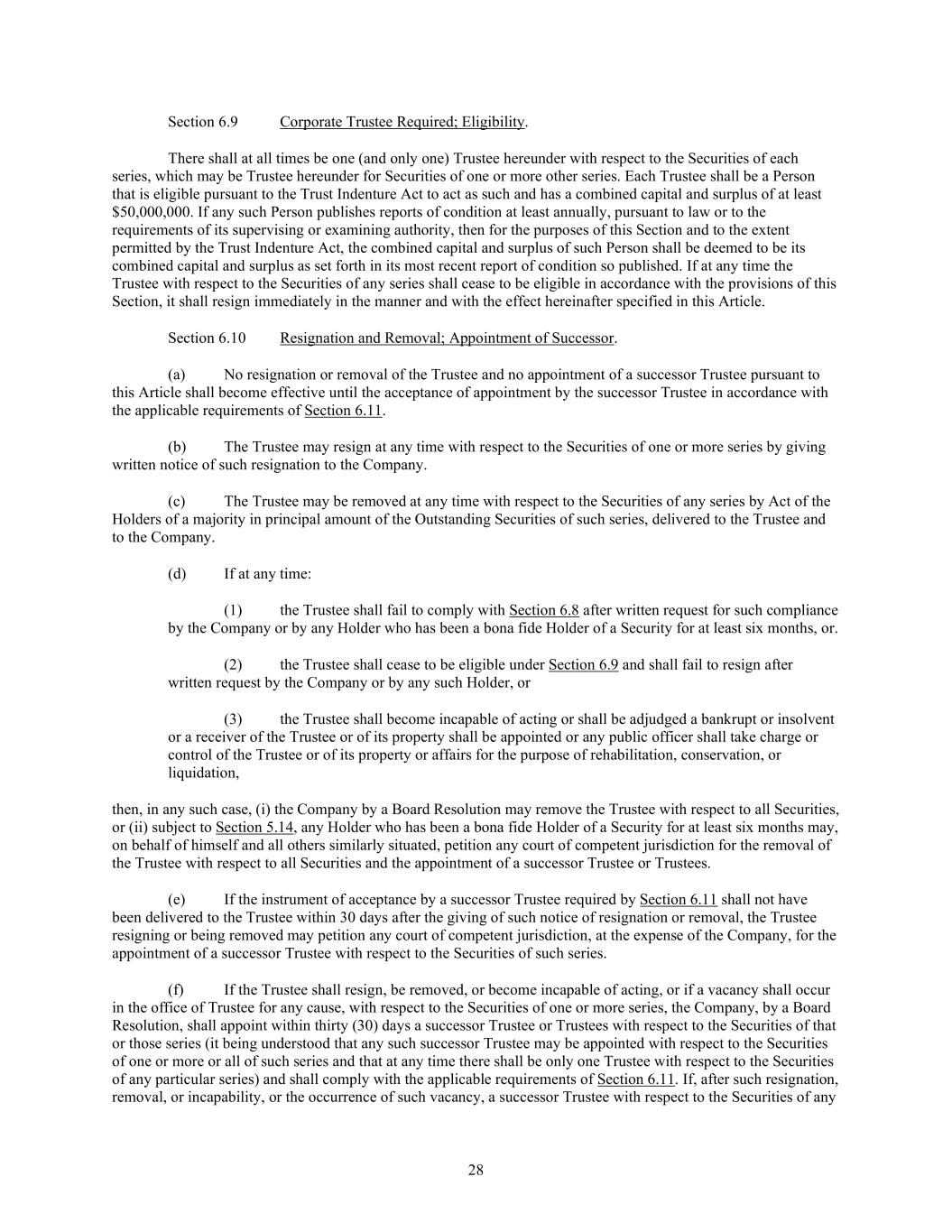 28 Section 6.9 Corporate Trustee Required; Eligibility. There shall at all times be one (and only one) Trustee hereunder with respect to the Securities of each series, which may be Trustee hereunder for Securities of one or more other series. Each Trustee shall be a Person that is eligible pursuant to the Trust Indenture Act to act as such and has a combined capital and surplus of at least $50,000,000. If any such Person publishes reports of condition at least annually, pursuant to law or to the requirements of its supervising or examining authority, then for the purposes of this Section and to the extent permitted by the Trust Indenture Act, the combined capital and surplus of such Person shall be deemed to be its combined capital and surplus as set forth in its most recent report of condition so published. If at any time the Trustee with respect to the Securities of any series shall cease to be eligible in accordance with the provisions of this Section, it shall resign immediately in the manner and with the effect hereinafter specified in this Article. Section 6.10 Resignation and Removal; Appointment of Successor. (a) No resignation or removal of the Trustee and no appointment of a successor Trustee pursuant to this Article shall become effective until the acceptance of appointment by the successor Trustee in accordance with the applicable requirements of Section 6.11. (b) The Trustee may resign at any time with respect to the Securities of one or more series by giving written notice of such resignation to the Company. (c) The Trustee may be removed at any time with respect to the Securities of any series by Act of the Holders of a majority in principal amount of the Outstanding Securities of such series, delivered to the Trustee and to the Company. (d) If at any time: (1) the Trustee shall fail to comply with Section 6.8 after written request for such compliance by the Company or by any Holder who has been a bona fide Holder of a Security for at least six months, or. (2) the Trustee shall cease to be eligible under Section 6.9 and shall fail to resign after written request by the Company or by any such Holder, or (3) the Trustee shall become incapable of acting or shall be adjudged a bankrupt or insolvent or a receiver of the Trustee or of its property shall be appointed or any public officer shall take charge or control of the Trustee or of its property or affairs for the purpose of rehabilitation, conservation, or liquidation, then, in any such case, (i) the Company by a Board Resolution may remove the Trustee with respect to all Securities, or (ii) subject to Section 5.14, any Holder who has been a bona fide Holder of a Security for at least six months may, on behalf of himself and all others similarly situated, petition any court of competent jurisdiction for the removal of the Trustee with respect to all Securities and the appointment of a successor Trustee or Trustees. (e) If the instrument of acceptance by a successor Trustee required by Section 6.11 shall not have been delivered to the Trustee within 30 days after the giving of such notice of resignation or removal, the Trustee resigning or being removed may petition any court of competent jurisdiction, at the expense of the Company, for the appointment of a successor Trustee with respect to the Securities of such series. (f) If the Trustee shall resign, be removed, or become incapable of acting, or if a vacancy shall occur in the office of Trustee for any cause, with respect to the Securities of one or more series, the Company, by a Board Resolution, shall appoint within thirty (30) days a successor Trustee or Trustees with respect to the Securities of that or those series (it being understood that any such successor Trustee may be appointed with respect to the Securities of one or more or all of such series and that at any time there shall be only one Trustee with respect to the Securities of any particular series) and shall comply with the applicable requirements of Section 6.11. If, after such resignation, removal, or incapability, or the occurrence of such vacancy, a successor Trustee with respect to the Securities of any