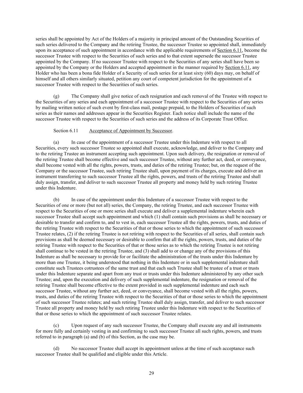 29 series shall be appointed by Act of the Holders of a majority in principal amount of the Outstanding Securities of such series delivered to the Company and the retiring Trustee, the successor Trustee so appointed shall, immediately upon its acceptance of such appointment in accordance with the applicable requirements of Section 6.11, become the successor Trustee with respect to the Securities of such series and to that extent supersede the successor Trustee appointed by the Company. If no successor Trustee with respect to the Securities of any series shall have been so appointed by the Company or the Holders and accepted appointment in the manner required by Section 6.11, any Holder who has been a bona fide Holder of a Security of such series for at least sixty (60) days may, on behalf of himself and all others similarly situated, petition any court of competent jurisdiction for the appointment of a successor Trustee with respect to the Securities of such series. (g) The Company shall give notice of each resignation and each removal of the Trustee with respect to the Securities of any series and each appointment of a successor Trustee with respect to the Securities of any series by mailing written notice of such event by first-class mail, postage prepaid, to the Holders of Securities of such series as their names and addresses appear in the Securities Register. Each notice shall include the name of the successor Trustee with respect to the Securities of such series and the address of its Corporate Trust Office. Section 6.11 Acceptance of Appointment by Successor. (a) In case of the appointment of a successor Trustee under this Indenture with respect to all Securities, every such successor Trustee so appointed shall execute, acknowledge, and deliver to the Company and to the retiring Trustee an instrument accepting such appointment. Upon such delivery, the resignation or removal of the retiring Trustee shall become effective and such successor Trustee, without any further act, deed, or conveyance, shall become vested with all the rights, powers, trusts, and duties of the retiring Trustee; but, on the request of the Company or the successor Trustee, such retiring Trustee shall, upon payment of its charges, execute and deliver an instrument transferring to such successor Trustee all the rights, powers, and trusts of the retiring Trustee and shall duly assign, transfer, and deliver to such successor Trustee all property and money held by such retiring Trustee under this Indenture. (b) In case of the appointment under this Indenture of a successor Trustee with respect to the Securities of one or more (but not all) series, the Company, the retiring Trustee, and each successor Trustee with respect to the Securities of one or more series shall execute and deliver a supplemental indenture wherein each successor Trustee shall accept such appointment and which (1) shall contain such provisions as shall be necessary or desirable to transfer and confirm to, and to vest in, each successor Trustee all the rights, powers, trusts, and duties of the retiring Trustee with respect to the Securities of that or those series to which the appointment of such successor Trustee relates, (2) if the retiring Trustee is not retiring with respect to the Securities of all series, shall contain such provisions as shall be deemed necessary or desirable to confirm that all the rights, powers, trusts, and duties of the retiring Trustee with respect to the Securities of that or those series as to which the retiring Trustee is not retiring shall continue to be vested in the retiring Trustee, and (3) shall add to or change any of the provisions of this Indenture as shall be necessary to provide for or facilitate the administration of the trusts under this Indenture by more than one Trustee, it being understood that nothing in this Indenture or in such supplemental indenture shall constitute such Trustees cotrustees of the same trust and that each such Trustee shall be trustee of a trust or trusts under this Indenture separate and apart from any trust or trusts under this Indenture administered by any other such Trustee; and, upon the execution and delivery of such supplemental indenture, the resignation or removal of the retiring Trustee shall become effective to the extent provided in such supplemental indenture and each such successor Trustee, without any further act, deed, or conveyance, shall become vested with all the rights, powers, trusts, and duties of the retiring Trustee with respect to the Securities of that or those series to which the appointment of such successor Trustee relates; and such retiring Trustee shall duly assign, transfer, and deliver to such successor Trustee all property and money held by such retiring Trustee under this Indenture with respect to the Securities of that or those series to which the appointment of such successor Trustee relates. (c) Upon request of any such successor Trustee, the Company shall execute any and all instruments for more fully and certainly vesting in and confirming to such successor Trustee all such rights, powers, and trusts referred to in paragraph (a) and (b) of this Section, as the case may be. (d) No successor Trustee shall accept its appointment unless at the time of such acceptance such successor Trustee shall be qualified and eligible under this Article.