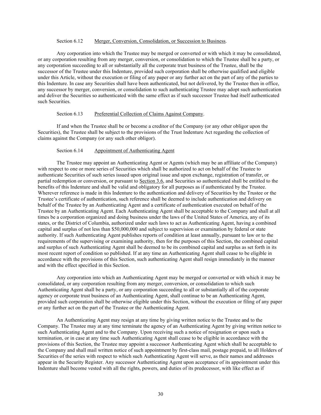30 Section 6.12 Merger, Conversion, Consolidation, or Succession to Business. Any corporation into which the Trustee may be merged or converted or with which it may be consolidated, or any corporation resulting from any merger, conversion, or consolidation to which the Trustee shall be a party, or any corporation succeeding to all or substantially all the corporate trust business of the Trustee, shall be the successor of the Trustee under this Indenture, provided such corporation shall be otherwise qualified and eligible under this Article, without the execution or filing of any paper or any further act on the part of any of the parties to this Indenture. In case any Securities shall have been authenticated, but not delivered, by the Trustee then in office, any successor by merger, conversion, or consolidation to such authenticating Trustee may adopt such authentication and deliver the Securities so authenticated with the same effect as if such successor Trustee had itself authenticated such Securities. Section 6.13 Preferential Collection of Claims Against Company. If and when the Trustee shall be or become a creditor of the Company (or any other obligor upon the Securities), the Trustee shall be subject to the provisions of the Trust Indenture Act regarding the collection of claims against the Company (or any such other obligor). Section 6.14 Appointment of Authenticating Agent The Trustee may appoint an Authenticating Agent or Agents (which may be an affiliate of the Company) with respect to one or more series of Securities which shall be authorized to act on behalf of the Trustee to authenticate Securities of such series issued upon original issue and upon exchange, registration of transfer, or partial redemption or conversion, or pursuant to Section 3.6, and Securities so authenticated shall be entitled to the benefits of this Indenture and shall be valid and obligatory for all purposes as if authenticated by the Trustee. Wherever reference is made in this Indenture to the authentication and delivery of Securities by the Trustee or the Trustee’s certificate of authentication, such reference shall be deemed to include authentication and delivery on behalf of the Trustee by an Authenticating Agent and a certificate of authentication executed on behalf of the Trustee by an Authenticating Agent. Each Authenticating Agent shall be acceptable to the Company and shall at all times be a corporation organized and doing business under the laws of the United States of America, any of its states, or the District of Columbia, authorized under such laws to act as Authenticating Agent, having a combined capital and surplus of not less than $50,000,000 and subject to supervision or examination by federal or state authority. If such Authenticating Agent publishes reports of condition at least annually, pursuant to law or to the requirements of the supervising or examining authority, then for the purposes of this Section, the combined capital and surplus of such Authenticating Agent shall be deemed to be its combined capital and surplus as set forth in its most recent report of condition so published. If at any time an Authenticating Agent shall cease to be eligible in accordance with the provisions of this Section, such authenticating Agent shall resign immediately in the manner and with the effect specified in this Section. Any corporation into which an Authenticating Agent may be merged or converted or with which it may be consolidated, or any corporation resulting from any merger, conversion, or consolidation to which such Authenticating Agent shall be a party, or any corporation succeeding to all or substantially all of the corporate agency or corporate trust business of an Authenticating Agent, shall continue to be an Authenticating Agent, provided such corporation shall be otherwise eligible under this Section, without the execution or filing of any paper or any further act on the part of the Trustee or the Authenticating Agent. An Authenticating Agent may resign at any time by giving written notice to the Trustee and to the Company. The Trustee may at any time terminate the agency of an Authenticating Agent by giving written notice to such Authenticating Agent and to the Company. Upon receiving such a notice of resignation or upon such a termination, or in case at any time such Authenticating Agent shall cease to be eligible in accordance with the provisions of this Section, the Trustee may appoint a successor Authenticating Agent which shall be acceptable to the Company and shall mail written notice of such appointment by first-class mail, postage prepaid, to all Holders of Securities of the series with respect to which such Authenticating Agent will serve, as their names and addresses appear in the Security Register. Any successor Authenticating Agent upon acceptance of its appointment under this Indenture shall become vested with all the rights, powers, and duties of its predecessor, with like effect as if