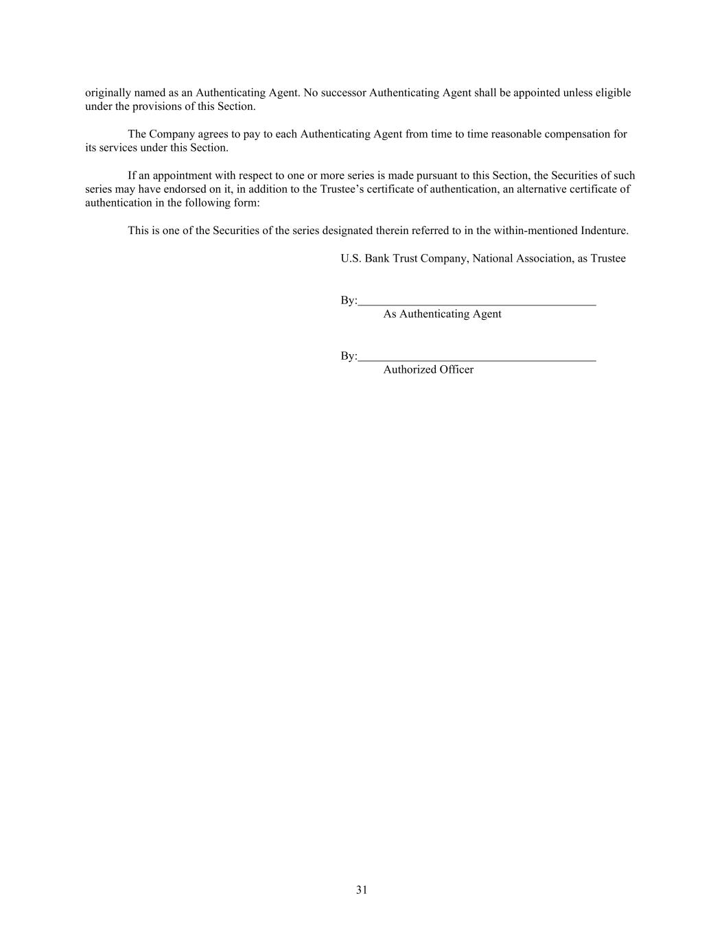 31 originally named as an Authenticating Agent. No successor Authenticating Agent shall be appointed unless eligible under the provisions of this Section. The Company agrees to pay to each Authenticating Agent from time to time reasonable compensation for its services under this Section. If an appointment with respect to one or more series is made pursuant to this Section, the Securities of such series may have endorsed on it, in addition to the Trustee’s certificate of authentication, an alternative certificate of authentication in the following form: This is one of the Securities of the series designated therein referred to in the within-mentioned Indenture. U.S. Bank Trust Company, National Association, as Trustee By: As Authenticating Agent By: Authorized Officer