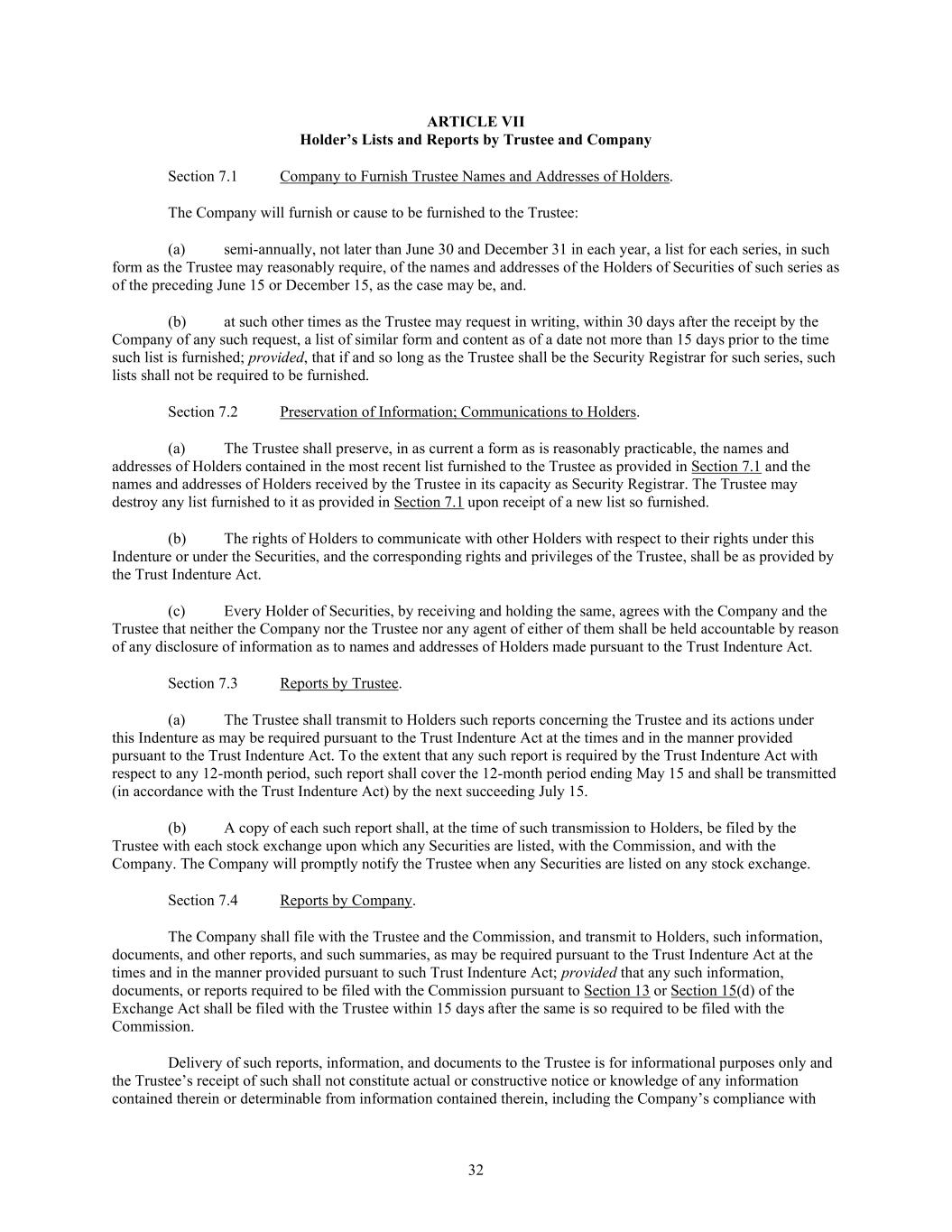 32 ARTICLE VII Holder’s Lists and Reports by Trustee and Company Section 7.1 Company to Furnish Trustee Names and Addresses of Holders. The Company will furnish or cause to be furnished to the Trustee: (a) semi-annually, not later than June 30 and December 31 in each year, a list for each series, in such form as the Trustee may reasonably require, of the names and addresses of the Holders of Securities of such series as of the preceding June 15 or December 15, as the case may be, and. (b) at such other times as the Trustee may request in writing, within 30 days after the receipt by the Company of any such request, a list of similar form and content as of a date not more than 15 days prior to the time such list is furnished; provided, that if and so long as the Trustee shall be the Security Registrar for such series, such lists shall not be required to be furnished. Section 7.2 Preservation of Information; Communications to Holders. (a) The Trustee shall preserve, in as current a form as is reasonably practicable, the names and addresses of Holders contained in the most recent list furnished to the Trustee as provided in Section 7.1 and the names and addresses of Holders received by the Trustee in its capacity as Security Registrar. The Trustee may destroy any list furnished to it as provided in Section 7.1 upon receipt of a new list so furnished. (b) The rights of Holders to communicate with other Holders with respect to their rights under this Indenture or under the Securities, and the corresponding rights and privileges of the Trustee, shall be as provided by the Trust Indenture Act. (c) Every Holder of Securities, by receiving and holding the same, agrees with the Company and the Trustee that neither the Company nor the Trustee nor any agent of either of them shall be held accountable by reason of any disclosure of information as to names and addresses of Holders made pursuant to the Trust Indenture Act. Section 7.3 Reports by Trustee. (a) The Trustee shall transmit to Holders such reports concerning the Trustee and its actions under this Indenture as may be required pursuant to the Trust Indenture Act at the times and in the manner provided pursuant to the Trust Indenture Act. To the extent that any such report is required by the Trust Indenture Act with respect to any 12-month period, such report shall cover the 12-month period ending May 15 and shall be transmitted (in accordance with the Trust Indenture Act) by the next succeeding July 15. (b) A copy of each such report shall, at the time of such transmission to Holders, be filed by the Trustee with each stock exchange upon which any Securities are listed, with the Commission, and with the Company. The Company will promptly notify the Trustee when any Securities are listed on any stock exchange. Section 7.4 Reports by Company. The Company shall file with the Trustee and the Commission, and transmit to Holders, such information, documents, and other reports, and such summaries, as may be required pursuant to the Trust Indenture Act at the times and in the manner provided pursuant to such Trust Indenture Act; provided that any such information, documents, or reports required to be filed with the Commission pursuant to Section 13 or Section 15(d) of the Exchange Act shall be filed with the Trustee within 15 days after the same is so required to be filed with the Commission. Delivery of such reports, information, and documents to the Trustee is for informational purposes only and the Trustee’s receipt of such shall not constitute actual or constructive notice or knowledge of any information contained therein or determinable from information contained therein, including the Company’s compliance with