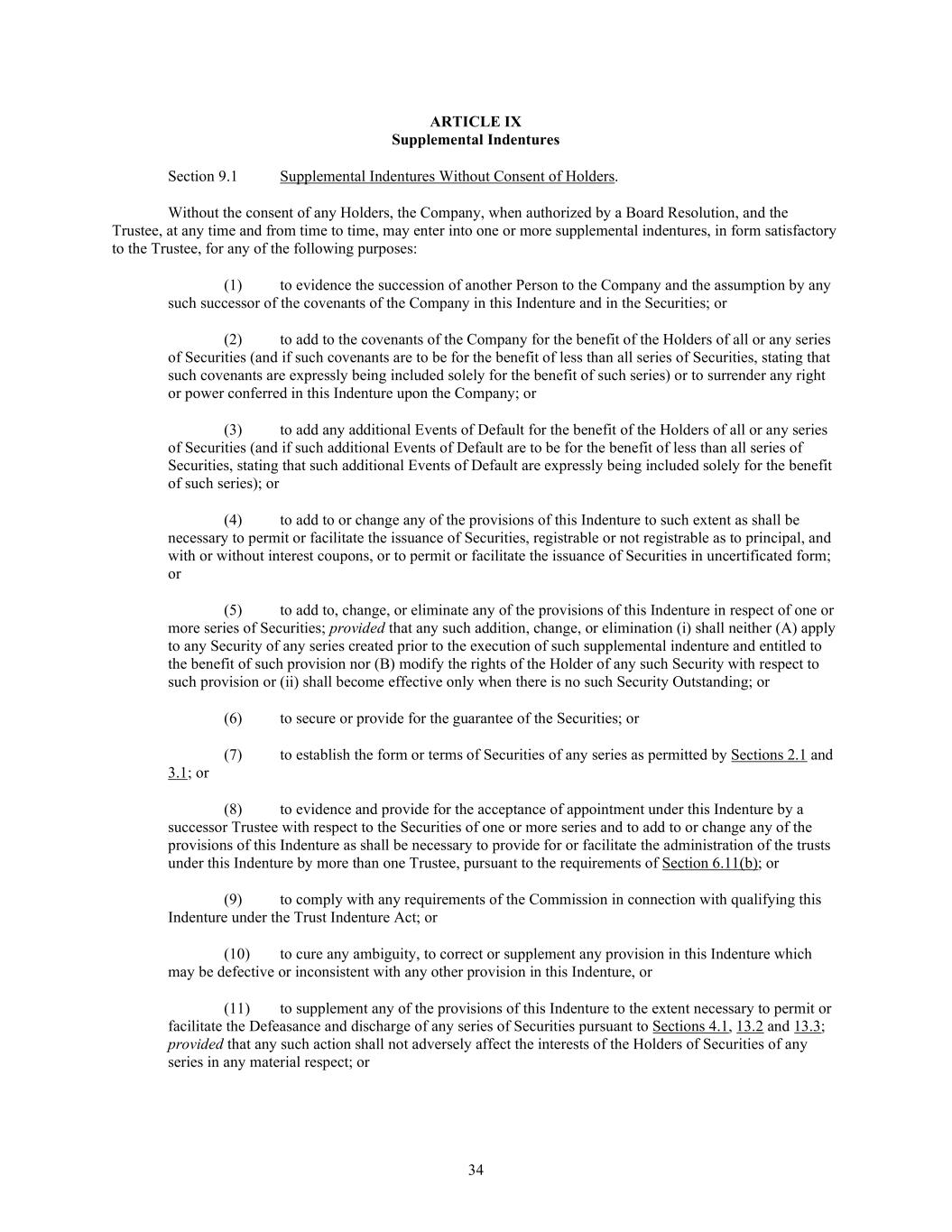34 ARTICLE IX Supplemental Indentures Section 9.1 Supplemental Indentures Without Consent of Holders. Without the consent of any Holders, the Company, when authorized by a Board Resolution, and the Trustee, at any time and from time to time, may enter into one or more supplemental indentures, in form satisfactory to the Trustee, for any of the following purposes: (1) to evidence the succession of another Person to the Company and the assumption by any such successor of the covenants of the Company in this Indenture and in the Securities; or (2) to add to the covenants of the Company for the benefit of the Holders of all or any series of Securities (and if such covenants are to be for the benefit of less than all series of Securities, stating that such covenants are expressly being included solely for the benefit of such series) or to surrender any right or power conferred in this Indenture upon the Company; or (3) to add any additional Events of Default for the benefit of the Holders of all or any series of Securities (and if such additional Events of Default are to be for the benefit of less than all series of Securities, stating that such additional Events of Default are expressly being included solely for the benefit of such series); or (4) to add to or change any of the provisions of this Indenture to such extent as shall be necessary to permit or facilitate the issuance of Securities, registrable or not registrable as to principal, and with or without interest coupons, or to permit or facilitate the issuance of Securities in uncertificated form; or (5) to add to, change, or eliminate any of the provisions of this Indenture in respect of one or more series of Securities; provided that any such addition, change, or elimination (i) shall neither (A) apply to any Security of any series created prior to the execution of such supplemental indenture and entitled to the benefit of such provision nor (B) modify the rights of the Holder of any such Security with respect to such provision or (ii) shall become effective only when there is no such Security Outstanding; or (6) to secure or provide for the guarantee of the Securities; or (7) to establish the form or terms of Securities of any series as permitted by Sections 2.1 and 3.1; or (8) to evidence and provide for the acceptance of appointment under this Indenture by a successor Trustee with respect to the Securities of one or more series and to add to or change any of the provisions of this Indenture as shall be necessary to provide for or facilitate the administration of the trusts under this Indenture by more than one Trustee, pursuant to the requirements of Section 6.11(b); or (9) to comply with any requirements of the Commission in connection with qualifying this Indenture under the Trust Indenture Act; or (10) to cure any ambiguity, to correct or supplement any provision in this Indenture which may be defective or inconsistent with any other provision in this Indenture, or (11) to supplement any of the provisions of this Indenture to the extent necessary to permit or facilitate the Defeasance and discharge of any series of Securities pursuant to Sections 4.1, 13.2 and 13.3; provided that any such action shall not adversely affect the interests of the Holders of Securities of any series in any material respect; or