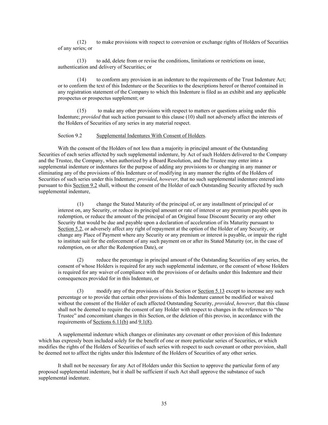 35 (12) to make provisions with respect to conversion or exchange rights of Holders of Securities of any series; or (13) to add, delete from or revise the conditions, limitations or restrictions on issue, authentication and delivery of Securities; or (14) to conform any provision in an indenture to the requirements of the Trust Indenture Act; or to conform the text of this Indenture or the Securities to the descriptions hereof or thereof contained in any registration statement of the Company to which this Indenture is filed as an exhibit and any applicable prospectus or prospectus supplement; or (15) to make any other provisions with respect to matters or questions arising under this Indenture; provided that such action pursuant to this clause (10) shall not adversely affect the interests of the Holders of Securities of any series in any material respect. Section 9.2 Supplemental Indentures With Consent of Holders. With the consent of the Holders of not less than a majority in principal amount of the Outstanding Securities of each series affected by such supplemental indenture, by Act of such Holders delivered to the Company and the Trustee, the Company, when authorized by a Board Resolution, and the Trustee may enter into a supplemental indenture or indentures for the purpose of adding any provisions to or changing in any manner or eliminating any of the provisions of this Indenture or of modifying in any manner the rights of the Holders of Securities of such series under this Indenture; provided, however, that no such supplemental indenture entered into pursuant to this Section 9.2 shall, without the consent of the Holder of each Outstanding Security affected by such supplemental indenture, (1) change the Stated Maturity of the principal of, or any installment of principal of or interest on, any Security, or reduce its principal amount or rate of interest or any premium payable upon its redemption, or reduce the amount of the principal of an Original Issue Discount Security or any other Security that would be due and payable upon a declaration of acceleration of its Maturity pursuant to Section 5.2, or adversely affect any right of repayment at the option of the Holder of any Security, or change any Place of Payment where any Security or any premium or interest is payable, or impair the right to institute suit for the enforcement of any such payment on or after its Stated Maturity (or, in the case of redemption, on or after the Redemption Date), or (2) reduce the percentage in principal amount of the Outstanding Securities of any series, the consent of whose Holders is required for any such supplemental indenture, or the consent of whose Holders is required for any waiver of compliance with the provisions of or defaults under this Indenture and their consequences provided for in this Indenture, or (3) modify any of the provisions of this Section or Section 5.13 except to increase any such percentage or to provide that certain other provisions of this Indenture cannot be modified or waived without the consent of the Holder of each affected Outstanding Security, provided, however, that this clause shall not be deemed to require the consent of any Holder with respect to changes in the references to “the Trustee” and concomitant changes in this Section, or the deletion of this proviso, in accordance with the requirements of Sections 6.11(b) and 9.1(8). A supplemental indenture which changes or eliminates any covenant or other provision of this Indenture which has expressly been included solely for the benefit of one or more particular series of Securities, or which modifies the rights of the Holders of Securities of such series with respect to such covenant or other provision, shall be deemed not to affect the rights under this Indenture of the Holders of Securities of any other series. It shall not be necessary for any Act of Holders under this Section to approve the particular form of any proposed supplemental indenture, but it shall be sufficient if such Act shall approve the substance of such supplemental indenture.