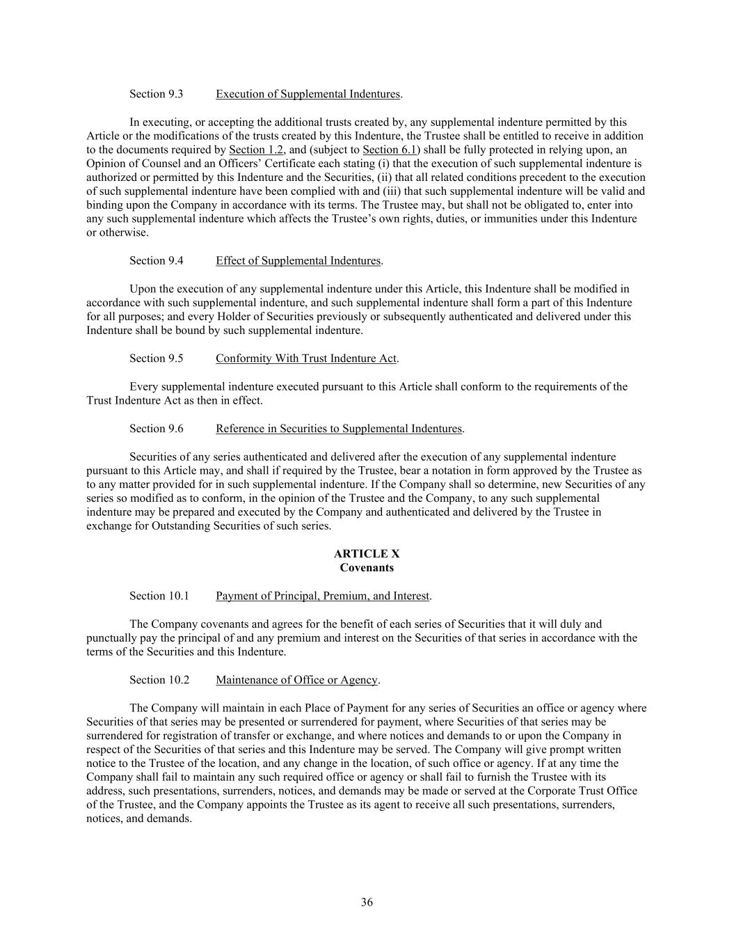 36 Section 9.3 Execution of Supplemental Indentures. In executing, or accepting the additional trusts created by, any supplemental indenture permitted by this Article or the modifications of the trusts created by this Indenture, the Trustee shall be entitled to receive in addition to the documents required by Section 1.2, and (subject to Section 6.1) shall be fully protected in relying upon, an Opinion of Counsel and an Officers’ Certificate each stating (i) that the execution of such supplemental indenture is authorized or permitted by this Indenture and the Securities, (ii) that all related conditions precedent to the execution of such supplemental indenture have been complied with and (iii) that such supplemental indenture will be valid and binding upon the Company in accordance with its terms. The Trustee may, but shall not be obligated to, enter into any such supplemental indenture which affects the Trustee’s own rights, duties, or immunities under this Indenture or otherwise. Section 9.4 Effect of Supplemental Indentures. Upon the execution of any supplemental indenture under this Article, this Indenture shall be modified in accordance with such supplemental indenture, and such supplemental indenture shall form a part of this Indenture for all purposes; and every Holder of Securities previously or subsequently authenticated and delivered under this Indenture shall be bound by such supplemental indenture. Section 9.5 Conformity With Trust Indenture Act. Every supplemental indenture executed pursuant to this Article shall conform to the requirements of the Trust Indenture Act as then in effect. Section 9.6 Reference in Securities to Supplemental Indentures. Securities of any series authenticated and delivered after the execution of any supplemental indenture pursuant to this Article may, and shall if required by the Trustee, bear a notation in form approved by the Trustee as to any matter provided for in such supplemental indenture. If the Company shall so determine, new Securities of any series so modified as to conform, in the opinion of the Trustee and the Company, to any such supplemental indenture may be prepared and executed by the Company and authenticated and delivered by the Trustee in exchange for Outstanding Securities of such series. ARTICLE X Covenants Section 10.1 Payment of Principal, Premium, and Interest. The Company covenants and agrees for the benefit of each series of Securities that it will duly and punctually pay the principal of and any premium and interest on the Securities of that series in accordance with the terms of the Securities and this Indenture. Section 10.2 Maintenance of Office or Agency. The Company will maintain in each Place of Payment for any series of Securities an office or agency where Securities of that series may be presented or surrendered for payment, where Securities of that series may be surrendered for registration of transfer or exchange, and where notices and demands to or upon the Company in respect of the Securities of that series and this Indenture may be served. The Company will give prompt written notice to the Trustee of the location, and any change in the location, of such office or agency. If at any time the Company shall fail to maintain any such required office or agency or shall fail to furnish the Trustee with its address, such presentations, surrenders, notices, and demands may be made or served at the Corporate Trust Office of the Trustee, and the Company appoints the Trustee as its agent to receive all such presentations, surrenders, notices, and demands.