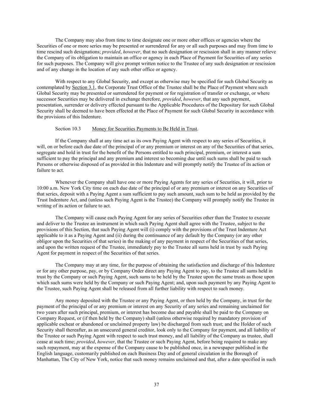 37 The Company may also from time to time designate one or more other offices or agencies where the Securities of one or more series may be presented or surrendered for any or all such purposes and may from time to time rescind such designations; provided, however, that no such designation or rescission shall in any manner relieve the Company of its obligation to maintain an office or agency in each Place of Payment for Securities of any series for such purposes. The Company will give prompt written notice to the Trustee of any such designation or rescission and of any change in the location of any such other office or agency. With respect to any Global Security, and except as otherwise may be specified for such Global Security as contemplated by Section 3.1, the Corporate Trust Office of the Trustee shall be the Place of Payment where such Global Security may be presented or surrendered for payment or for registration of transfer or exchange, or where successor Securities may be delivered in exchange therefore, provided, however, that any such payment, presentation, surrender or delivery effected pursuant to the Applicable Procedures of the Depositary for such Global Security shall be deemed to have been effected at the Place of Payment for such Global Security in accordance with the provisions of this Indenture. Section 10.3 Money for Securities Payments to Be Held in Trust. If the Company shall at any time act as its own Paying Agent with respect to any series of Securities, it will, on or before each due date of the principal of or any premium or interest on any of the Securities of that series, segregate and hold in trust for the benefit of the Persons entitled to such principal, premium, or interest a sum sufficient to pay the principal and any premium and interest so becoming due until such sums shall be paid to such Persons or otherwise disposed of as provided in this Indenture and will promptly notify the Trustee of its action or failure to act. Whenever the Company shall have one or more Paying Agents for any series of Securities, it will, prior to 10:00 a.m. New York City time on each due date of the principal of or any premium or interest on any Securities of that series, deposit with a Paying Agent a sum sufficient to pay such amount, such sum to be held as provided by the Trust Indenture Act, and (unless such Paying Agent is the Trustee) the Company will promptly notify the Trustee in writing of its action or failure to act. The Company will cause each Paying Agent for any series of Securities other than the Trustee to execute and deliver to the Trustee an instrument in which such Paying Agent shall agree with the Trustee, subject to the provisions of this Section, that such Paying Agent will (i) comply with the provisions of the Trust Indenture Act applicable to it as a Paying Agent and (ii) during the continuance of any default by the Company (or any other obligor upon the Securities of that series) in the making of any payment in respect of the Securities of that series, and upon the written request of the Trustee, immediately pay to the Trustee all sums held in trust by such Paying Agent for payment in respect of the Securities of that series. The Company may at any time, for the purpose of obtaining the satisfaction and discharge of this Indenture or for any other purpose, pay, or by Company Order direct any Paying Agent to pay, to the Trustee all sums held in trust by the Company or such Paying Agent, such sums to be held by the Trustee upon the same trusts as those upon which such sums were held by the Company or such Paying Agent; and, upon such payment by any Paying Agent to the Trustee, such Paying Agent shall be released from all further liability with respect to such money. Any money deposited with the Trustee or any Paying Agent, or then held by the Company, in trust for the payment of the principal of or any premium or interest on any Security of any series and remaining unclaimed for two years after such principal, premium, or interest has become due and payable shall be paid to the Company on Company Request, or (if then held by the Company) shall (unless otherwise required by mandatory provision of applicable escheat or abandoned or unclaimed property law) be discharged from such trust; and the Holder of such Security shall thereafter, as an unsecured general creditor, look only to the Company for payment, and all liability of the Trustee or such Paying Agent with respect to such trust money, and all liability of the Company as trustee, shall cease at such time; provided, however, that the Trustee or such Paying Agent, before being required to make any such repayment, may at the expense of the Company cause to be published once, in a newspaper published in the English language, customarily published on each Business Day and of general circulation in the Borough of Manhattan, The City of New York, notice that such money remains unclaimed and that, after a date specified in such
