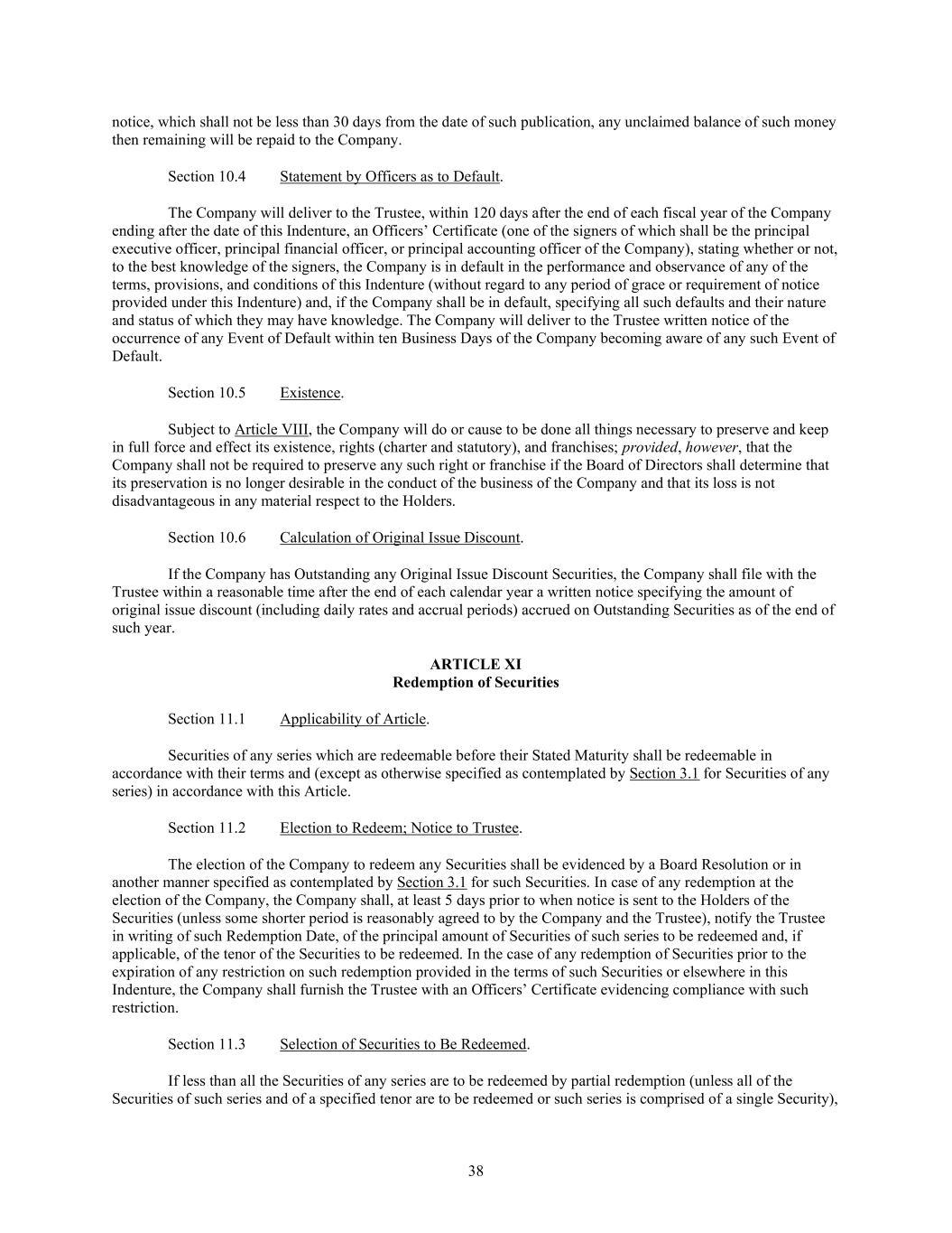 38 notice, which shall not be less than 30 days from the date of such publication, any unclaimed balance of such money then remaining will be repaid to the Company. Section 10.4 Statement by Officers as to Default. The Company will deliver to the Trustee, within 120 days after the end of each fiscal year of the Company ending after the date of this Indenture, an Officers’ Certificate (one of the signers of which shall be the principal executive officer, principal financial officer, or principal accounting officer of the Company), stating whether or not, to the best knowledge of the signers, the Company is in default in the performance and observance of any of the terms, provisions, and conditions of this Indenture (without regard to any period of grace or requirement of notice provided under this Indenture) and, if the Company shall be in default, specifying all such defaults and their nature and status of which they may have knowledge. The Company will deliver to the Trustee written notice of the occurrence of any Event of Default within ten Business Days of the Company becoming aware of any such Event of Default. Section 10.5 Existence. Subject to Article VIII, the Company will do or cause to be done all things necessary to preserve and keep in full force and effect its existence, rights (charter and statutory), and franchises; provided, however, that the Company shall not be required to preserve any such right or franchise if the Board of Directors shall determine that its preservation is no longer desirable in the conduct of the business of the Company and that its loss is not disadvantageous in any material respect to the Holders. Section 10.6 Calculation of Original Issue Discount. If the Company has Outstanding any Original Issue Discount Securities, the Company shall file with the Trustee within a reasonable time after the end of each calendar year a written notice specifying the amount of original issue discount (including daily rates and accrual periods) accrued on Outstanding Securities as of the end of such year. ARTICLE XI Redemption of Securities Section 11.1 Applicability of Article. Securities of any series which are redeemable before their Stated Maturity shall be redeemable in accordance with their terms and (except as otherwise specified as contemplated by Section 3.1 for Securities of any series) in accordance with this Article. Section 11.2 Election to Redeem; Notice to Trustee. The election of the Company to redeem any Securities shall be evidenced by a Board Resolution or in another manner specified as contemplated by Section 3.1 for such Securities. In case of any redemption at the election of the Company, the Company shall, at least 5 days prior to when notice is sent to the Holders of the Securities (unless some shorter period is reasonably agreed to by the Company and the Trustee), notify the Trustee in writing of such Redemption Date, of the principal amount of Securities of such series to be redeemed and, if applicable, of the tenor of the Securities to be redeemed. In the case of any redemption of Securities prior to the expiration of any restriction on such redemption provided in the terms of such Securities or elsewhere in this Indenture, the Company shall furnish the Trustee with an Officers’ Certificate evidencing compliance with such restriction. Section 11.3 Selection of Securities to Be Redeemed. If less than all the Securities of any series are to be redeemed by partial redemption (unless all of the Securities of such series and of a specified tenor are to be redeemed or such series is comprised of a single Security),