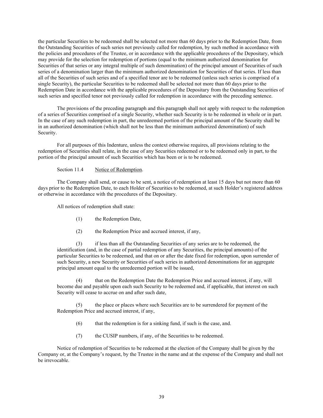 39 the particular Securities to be redeemed shall be selected not more than 60 days prior to the Redemption Date, from the Outstanding Securities of such series not previously called for redemption, by such method in accordance with the policies and procedures of the Trustee, or in accordance with the applicable procedures of the Depositary, which may provide for the selection for redemption of portions (equal to the minimum authorized denomination for Securities of that series or any integral multiple of such denomination) of the principal amount of Securities of such series of a denomination larger than the minimum authorized denomination for Securities of that series. If less than all of the Securities of such series and of a specified tenor are to be redeemed (unless such series is comprised of a single Security), the particular Securities to be redeemed shall be selected not more than 60 days prior to the Redemption Date in accordance with the applicable procedures of the Depositary from the Outstanding Securities of such series and specified tenor not previously called for redemption in accordance with the preceding sentence. The provisions of the preceding paragraph and this paragraph shall not apply with respect to the redemption of a series of Securities comprised of a single Security, whether such Security is to be redeemed in whole or in part. In the case of any such redemption in part, the unredeemed portion of the principal amount of the Security shall be in an authorized denomination (which shall not be less than the minimum authorized denomination) of such Security. For all purposes of this Indenture, unless the context otherwise requires, all provisions relating to the redemption of Securities shall relate, in the case of any Securities redeemed or to be redeemed only in part, to the portion of the principal amount of such Securities which has been or is to be redeemed. Section 11.4 Notice of Redemption. The Company shall send, or cause to be sent, a notice of redemption at least 15 days but not more than 60 days prior to the Redemption Date, to each Holder of Securities to be redeemed, at such Holder’s registered address or otherwise in accordance with the procedures of the Depositary. All notices of redemption shall state: (1) the Redemption Date, (2) the Redemption Price and accrued interest, if any, (3) if less than all the Outstanding Securities of any series are to be redeemed, the identification (and, in the case of partial redemption of any Securities, the principal amounts) of the particular Securities to be redeemed, and that on or after the date fixed for redemption, upon surrender of such Security, a new Security or Securities of such series in authorized denominations for an aggregate principal amount equal to the unredeemed portion will be issued, (4) that on the Redemption Date the Redemption Price and accrued interest, if any, will become due and payable upon each such Security to be redeemed and, if applicable, that interest on such Security will cease to accrue on and after such date, (5) the place or places where such Securities are to be surrendered for payment of the Redemption Price and accrued interest, if any, (6) that the redemption is for a sinking fund, if such is the case, and. (7) the CUSIP numbers, if any, of the Securities to be redeemed. Notice of redemption of Securities to be redeemed at the election of the Company shall be given by the Company or, at the Company’s request, by the Trustee in the name and at the expense of the Company and shall not be irrevocable.