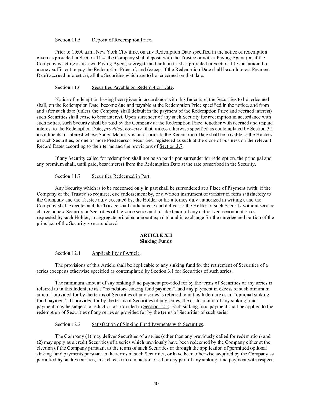 40 Section 11.5 Deposit of Redemption Price. Prior to 10:00 a.m., New York City time, on any Redemption Date specified in the notice of redemption given as provided in Section 11.4, the Company shall deposit with the Trustee or with a Paying Agent (or, if the Company is acting as its own Paying Agent, segregate and hold in trust as provided in Section 10.3) an amount of money sufficient to pay the Redemption Price of, and (except if the Redemption Date shall be an Interest Payment Date) accrued interest on, all the Securities which are to be redeemed on that date. Section 11.6 Securities Payable on Redemption Date. Notice of redemption having been given in accordance with this Indenture, the Securities to be redeemed shall, on the Redemption Date, become due and payable at the Redemption Price specified in the notice, and from and after such date (unless the Company shall default in the payment of the Redemption Price and accrued interest) such Securities shall cease to bear interest. Upon surrender of any such Security for redemption in accordance with such notice, such Security shall be paid by the Company at the Redemption Price, together with accrued and unpaid interest to the Redemption Date; provided, however, that, unless otherwise specified as contemplated by Section 3.1, installments of interest whose Stated Maturity is on or prior to the Redemption Date shall be payable to the Holders of such Securities, or one or more Predecessor Securities, registered as such at the close of business on the relevant Record Dates according to their terms and the provisions of Section 3.7. If any Security called for redemption shall not be so paid upon surrender for redemption, the principal and any premium shall, until paid, bear interest from the Redemption Date at the rate prescribed in the Security. Section 11.7 Securities Redeemed in Part. Any Security which is to be redeemed only in part shall be surrendered at a Place of Payment (with, if the Company or the Trustee so requires, due endorsement by, or a written instrument of transfer in form satisfactory to the Company and the Trustee duly executed by, the Holder or his attorney duly authorized in writing), and the Company shall execute, and the Trustee shall authenticate and deliver to the Holder of such Security without service charge, a new Security or Securities of the same series and of like tenor, of any authorized denomination as requested by such Holder, in aggregate principal amount equal to and in exchange for the unredeemed portion of the principal of the Security so surrendered. ARTICLE XII Sinking Funds Section 12.1 Applicability of Article. The provisions of this Article shall be applicable to any sinking fund for the retirement of Securities of a series except as otherwise specified as contemplated by Section 3.1 for Securities of such series. The minimum amount of any sinking fund payment provided for by the terms of Securities of any series is referred to in this Indenture as a “mandatory sinking fund payment”, and any payment in excess of such minimum amount provided for by the terms of Securities of any series is referred to in this Indenture as an “optional sinking fund payment”. If provided for by the terms of Securities of any series, the cash amount of any sinking fund payment may be subject to reduction as provided in Section 12.2. Each sinking fund payment shall be applied to the redemption of Securities of any series as provided for by the terms of Securities of such series. Section 12.2 Satisfaction of Sinking Fund Payments with Securities. The Company (1) may deliver Securities of a series (other than any previously called for redemption) and (2) may apply as a credit Securities of a series which previously have been redeemed by the Company either at the election of the Company pursuant to the terms of such Securities or through the application of permitted optional sinking fund payments pursuant to the terms of such Securities, or have been otherwise acquired by the Company as permitted by such Securities, in each case in satisfaction of all or any part of any sinking fund payment with respect