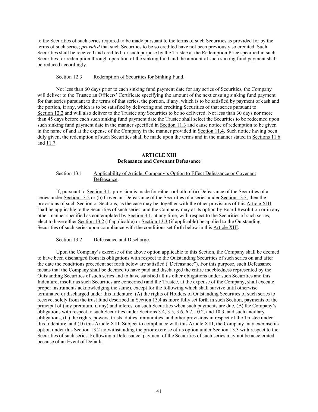 41 to the Securities of such series required to be made pursuant to the terms of such Securities as provided for by the terms of such series; provided that such Securities to be so credited have not been previously so credited. Such Securities shall be received and credited for such purpose by the Trustee at the Redemption Price specified in such Securities for redemption through operation of the sinking fund and the amount of such sinking fund payment shall be reduced accordingly. Section 12.3 Redemption of Securities for Sinking Fund. Not less than 60 days prior to each sinking fund payment date for any series of Securities, the Company will deliver to the Trustee an Officers’ Certificate specifying the amount of the next ensuing sinking fund payment for that series pursuant to the terms of that series, the portion, if any, which is to be satisfied by payment of cash and the portion, if any, which is to be satisfied by delivering and crediting Securities of that series pursuant to Section 12.2 and will also deliver to the Trustee any Securities to be so delivered. Not less than 30 days nor more than 45 days before each such sinking fund payment date the Trustee shall select the Securities to be redeemed upon such sinking fund payment date in the manner specified in Section 11.3 and cause notice of redemption to be given in the name of and at the expense of the Company in the manner provided in Section 11.4. Such notice having been duly given, the redemption of such Securities shall be made upon the terms and in the manner stated in Sections 11.6 and 11.7. ARTICLE XIII Defeasance and Covenant Defeasance Section 13.1 Applicability of Article; Company’s Option to Effect Defeasance or Covenant Defeasance. If, pursuant to Section 3.1, provision is made for either or both of (a) Defeasance of the Securities of a series under Section 13.2 or (b) Covenant Defeasance of the Securities of a series under Section 13.3, then the provisions of such Section or Sections, as the case may be, together with the other provisions of this Article XIII, shall be applicable to the Securities of such series, and the Company may at its option by Board Resolution or in any other manner specified as contemplated by Section 3.1, at any time, with respect to the Securities of such series, elect to have either Section 13.2 (if applicable) or Section 13.3 (if applicable) be applied to the Outstanding Securities of such series upon compliance with the conditions set forth below in this Article XIII. Section 13.2 Defeasance and Discharge. Upon the Company’s exercise of the above option applicable to this Section, the Company shall be deemed to have been discharged from its obligations with respect to the Outstanding Securities of such series on and after the date the conditions precedent set forth below are satisfied (“Defeasance”). For this purpose, such Defeasance means that the Company shall be deemed to have paid and discharged the entire indebtedness represented by the Outstanding Securities of such series and to have satisfied all its other obligations under such Securities and this Indenture, insofar as such Securities are concerned (and the Trustee, at the expense of the Company, shall execute proper instruments acknowledging the same), except for the following which shall survive until otherwise terminated or discharged under this Indenture: (A) the rights of Holders of Outstanding Securities of such series to receive, solely from the trust fund described in Section 13.4 as more fully set forth in such Section, payments of the principal of (any premium, if any) and interest on such Securities when such payments are due, (B) the Company’s obligations with respect to such Securities under Sections 3.4, 3.5, 3.6, 6.7, 10.2, and 10.3, and such ancillary obligations, (C) the rights, powers, trusts, duties, immunities, and other provisions in respect of the Trustee under this Indenture, and (D) this Article XIII. Subject to compliance with this Article XIII, the Company may exercise its option under this Section 13.2 notwithstanding the prior exercise of its option under Section 13.3 with respect to the Securities of such series. Following a Defeasance, payment of the Securities of such series may not be accelerated because of an Event of Default.