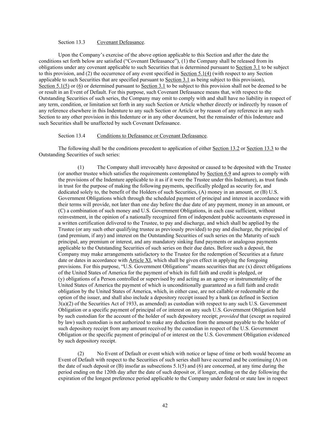 42 Section 13.3 Covenant Defeasance. Upon the Company’s exercise of the above option applicable to this Section and after the date the conditions set forth below are satisfied (“Covenant Defeasance”), (1) the Company shall be released from its obligations under any covenant applicable to such Securities that is determined pursuant to Section 3.1 to be subject to this provision, and (2) the occurrence of any event specified in Section 5.1(4) (with respect to any Section applicable to such Securities that are specified pursuant to Section 3.1 as being subject to this provision), Section 5.1(5) or (6) or determined pursuant to Section 3.1 to be subject to this provision shall not be deemed to be or result in an Event of Default. For this purpose, such Covenant Defeasance means that, with respect to the Outstanding Securities of such series, the Company may omit to comply with and shall have no liability in respect of any term, condition, or limitation set forth in any such Section or Article whether directly or indirectly by reason of any reference elsewhere in this Indenture to any such Section or Article or by reason of any reference in any such Section to any other provision in this Indenture or in any other document, but the remainder of this Indenture and such Securities shall be unaffected by such Covenant Defeasance. Section 13.4 Conditions to Defeasance or Covenant Defeasance. The following shall be the conditions precedent to application of either Section 13.2 or Section 13.3 to the Outstanding Securities of such series: (1) The Company shall irrevocably have deposited or caused to be deposited with the Trustee (or another trustee which satisfies the requirements contemplated by Section 6.9 and agrees to comply with the provisions of the Indenture applicable to it as if it were the Trustee under this Indenture), as trust funds in trust for the purpose of making the following payments, specifically pledged as security for, and dedicated solely to, the benefit of the Holders of such Securities, (A) money in an amount, or (B) U.S. Government Obligations which through the scheduled payment of principal and interest in accordance with their terms will provide, not later than one day before the due date of any payment, money in an amount, or (C) a combination of such money and U.S. Government Obligations, in each case sufficient, without reinvestment, in the opinion of a nationally recognized firm of independent public accountants expressed in a written certification delivered to the Trustee, to pay and discharge, and which shall be applied by the Trustee (or any such other qualifying trustee as previously provided) to pay and discharge, the principal of (and premium, if any) and interest on the Outstanding Securities of such series on the Maturity of such principal, any premium or interest, and any mandatory sinking fund payments or analogous payments applicable to the Outstanding Securities of such series on their due dates. Before such a deposit, the Company may make arrangements satisfactory to the Trustee for the redemption of Securities at a future date or dates in accordance with Article XI, which shall be given effect in applying the foregoing provisions. For this purpose, “U.S. Government Obligations” means securities that are (x) direct obligations of the United States of America for the payment of which its full faith and credit is pledged, or (y) obligations of a Person controlled or supervised by and acting as an agency or instrumentality of the United States of America the payment of which is unconditionally guaranteed as a full faith and credit obligation by the United States of America, which, in either case, are not callable or redeemable at the option of the issuer, and shall also include a depository receipt issued by a bank (as defined in Section 3(a)(2) of the Securities Act of 1933, as amended) as custodian with respect to any such U.S. Government Obligation or a specific payment of principal of or interest on any such U.S. Government Obligation held by such custodian for the account of the holder of such depository receipt; provided that (except as required by law) such custodian is not authorized to make any deduction from the amount payable to the holder of such depository receipt from any amount received by the custodian in respect of the U.S. Government Obligation or the specific payment of principal of or interest on the U.S. Government Obligation evidenced by such depository receipt. (2) No Event of Default or event which with notice or lapse of time or both would become an Event of Default with respect to the Securities of such series shall have occurred and be continuing (A) on the date of such deposit or (B) insofar as subsections 5.1(5) and (6) are concerned, at any time during the period ending on the 120th day after the date of such deposit or, if longer, ending on the day following the expiration of the longest preference period applicable to the Company under federal or state law in respect
