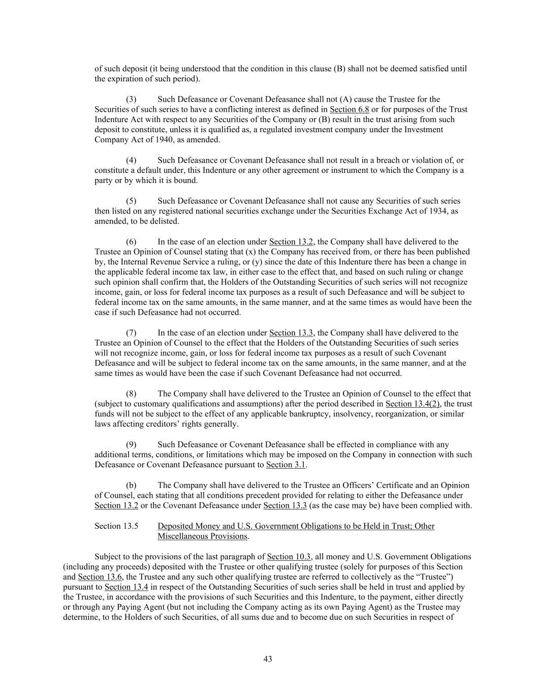 43 of such deposit (it being understood that the condition in this clause (B) shall not be deemed satisfied until the expiration of such period). (3) Such Defeasance or Covenant Defeasance shall not (A) cause the Trustee for the Securities of such series to have a conflicting interest as defined in Section 6.8 or for purposes of the Trust Indenture Act with respect to any Securities of the Company or (B) result in the trust arising from such deposit to constitute, unless it is qualified as, a regulated investment company under the Investment Company Act of 1940, as amended. (4) Such Defeasance or Covenant Defeasance shall not result in a breach or violation of, or constitute a default under, this Indenture or any other agreement or instrument to which the Company is a party or by which it is bound. (5) Such Defeasance or Covenant Defeasance shall not cause any Securities of such series then listed on any registered national securities exchange under the Securities Exchange Act of 1934, as amended, to be delisted. (6) In the case of an election under Section 13.2, the Company shall have delivered to the Trustee an Opinion of Counsel stating that (x) the Company has received from, or there has been published by, the Internal Revenue Service a ruling, or (y) since the date of this Indenture there has been a change in the applicable federal income tax law, in either case to the effect that, and based on such ruling or change such opinion shall confirm that, the Holders of the Outstanding Securities of such series will not recognize income, gain, or loss for federal income tax purposes as a result of such Defeasance and will be subject to federal income tax on the same amounts, in the same manner, and at the same times as would have been the case if such Defeasance had not occurred. (7) In the case of an election under Section 13.3, the Company shall have delivered to the Trustee an Opinion of Counsel to the effect that the Holders of the Outstanding Securities of such series will not recognize income, gain, or loss for federal income tax purposes as a result of such Covenant Defeasance and will be subject to federal income tax on the same amounts, in the same manner, and at the same times as would have been the case if such Covenant Defeasance had not occurred. (8) The Company shall have delivered to the Trustee an Opinion of Counsel to the effect that (subject to customary qualifications and assumptions) after the period described in Section 13.4(2), the trust funds will not be subject to the effect of any applicable bankruptcy, insolvency, reorganization, or similar laws affecting creditors’ rights generally. (9) Such Defeasance or Covenant Defeasance shall be effected in compliance with any additional terms, conditions, or limitations which may be imposed on the Company in connection with such Defeasance or Covenant Defeasance pursuant to Section 3.1. (b) The Company shall have delivered to the Trustee an Officers’ Certificate and an Opinion of Counsel, each stating that all conditions precedent provided for relating to either the Defeasance under Section 13.2 or the Covenant Defeasance under Section 13.3 (as the case may be) have been complied with. Section 13.5 Deposited Money and U.S. Government Obligations to be Held in Trust; Other Miscellaneous Provisions. Subject to the provisions of the last paragraph of Section 10.3, all money and U.S. Government Obligations (including any proceeds) deposited with the Trustee or other qualifying trustee (solely for purposes of this Section and Section 13.6, the Trustee and any such other qualifying trustee are referred to collectively as the “Trustee”) pursuant to Section 13.4 in respect of the Outstanding Securities of such series shall be held in trust and applied by the Trustee, in accordance with the provisions of such Securities and this Indenture, to the payment, either directly or through any Paying Agent (but not including the Company acting as its own Paying Agent) as the Trustee may determine, to the Holders of such Securities, of all sums due and to become due on such Securities in respect of