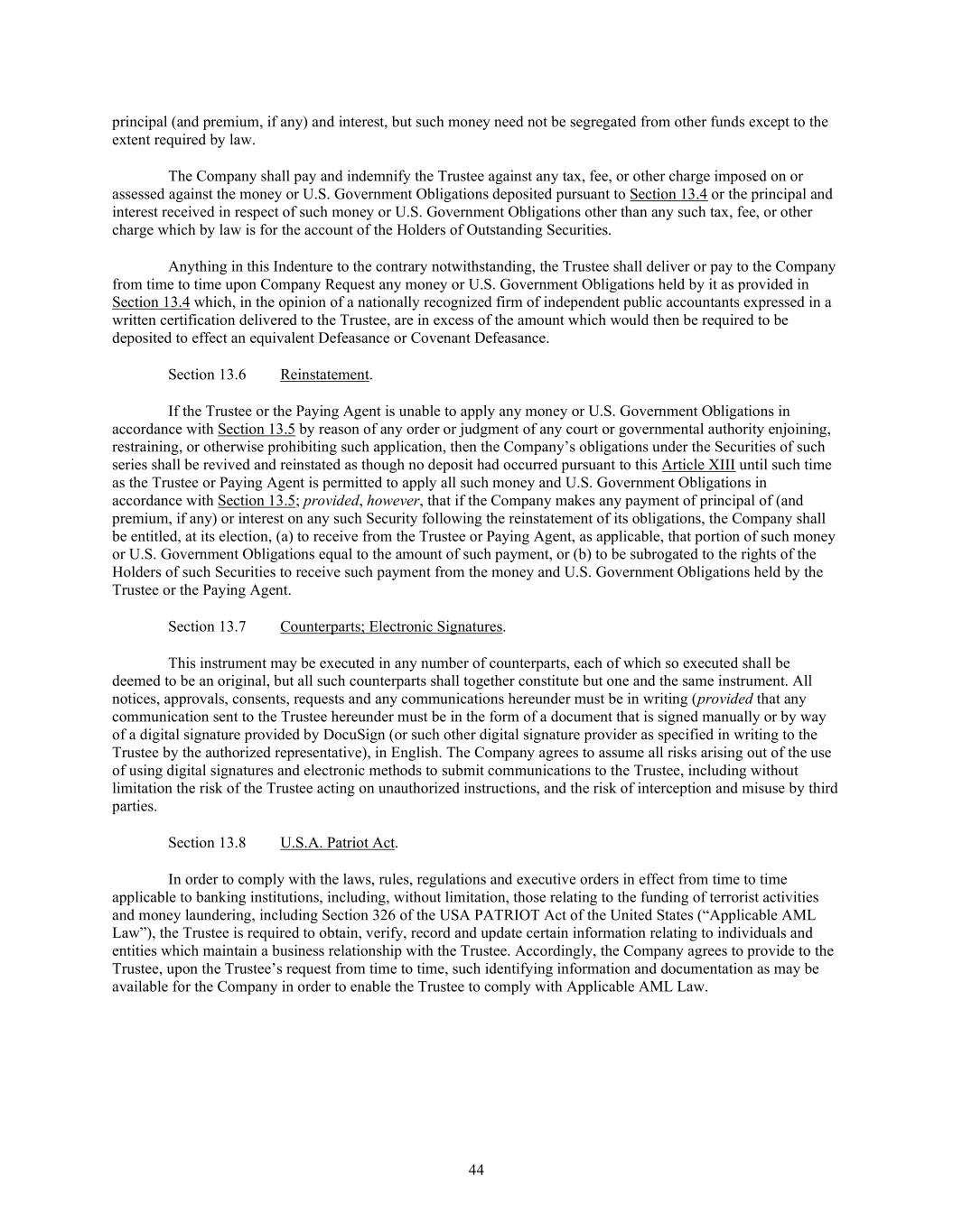 44 principal (and premium, if any) and interest, but such money need not be segregated from other funds except to the extent required by law. The Company shall pay and indemnify the Trustee against any tax, fee, or other charge imposed on or assessed against the money or U.S. Government Obligations deposited pursuant to Section 13.4 or the principal and interest received in respect of such money or U.S. Government Obligations other than any such tax, fee, or other charge which by law is for the account of the Holders of Outstanding Securities. Anything in this Indenture to the contrary notwithstanding, the Trustee shall deliver or pay to the Company from time to time upon Company Request any money or U.S. Government Obligations held by it as provided in Section 13.4 which, in the opinion of a nationally recognized firm of independent public accountants expressed in a written certification delivered to the Trustee, are in excess of the amount which would then be required to be deposited to effect an equivalent Defeasance or Covenant Defeasance. Section 13.6 Reinstatement. If the Trustee or the Paying Agent is unable to apply any money or U.S. Government Obligations in accordance with Section 13.5 by reason of any order or judgment of any court or governmental authority enjoining, restraining, or otherwise prohibiting such application, then the Company’s obligations under the Securities of such series shall be revived and reinstated as though no deposit had occurred pursuant to this Article XIII until such time as the Trustee or Paying Agent is permitted to apply all such money and U.S. Government Obligations in accordance with Section 13.5; provided, however, that if the Company makes any payment of principal of (and premium, if any) or interest on any such Security following the reinstatement of its obligations, the Company shall be entitled, at its election, (a) to receive from the Trustee or Paying Agent, as applicable, that portion of such money or U.S. Government Obligations equal to the amount of such payment, or (b) to be subrogated to the rights of the Holders of such Securities to receive such payment from the money and U.S. Government Obligations held by the Trustee or the Paying Agent. Section 13.7 Counterparts; Electronic Signatures. This instrument may be executed in any number of counterparts, each of which so executed shall be deemed to be an original, but all such counterparts shall together constitute but one and the same instrument. All notices, approvals, consents, requests and any communications hereunder must be in writing (provided that any communication sent to the Trustee hereunder must be in the form of a document that is signed manually or by way of a digital signature provided by DocuSign (or such other digital signature provider as specified in writing to the Trustee by the authorized representative), in English. The Company agrees to assume all risks arising out of the use of using digital signatures and electronic methods to submit communications to the Trustee, including without limitation the risk of the Trustee acting on unauthorized instructions, and the risk of interception and misuse by third parties. Section 13.8 U.S.A. Patriot Act. In order to comply with the laws, rules, regulations and executive orders in effect from time to time applicable to banking institutions, including, without limitation, those relating to the funding of terrorist activities and money laundering, including Section 326 of the USA PATRIOT Act of the United States (“Applicable AML Law”), the Trustee is required to obtain, verify, record and update certain information relating to individuals and entities which maintain a business relationship with the Trustee. Accordingly, the Company agrees to provide to the Trustee, upon the Trustee’s request from time to time, such identifying information and documentation as may be available for the Company in order to enable the Trustee to comply with Applicable AML Law.