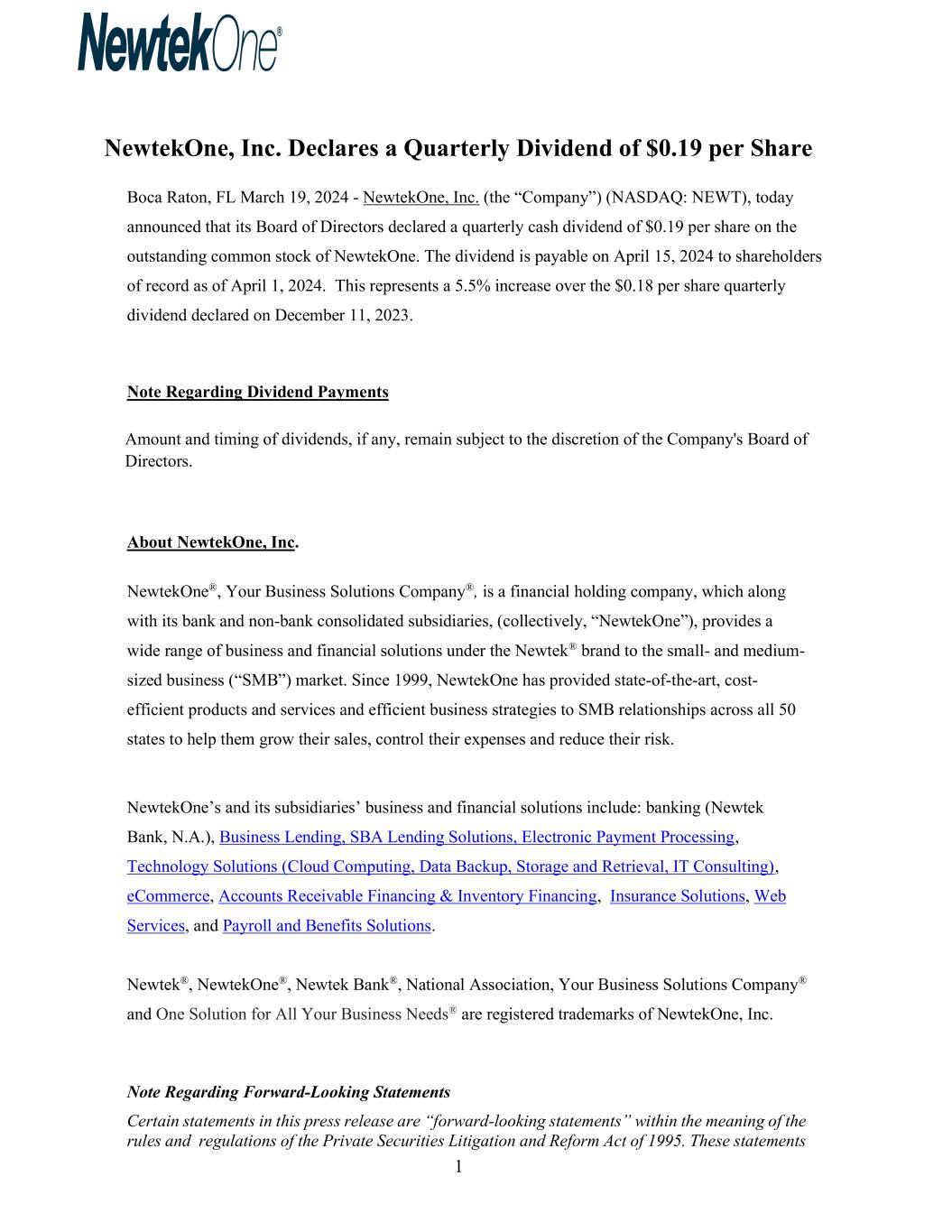 1 NewtekOne, Inc. Declares a Quarterly Dividend of $0.19 per Share Boca Raton, FL March 19, 2024 - NewtekOne, Inc. (the “Company”) (NASDAQ: NEWT), today announced that its Board of Directors declared a quarterly cash dividend of $0.19 per share on the outstanding common stock of NewtekOne. The dividend is payable on April 15, 2024 to shareholders of record as of April 1, 2024. This represents a 5.5% increase over the $0.18 per share quarterly dividend declared on December 11, 2023. Note Regarding Dividend Payments Amount and timing of dividends, if any, remain subject to the discretion of the Company's Board of Directors. About NewtekOne, Inc. NewtekOne®, Your Business Solutions Company®, is a financial holding company, which along with its bank and non-bank consolidated subsidiaries, (collectively, “NewtekOne”), provides a wide range of business and financial solutions under the Newtek® brand to the small- and medium- sized business (“SMB”) market. Since 1999, NewtekOne has provided state-of-the-art, cost- efficient products and services and efficient business strategies to SMB relationships across all 50 states to help them grow their sales, control their expenses and reduce their risk. NewtekOne’s and its subsidiaries’ business and financial solutions include: banking (Newtek Bank, N.A.), Business Lending, SBA Lending Solutions, Electronic Payment Processing, Technology Solutions (Cloud Computing, Data Backup, Storage and Retrieval, IT Consulting), eCommerce, Accounts Receivable Financing & Inventory Financing, Insurance Solutions, Web Services, and Payroll and Benefits Solutions. Newtek®, NewtekOne®, Newtek Bank®, National Association, Your Business Solutions Company® and One Solution for All Your Business Needs® are registered trademarks of NewtekOne, Inc. Note Regarding Forward-Looking Statements Certain statements in this press release are “forward-looking statements” within the meaning of the rules and regulations of the Private Securities Litigation and Reform Act of 1995. These statements