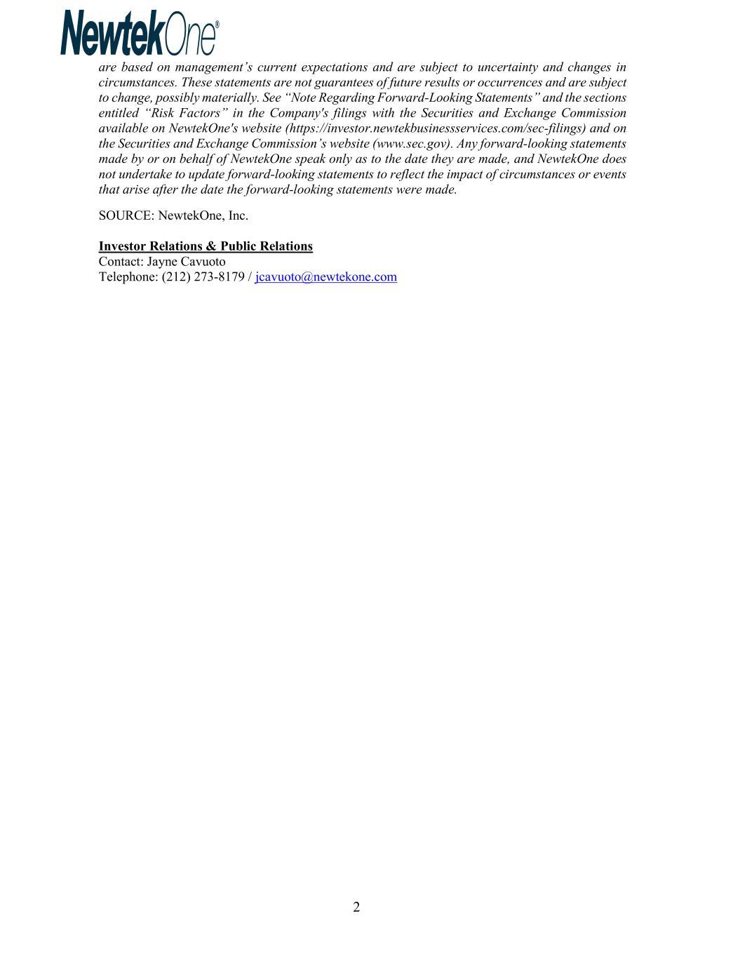 2 are based on management’s current expectations and are subject to uncertainty and changes in circumstances. These statements are not guarantees of future results or occurrences and are subject to change, possibly materially. See “Note Regarding Forward-Looking Statements” and the sections entitled “Risk Factors” in the Company's filings with the Securities and Exchange Commission available on NewtekOne's website (https://investor.newtekbusinessservices.com/sec-filings) and on the Securities and Exchange Commission’s website (www.sec.gov). Any forward-looking statements made by or on behalf of NewtekOne speak only as to the date they are made, and NewtekOne does not undertake to update forward-looking statements to reflect the impact of circumstances or events that arise after the date the forward-looking statements were made. SOURCE: NewtekOne, Inc. Investor Relations & Public Relations Contact: Jayne Cavuoto Telephone: (212) 273-8179 / jcavuoto@newtekone.com