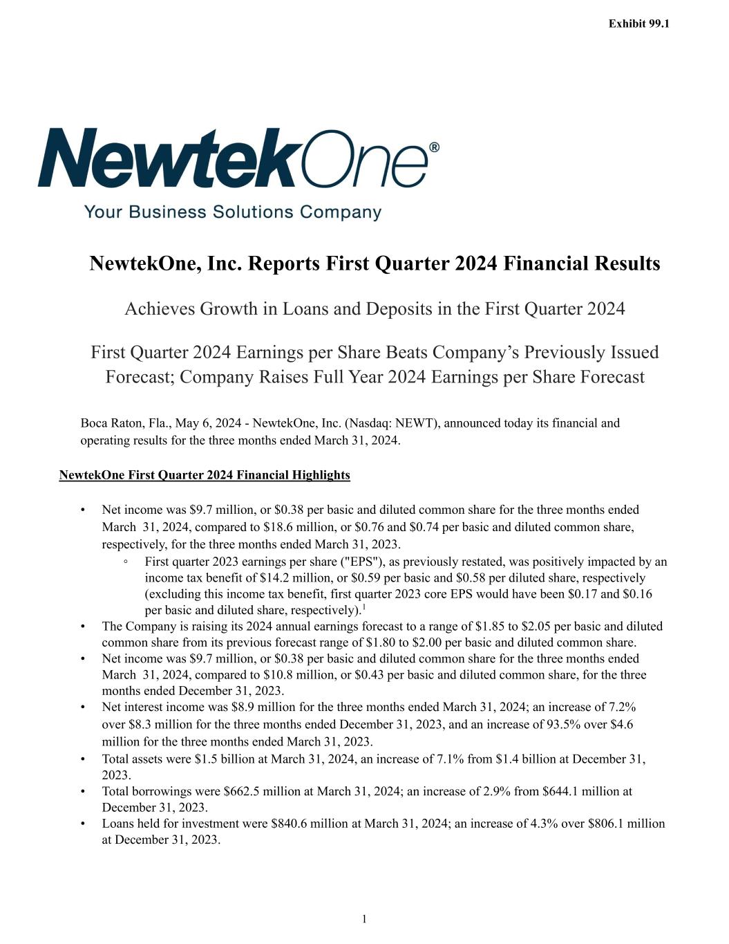 Exhibit 99.1 1 NewtekOne, Inc. Reports First Quarter 2024 Financial Results Achieves Growth in Loans and Deposits in the First Quarter 2024 First Quarter 2024 Earnings per Share Beats Company’s Previously Issued Forecast; Company Raises Full Year 2024 Earnings per Share Forecast Boca Raton, Fla., May 6, 2024 - NewtekOne, Inc. (Nasdaq: NEWT), announced today its financial and operating results for the three months ended March 31, 2024. NewtekOne First Quarter 2024 Financial Highlights • Net income was $9.7 million, or $0.38 per basic and diluted common share for the three months ended March 31, 2024, compared to $18.6 million, or $0.76 and $0.74 per basic and diluted common share, respectively, for the three months ended March 31, 2023. ◦ First quarter 2023 earnings per share ("EPS"), as previously restated, was positively impacted by an income tax benefit of $14.2 million, or $0.59 per basic and $0.58 per diluted share, respectively (excluding this income tax benefit, first quarter 2023 core EPS would have been $0.17 and $0.16 per basic and diluted share, respectively).1 • The Company is raising its 2024 annual earnings forecast to a range of $1.85 to $2.05 per basic and diluted common share from its previous forecast range of $1.80 to $2.00 per basic and diluted common share. • Net income was $9.7 million, or $0.38 per basic and diluted common share for the three months ended March 31, 2024, compared to $10.8 million, or $0.43 per basic and diluted common share, for the three months ended December 31, 2023. • Net interest income was $8.9 million for the three months ended March 31, 2024; an increase of 7.2% over $8.3 million for the three months ended December 31, 2023, and an increase of 93.5% over $4.6 million for the three months ended March 31, 2023. • Total assets were $1.5 billion at March 31, 2024, an increase of 7.1% from $1.4 billion at December 31, 2023. • Total borrowings were $662.5 million at March 31, 2024; an increase of 2.9% from $644.1 million at December 31, 2023. • Loans held for investment were $840.6 million at March 31, 2024; an increase of 4.3% over $806.1 million at December 31, 2023.