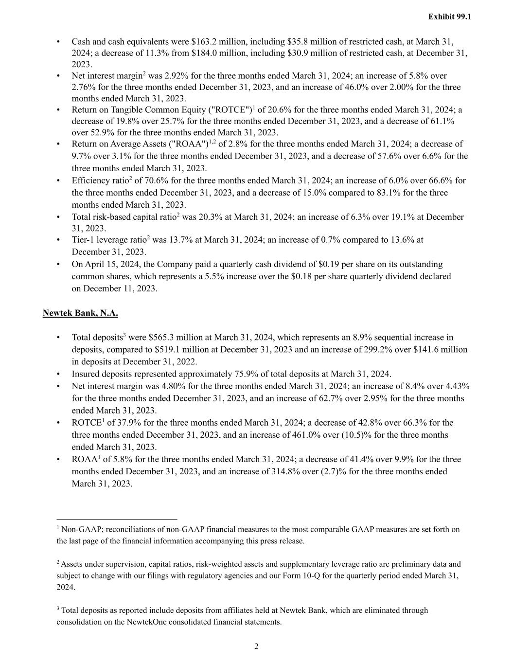 Exhibit 99.1 2 • Cash and cash equivalents were $163.2 million, including $35.8 million of restricted cash, at March 31, 2024; a decrease of 11.3% from $184.0 million, including $30.9 million of restricted cash, at December 31, 2023. • Net interest margin2 was 2.92% for the three months ended March 31, 2024; an increase of 5.8% over 2.76% for the three months ended December 31, 2023, and an increase of 46.0% over 2.00% for the three months ended March 31, 2023. • Return on Tangible Common Equity ("ROTCE")1 of 20.6% for the three months ended March 31, 2024; a decrease of 19.8% over 25.7% for the three months ended December 31, 2023, and a decrease of 61.1% over 52.9% for the three months ended March 31, 2023. • Return on Average Assets ("ROAA")1,2 of 2.8% for the three months ended March 31, 2024; a decrease of 9.7% over 3.1% for the three months ended December 31, 2023, and a decrease of 57.6% over 6.6% for the three months ended March 31, 2023. • Efficiency ratio2 of 70.6% for the three months ended March 31, 2024; an increase of 6.0% over 66.6% for the three months ended December 31, 2023, and a decrease of 15.0% compared to 83.1% for the three months ended March 31, 2023. • Total risk-based capital ratio2 was 20.3% at March 31, 2024; an increase of 6.3% over 19.1% at December 31, 2023. • Tier-1 leverage ratio2 was 13.7% at March 31, 2024; an increase of 0.7% compared to 13.6% at December 31, 2023. • On April 15, 2024, the Company paid a quarterly cash dividend of $0.19 per share on its outstanding common shares, which represents a 5.5% increase over the $0.18 per share quarterly dividend declared on December 11, 2023. Newtek Bank, N.A. • Total deposits3 were $565.3 million at March 31, 2024, which represents an 8.9% sequential increase in deposits, compared to $519.1 million at December 31, 2023 and an increase of 299.2% over $141.6 million in deposits at December 31, 2022. • Insured deposits represented approximately 75.9% of total deposits at March 31, 2024. • Net interest margin was 4.80% for the three months ended March 31, 2024; an increase of 8.4% over 4.43% for the three months ended December 31, 2023, and an increase of 62.7% over 2.95% for the three months ended March 31, 2023. • ROTCE1 of 37.9% for the three months ended March 31, 2024; a decrease of 42.8% over 66.3% for the three months ended December 31, 2023, and an increase of 461.0% over (10.5)% for the three months ended March 31, 2023. • ROAA1 of 5.8% for the three months ended March 31, 2024; a decrease of 41.4% over 9.9% for the three months ended December 31, 2023, and an increase of 314.8% over (2.7)% for the three months ended March 31, 2023. 1 Non-GAAP; reconciliations of non-GAAP financial measures to the most comparable GAAP measures are set forth on the last page of the financial information accompanying this press release. 2 Assets under supervision, capital ratios, risk-weighted assets and supplementary leverage ratio are preliminary data and subject to change with our filings with regulatory agencies and our Form 10-Q for the quarterly period ended March 31, 2024. 3 Total deposits as reported include deposits from affiliates held at Newtek Bank, which are eliminated through consolidation on the NewtekOne consolidated financial statements.