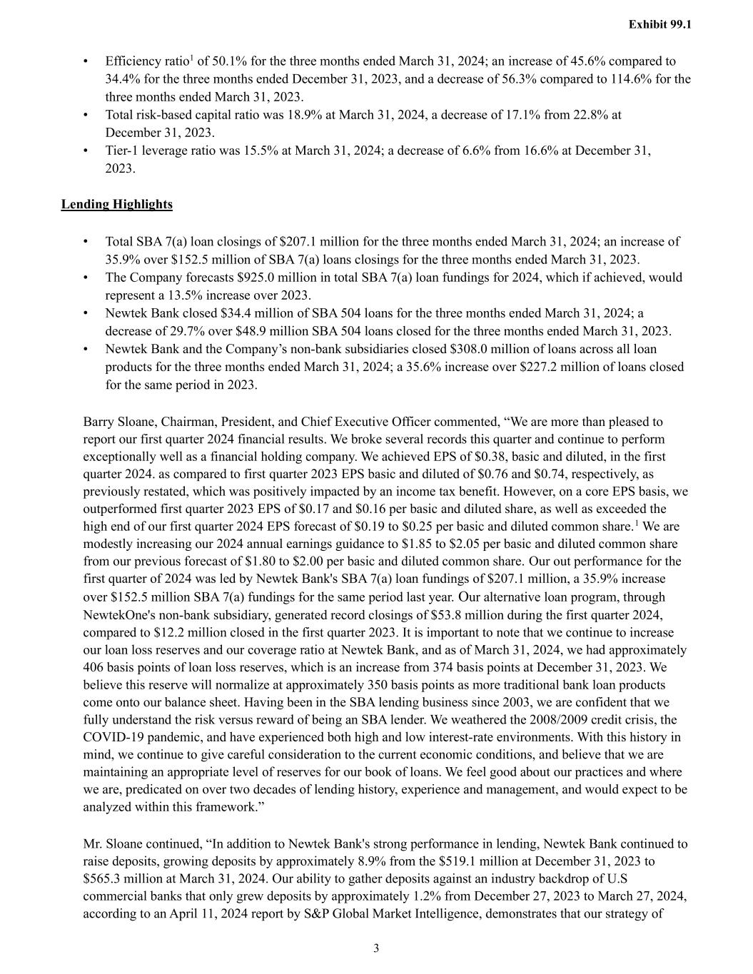 Exhibit 99.1 3 • Efficiency ratio1 of 50.1% for the three months ended March 31, 2024; an increase of 45.6% compared to 34.4% for the three months ended December 31, 2023, and a decrease of 56.3% compared to 114.6% for the three months ended March 31, 2023. • Total risk-based capital ratio was 18.9% at March 31, 2024, a decrease of 17.1% from 22.8% at December 31, 2023. • Tier-1 leverage ratio was 15.5% at March 31, 2024; a decrease of 6.6% from 16.6% at December 31, 2023. Lending Highlights • Total SBA 7(a) loan closings of $207.1 million for the three months ended March 31, 2024; an increase of 35.9% over $152.5 million of SBA 7(a) loans closings for the three months ended March 31, 2023. • The Company forecasts $925.0 million in total SBA 7(a) loan fundings for 2024, which if achieved, would represent a 13.5% increase over 2023. • Newtek Bank closed $34.4 million of SBA 504 loans for the three months ended March 31, 2024; a decrease of 29.7% over $48.9 million SBA 504 loans closed for the three months ended March 31, 2023. • Newtek Bank and the Company’s non-bank subsidiaries closed $308.0 million of loans across all loan products for the three months ended March 31, 2024; a 35.6% increase over $227.2 million of loans closed for the same period in 2023. Barry Sloane, Chairman, President, and Chief Executive Officer commented, “We are more than pleased to report our first quarter 2024 financial results. We broke several records this quarter and continue to perform exceptionally well as a financial holding company. We achieved EPS of $0.38, basic and diluted, in the first quarter 2024. as compared to first quarter 2023 EPS basic and diluted of $0.76 and $0.74, respectively, as previously restated, which was positively impacted by an income tax benefit. However, on a core EPS basis, we outperformed first quarter 2023 EPS of $0.17 and $0.16 per basic and diluted share, as well as exceeded the high end of our first quarter 2024 EPS forecast of $0.19 to $0.25 per basic and diluted common share.1 We are modestly increasing our 2024 annual earnings guidance to $1.85 to $2.05 per basic and diluted common share from our previous forecast of $1.80 to $2.00 per basic and diluted common share. Our out performance for the first quarter of 2024 was led by Newtek Bank's SBA 7(a) loan fundings of $207.1 million, a 35.9% increase over $152.5 million SBA 7(a) fundings for the same period last year. Our alternative loan program, through NewtekOne's non-bank subsidiary, generated record closings of $53.8 million during the first quarter 2024, compared to $12.2 million closed in the first quarter 2023. It is important to note that we continue to increase our loan loss reserves and our coverage ratio at Newtek Bank, and as of March 31, 2024, we had approximately 406 basis points of loan loss reserves, which is an increase from 374 basis points at December 31, 2023. We believe this reserve will normalize at approximately 350 basis points as more traditional bank loan products come onto our balance sheet. Having been in the SBA lending business since 2003, we are confident that we fully understand the risk versus reward of being an SBA lender. We weathered the 2008/2009 credit crisis, the COVID-19 pandemic, and have experienced both high and low interest-rate environments. With this history in mind, we continue to give careful consideration to the current economic conditions, and believe that we are maintaining an appropriate level of reserves for our book of loans. We feel good about our practices and where we are, predicated on over two decades of lending history, experience and management, and would expect to be analyzed within this framework.” Mr. Sloane continued, “In addition to Newtek Bank's strong performance in lending, Newtek Bank continued to raise deposits, growing deposits by approximately 8.9% from the $519.1 million at December 31, 2023 to $565.3 million at March 31, 2024. Our ability to gather deposits against an industry backdrop of U.S commercial banks that only grew deposits by approximately 1.2% from December 27, 2023 to March 27, 2024, according to an April 11, 2024 report by S&P Global Market Intelligence, demonstrates that our strategy of