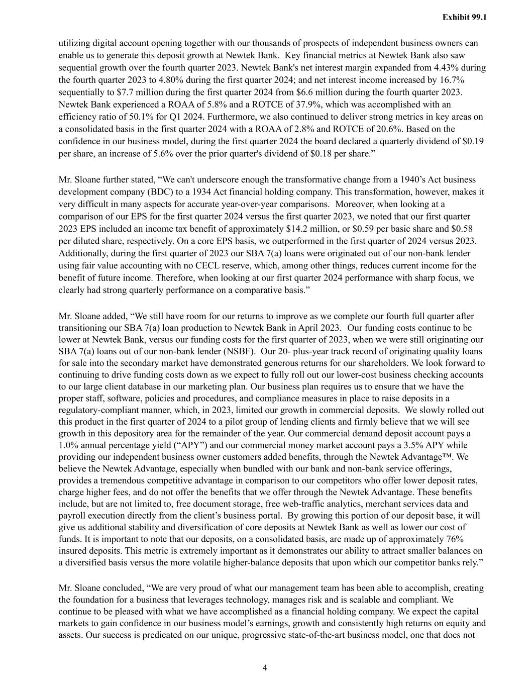 Exhibit 99.1 4 utilizing digital account opening together with our thousands of prospects of independent business owners can enable us to generate this deposit growth at Newtek Bank. Key financial metrics at Newtek Bank also saw sequential growth over the fourth quarter 2023. Newtek Bank's net interest margin expanded from 4.43% during the fourth quarter 2023 to 4.80% during the first quarter 2024; and net interest income increased by 16.7% sequentially to $7.7 million during the first quarter 2024 from $6.6 million during the fourth quarter 2023. Newtek Bank experienced a ROAA of 5.8% and a ROTCE of 37.9%, which was accomplished with an efficiency ratio of 50.1% for Q1 2024. Furthermore, we also continued to deliver strong metrics in key areas on a consolidated basis in the first quarter 2024 with a ROAA of 2.8% and ROTCE of 20.6%. Based on the confidence in our business model, during the first quarter 2024 the board declared a quarterly dividend of $0.19 per share, an increase of 5.6% over the prior quarter's dividend of $0.18 per share.” Mr. Sloane further stated, “We can't underscore enough the transformative change from a 1940’s Act business development company (BDC) to a 1934 Act financial holding company. This transformation, however, makes it very difficult in many aspects for accurate year-over-year comparisons. Moreover, when looking at a comparison of our EPS for the first quarter 2024 versus the first quarter 2023, we noted that our first quarter 2023 EPS included an income tax benefit of approximately $14.2 million, or $0.59 per basic share and $0.58 per diluted share, respectively. On a core EPS basis, we outperformed in the first quarter of 2024 versus 2023. Additionally, during the first quarter of 2023 our SBA 7(a) loans were originated out of our non-bank lender using fair value accounting with no CECL reserve, which, among other things, reduces current income for the benefit of future income. Therefore, when looking at our first quarter 2024 performance with sharp focus, we clearly had strong quarterly performance on a comparative basis.” Mr. Sloane added, “We still have room for our returns to improve as we complete our fourth full quarter after transitioning our SBA 7(a) loan production to Newtek Bank in April 2023. Our funding costs continue to be lower at Newtek Bank, versus our funding costs for the first quarter of 2023, when we were still originating our SBA 7(a) loans out of our non-bank lender (NSBF). Our 20- plus-year track record of originating quality loans for sale into the secondary market have demonstrated generous returns for our shareholders. We look forward to continuing to drive funding costs down as we expect to fully roll out our lower-cost business checking accounts to our large client database in our marketing plan. Our business plan requires us to ensure that we have the proper staff, software, policies and procedures, and compliance measures in place to raise deposits in a regulatory-compliant manner, which, in 2023, limited our growth in commercial deposits. We slowly rolled out this product in the first quarter of 2024 to a pilot group of lending clients and firmly believe that we will see growth in this depository area for the remainder of the year. Our commercial demand deposit account pays a 1.0% annual percentage yield (“APY”) and our commercial money market account pays a 3.5% APY while providing our independent business owner customers added benefits, through the Newtek Advantage™. We believe the Newtek Advantage, especially when bundled with our bank and non-bank service offerings, provides a tremendous competitive advantage in comparison to our competitors who offer lower deposit rates, charge higher fees, and do not offer the benefits that we offer through the Newtek Advantage. These benefits include, but are not limited to, free document storage, free web-traffic analytics, merchant services data and payroll execution directly from the client’s business portal. By growing this portion of our deposit base, it will give us additional stability and diversification of core deposits at Newtek Bank as well as lower our cost of funds. It is important to note that our deposits, on a consolidated basis, are made up of approximately 76% insured deposits. This metric is extremely important as it demonstrates our ability to attract smaller balances on a diversified basis versus the more volatile higher-balance deposits that upon which our competitor banks rely.” Mr. Sloane concluded, “We are very proud of what our management team has been able to accomplish, creating the foundation for a business that leverages technology, manages risk and is scalable and compliant. We continue to be pleased with what we have accomplished as a financial holding company. We expect the capital markets to gain confidence in our business model’s earnings, growth and consistently high returns on equity and assets. Our success is predicated on our unique, progressive state-of-the-art business model, one that does not