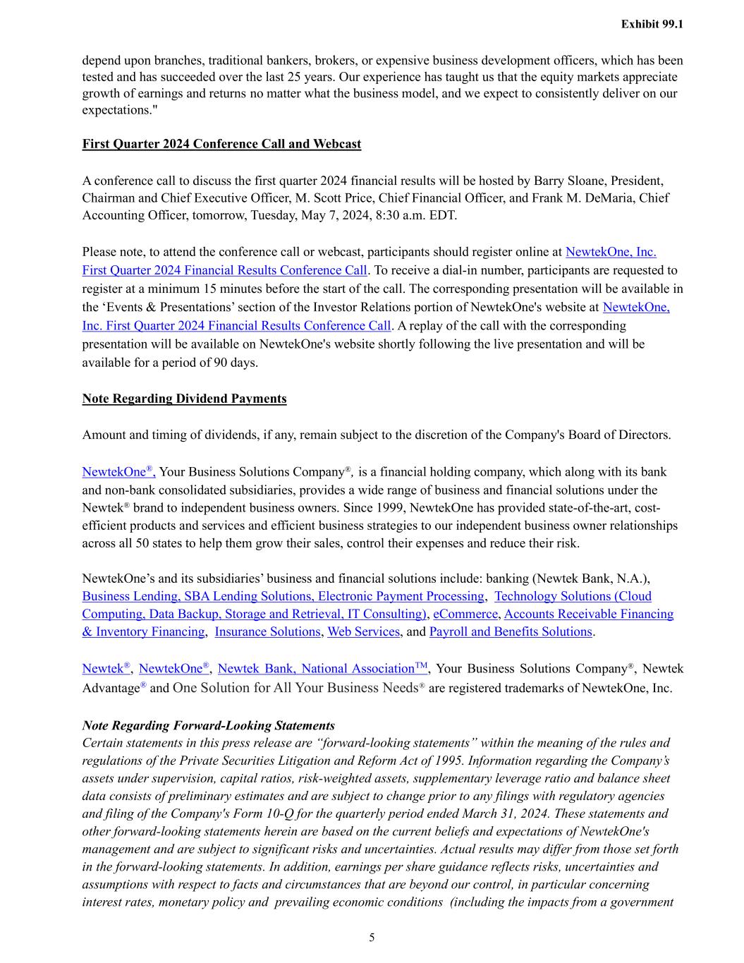 Exhibit 99.1 5 depend upon branches, traditional bankers, brokers, or expensive business development officers, which has been tested and has succeeded over the last 25 years. Our experience has taught us that the equity markets appreciate growth of earnings and returns no matter what the business model, and we expect to consistently deliver on our expectations." First Quarter 2024 Conference Call and Webcast A conference call to discuss the first quarter 2024 financial results will be hosted by Barry Sloane, President, Chairman and Chief Executive Officer, M. Scott Price, Chief Financial Officer, and Frank M. DeMaria, Chief Accounting Officer, tomorrow, Tuesday, May 7, 2024, 8:30 a.m. EDT. Please note, to attend the conference call or webcast, participants should register online at NewtekOne, Inc. First Quarter 2024 Financial Results Conference Call. To receive a dial-in number, participants are requested to register at a minimum 15 minutes before the start of the call. The corresponding presentation will be available in the ‘Events & Presentations’ section of the Investor Relations portion of NewtekOne's website at NewtekOne, Inc. First Quarter 2024 Financial Results Conference Call. A replay of the call with the corresponding presentation will be available on NewtekOne's website shortly following the live presentation and will be available for a period of 90 days. Note Regarding Dividend Payments Amount and timing of dividends, if any, remain subject to the discretion of the Company's Board of Directors. NewtekOne®, Your Business Solutions Company®, is a financial holding company, which along with its bank and non-bank consolidated subsidiaries, provides a wide range of business and financial solutions under the Newtek® brand to independent business owners. Since 1999, NewtekOne has provided state-of-the-art, cost- efficient products and services and efficient business strategies to our independent business owner relationships across all 50 states to help them grow their sales, control their expenses and reduce their risk. NewtekOne’s and its subsidiaries’ business and financial solutions include: banking (Newtek Bank, N.A.), Business Lending, SBA Lending Solutions, Electronic Payment Processing, Technology Solutions (Cloud Computing, Data Backup, Storage and Retrieval, IT Consulting), eCommerce, Accounts Receivable Financing & Inventory Financing, Insurance Solutions, Web Services, and Payroll and Benefits Solutions. Newtek®, NewtekOne®, Newtek Bank, National AssociationTM, Your Business Solutions Company®, Newtek Advantage® and One Solution for All Your Business Needs® are registered trademarks of NewtekOne, Inc. Note Regarding Forward-Looking Statements Certain statements in this press release are “forward-looking statements” within the meaning of the rules and regulations of the Private Securities Litigation and Reform Act of 1995. Information regarding the Company’s assets under supervision, capital ratios, risk-weighted assets, supplementary leverage ratio and balance sheet data consists of preliminary estimates and are subject to change prior to any filings with regulatory agencies and filing of the Company's Form 10-Q for the quarterly period ended March 31, 2024. These statements and other forward-looking statements herein are based on the current beliefs and expectations of NewtekOne's management and are subject to significant risks and uncertainties. Actual results may differ from those set forth in the forward-looking statements. In addition, earnings per share guidance reflects risks, uncertainties and assumptions with respect to facts and circumstances that are beyond our control, in particular concerning interest rates, monetary policy and prevailing economic conditions (including the impacts from a government