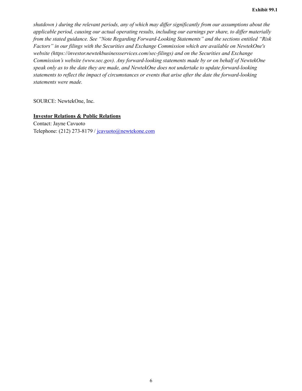 Exhibit 99.1 6 shutdown ) during the relevant periods, any of which may differ significantly from our assumptions about the applicable period, causing our actual operating results, including our earnings per share, to differ materially from the stated guidance. See “Note Regarding Forward-Looking Statements” and the sections entitled “Risk Factors” in our filings with the Securities and Exchange Commission which are available on NewtekOne's website (https://investor.newtekbusinessservices.com/sec-filings) and on the Securities and Exchange Commission’s website (www.sec.gov). Any forward-looking statements made by or on behalf of NewtekOne speak only as to the date they are made, and NewtekOne does not undertake to update forward-looking statements to reflect the impact of circumstances or events that arise after the date the forward-looking statements were made. SOURCE: NewtekOne, Inc. Investor Relations & Public Relations Contact: Jayne Cavuoto Telephone: (212) 273-8179 / jcavuoto@newtekone.com