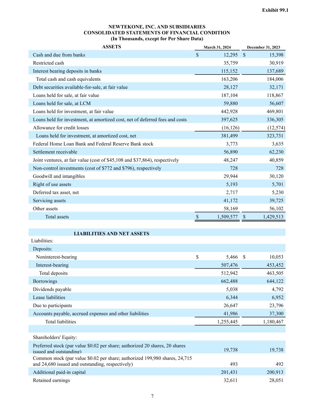 Exhibit 99.1 7 NEWTEKONE, INC. AND SUBSIDIARIES CONSOLIDATED STATEMENTS OF FINANCIAL CONDITION (In Thousands, except for Per Share Data) ASSETS March 31, 2024 December 31, 2023 Cash and due from banks $ 12,295 $ 15,398 Restricted cash 35,759 30,919 Interest bearing deposits in banks 115,152 137,689 Total cash and cash equivalents 163,206 184,006 Debt securities available-for-sale, at fair value 28,127 32,171 Loans held for sale, at fair value 187,104 118,867 Loans held for sale, at LCM 59,880 56,607 Loans held for investment, at fair value 442,928 469,801 Loans held for investment, at amortized cost, net of deferred fees and costs 397,625 336,305 Allowance for credit losses (16,126) (12,574) Loans held for investment, at amortized cost, net 381,499 323,731 Federal Home Loan Bank and Federal Reserve Bank stock 3,773 3,635 Settlement receivable 56,890 62,230 Joint ventures, at fair value (cost of $45,108 and $37,864), respectively 48,247 40,859 Non-control investments (cost of $772 and $796), respectively 728 728 Goodwill and intangibles 29,944 30,120 Right of use assets 5,193 5,701 Deferred tax asset, net 2,717 5,230 Servicing assets 41,172 39,725 Other assets 58,169 56,102 Total assets $ 1,509,577 $ 1,429,513 LIABILITIES AND NET ASSETS Liabilities: Deposits: Noninterest-bearing $ 5,466 $ 10,053 Interest-bearing 507,476 453,452 Total deposits 512,942 463,505 Borrowings 662,488 644,122 Dividends payable 5,038 4,792 Lease liabilities 6,344 6,952 Due to participants 26,647 23,796 Accounts payable, accrued expenses and other liabilities 41,986 37,300 Total liabilities 1,255,445 1,180,467 Shareholders' Equity: Preferred stock (par value $0.02 per share; authorized 20 shares, 20 shares issued and outstanding) 19,738 19,738 Common stock (par value $0.02 per share; authorized 199,980 shares, 24,715 and 24,680 issued and outstanding, respectively) 493 492 Additional paid-in capital 201,431 200,913 Retained earnings 32,611 28,051