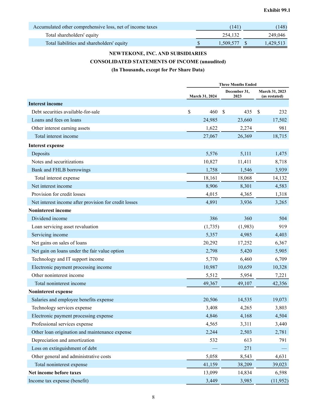 Exhibit 99.1 8 Accumulated other comprehensive loss, net of income taxes (141) (148) Total shareholders' equity 254,132 249,046 Total liabilities and shareholders' equity $ 1,509,577 $ 1,429,513 NEWTEKONE, INC. AND SUBSIDIARIES CONSOLIDATED STATEMENTS OF INCOME (unaudited) (In Thousands, except for Per Share Data) Three Months Ended March 31, 2024 December 31, 2023 March 31, 2023 (as restated) Interest income Debt securities available-for-sale $ 460 $ 435 $ 232 Loans and fees on loans 24,985 23,660 17,502 Other interest earning assets 1,622 2,274 981 Total interest income 27,067 26,369 18,715 Interest expense Deposits 5,576 5,111 1,475 Notes and securitizations 10,827 11,411 8,718 Bank and FHLB borrowings 1,758 1,546 3,939 Total interest expense 18,161 18,068 14,132 Net interest income 8,906 8,301 4,583 Provision for credit losses 4,015 4,365 1,318 Net interest income after provision for credit losses 4,891 3,936 3,265 Noninterest income Dividend income 386 360 504 Loan servicing asset revaluation (1,735) (1,983) 919 Servicing income 5,357 4,985 4,403 Net gains on sales of loans 20,292 17,252 6,367 Net gain on loans under the fair value option 2,798 5,420 5,905 Technology and IT support income 5,770 6,460 6,709 Electronic payment processing income 10,987 10,659 10,328 Other noninterest income 5,512 5,954 7,221 Total noninterest income 49,367 49,107 42,356 Noninterest expense Salaries and employee benefits expense 20,506 14,535 19,073 Technology services expense 3,408 4,265 3,803 Electronic payment processing expense 4,846 4,168 4,504 Professional services expense 4,565 3,311 3,440 Other loan origination and maintenance expense 2,244 2,503 2,781 Depreciation and amortization 532 613 791 Loss on extinguishment of debt — 271 — Other general and administrative costs 5,058 8,543 4,631 Total noninterest expense 41,159 38,209 39,023 Net income before taxes 13,099 14,834 6,598 Income tax expense (benefit) 3,449 3,985 (11,952)