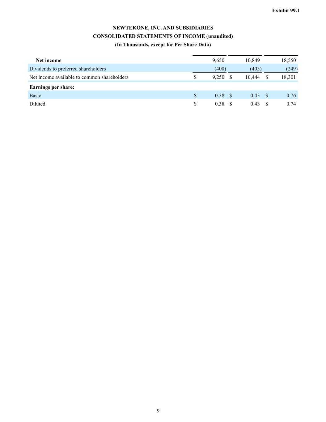 Exhibit 99.1 9 NEWTEKONE, INC. AND SUBSIDIARIES CONSOLIDATED STATEMENTS OF INCOME (unaudited) (In Thousands, except for Per Share Data) Net income 9,650 10,849 18,550 Dividends to preferred shareholders (400) (405) (249) Net income available to common shareholders $ 9,250 $ 10,444 $ 18,301 Earnings per share: Basic $ 0.38 $ 0.43 $ 0.76 Diluted $ 0.38 $ 0.43 $ 0.74