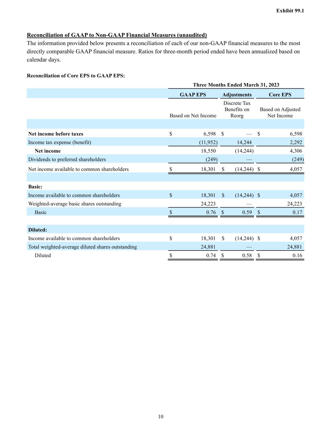 Exhibit 99.1 10 Reconciliation of GAAP to Non-GAAP Financial Measures (unaudited) The information provided below presents a reconciliation of each of our non-GAAP financial measures to the most directly comparable GAAP financial measure. Ratios for three-month period ended have been annualized based on calendar days. Reconciliation of Core EPS to GAAP EPS: Three Months Ended March 31, 2023 GAAP EPS Adjustments Core EPS Based on Net Income Discrete Tax Benefits on Reorg Based on Adjusted Net Income Net income before taxes $ 6,598 $ — $ 6,598 Income tax expense (benefit) (11,952) 14,244 2,292 Net income 18,550 (14,244) 4,306 Dividends to preferred shareholders (249) — (249) Net income available to common shareholders $ 18,301 $ (14,244) $ 4,057 Basic: Income available to common shareholders $ 18,301 $ (14,244) $ 4,057 Weighted-average basic shares outstanding 24,223 — 24,223 Basic $ 0.76 $ 0.59 $ 0.17 Diluted: Income available to common shareholders $ 18,301 $ (14,244) $ 4,057 Total weighted-average diluted shares outstanding 24,881 — 24,881 Diluted $ 0.74 $ 0.58 $ 0.16