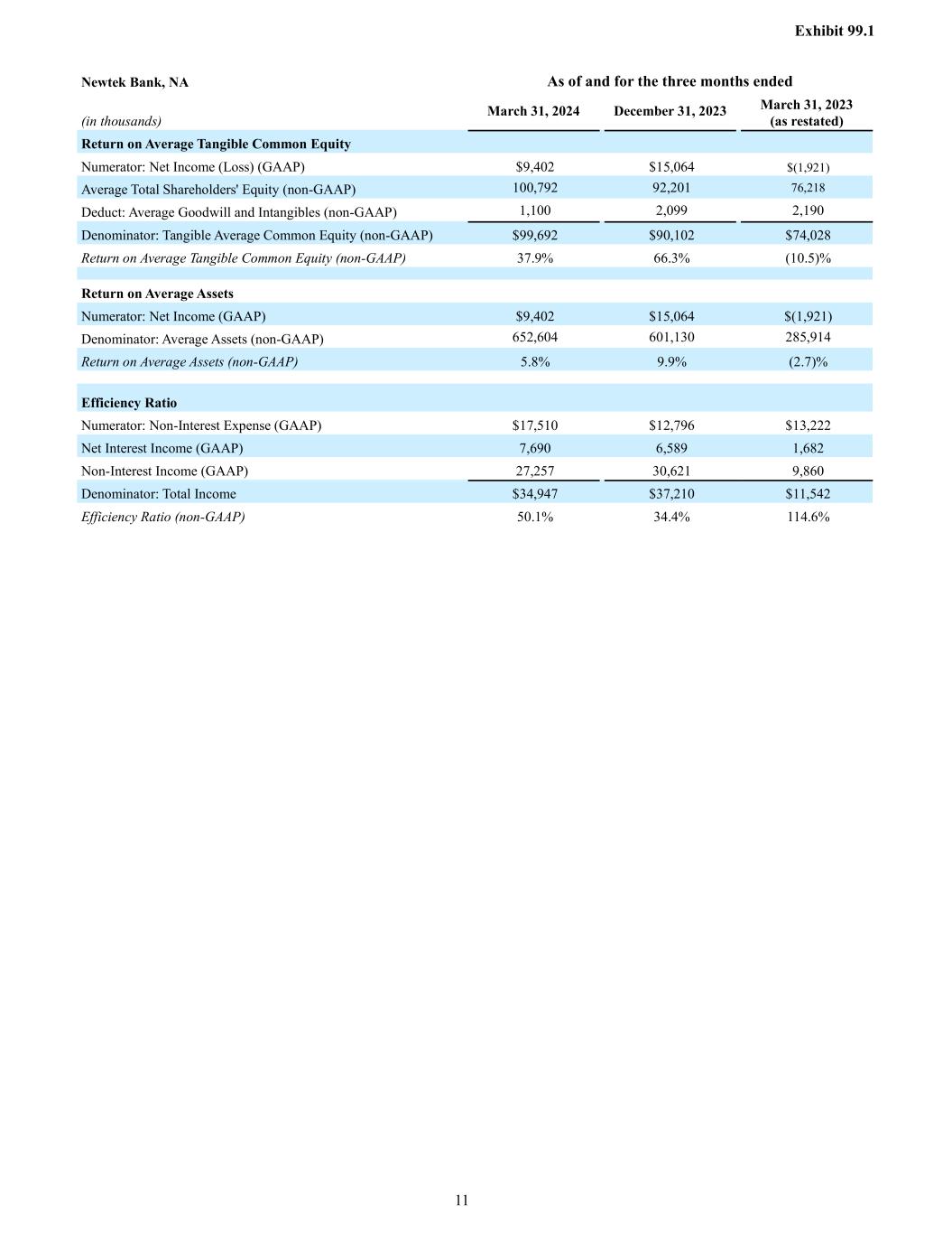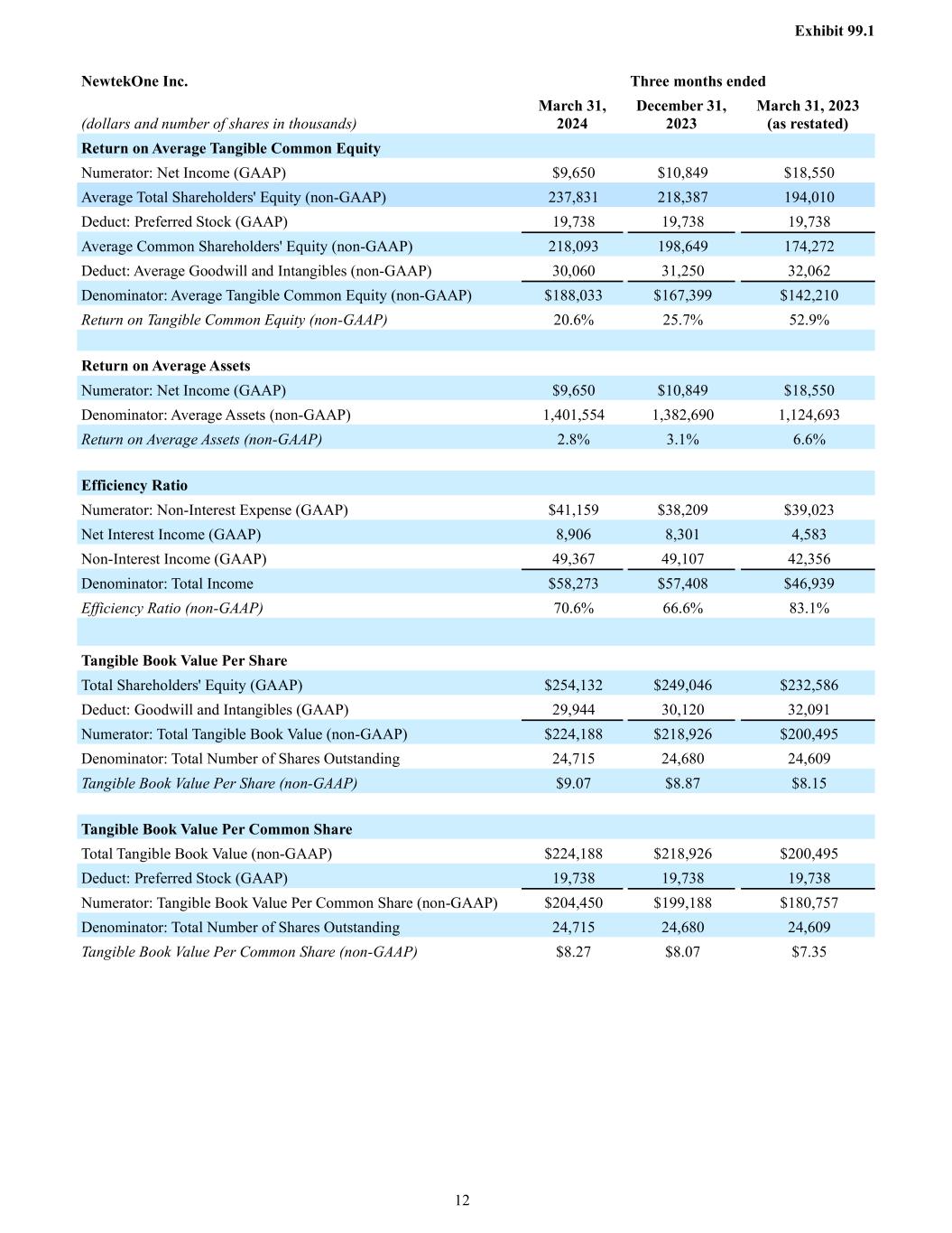 Exhibit 99.1 12 NewtekOne Inc. Three months ended (dollars and number of shares in thousands) March 31, 2024 December 31, 2023 March 31, 2023 (as restated) Return on Average Tangible Common Equity Numerator: Net Income (GAAP) $9,650 $10,849 $18,550 Average Total Shareholders' Equity (non-GAAP) 237,831 218,387 194,010 Deduct: Preferred Stock (GAAP) 19,738 19,738 19,738 Average Common Shareholders' Equity (non-GAAP) 218,093 198,649 174,272 Deduct: Average Goodwill and Intangibles (non-GAAP) 30,060 31,250 32,062 Denominator: Average Tangible Common Equity (non-GAAP) $188,033 $167,399 $142,210 Return on Tangible Common Equity (non-GAAP) 20.6% 25.7% 52.9% Return on Average Assets Numerator: Net Income (GAAP) $9,650 $10,849 $18,550 Denominator: Average Assets (non-GAAP) 1,401,554 1,382,690 1,124,693 Return on Average Assets (non-GAAP) 2.8% 3.1% 6.6% Efficiency Ratio Numerator: Non-Interest Expense (GAAP) $41,159 $38,209 $39,023 Net Interest Income (GAAP) 8,906 8,301 4,583 Non-Interest Income (GAAP) 49,367 49,107 42,356 Denominator: Total Income $58,273 $57,408 $46,939 Efficiency Ratio (non-GAAP) 70.6% 66.6% 83.1% Tangible Book Value Per Share Total Shareholders' Equity (GAAP) $254,132 $249,046 $232,586 Deduct: Goodwill and Intangibles (GAAP) 29,944 30,120 32,091 Numerator: Total Tangible Book Value (non-GAAP) $224,188 $218,926 $200,495 Denominator: Total Number of Shares Outstanding 24,715 24,680 24,609 Tangible Book Value Per Share (non-GAAP) $9.07 $8.87 $8.15 Tangible Book Value Per Common Share Total Tangible Book Value (non-GAAP) $224,188 $218,926 $200,495 Deduct: Preferred Stock (GAAP) 19,738 19,738 19,738 Numerator: Tangible Book Value Per Common Share (non-GAAP) $204,450 $199,188 $180,757 Denominator: Total Number of Shares Outstanding 24,715 24,680 24,609 Tangible Book Value Per Common Share (non-GAAP) $8.27 $8.07 $7.35